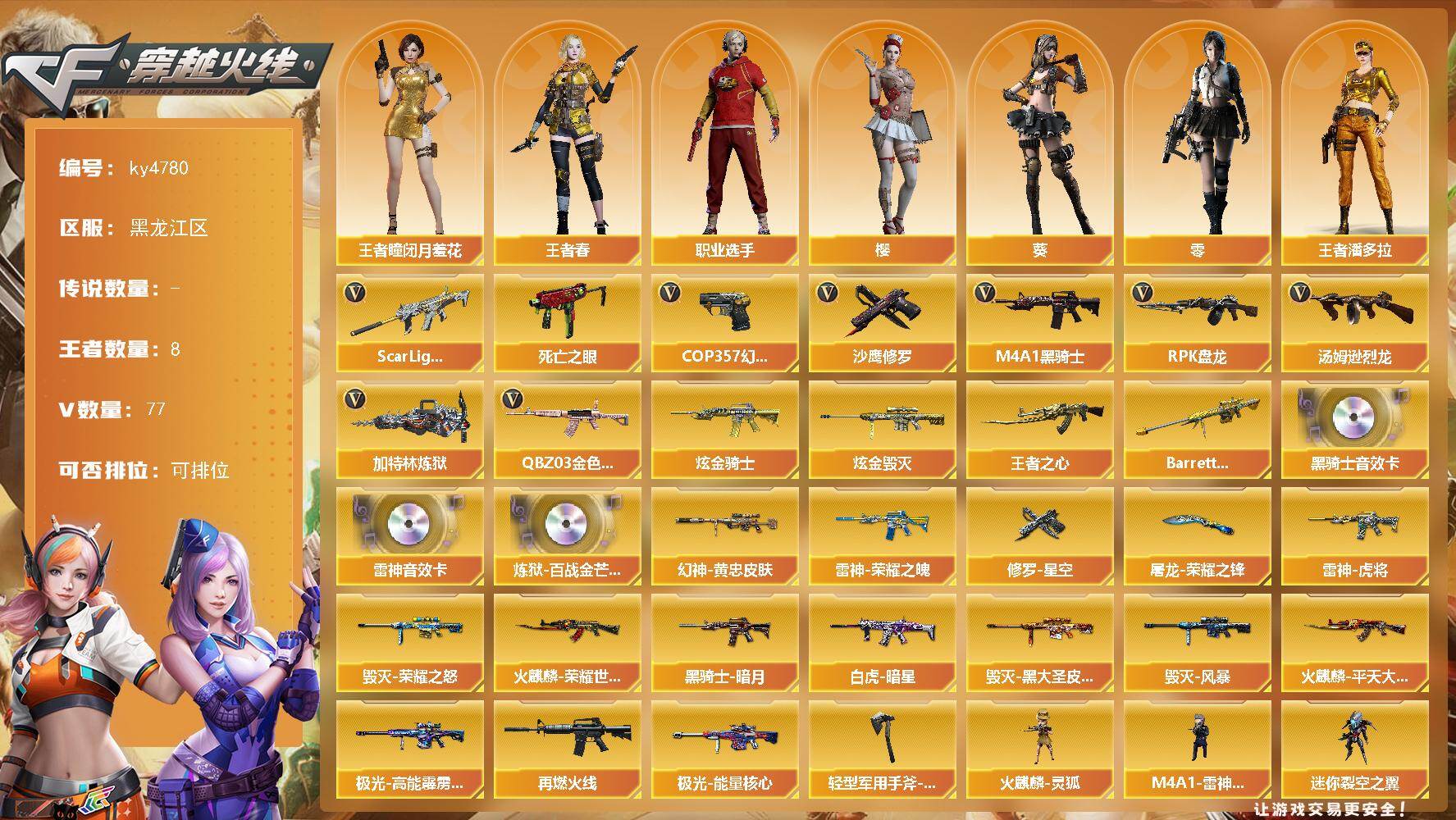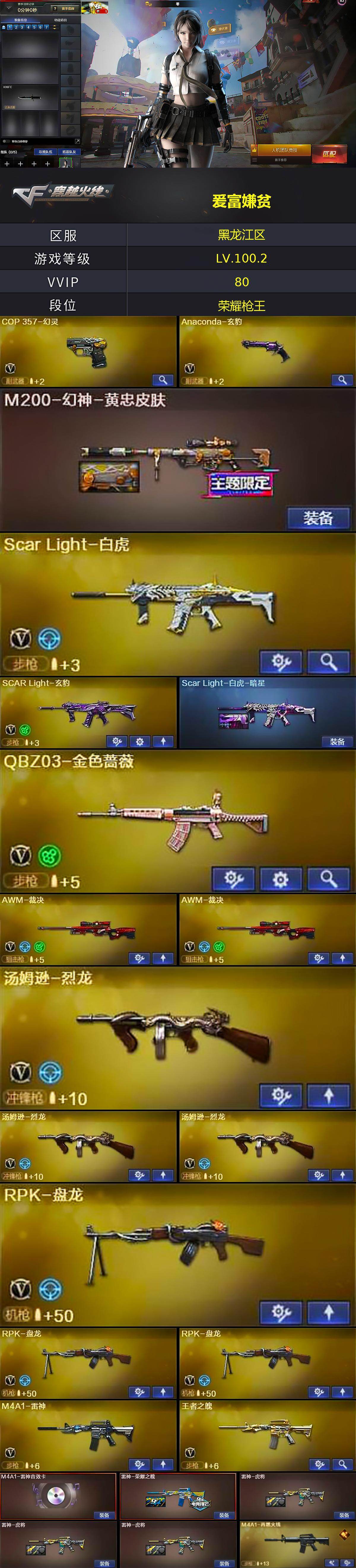 [15459964]黑龙江区-77V-8王者-2炫金 【热门武器】:QBZ03-金色蔷薇,Scar Light-白虎,死亡之眼,M4A1-黑骑士,汤姆逊-烈龙*3,RPK-盘龙*3,加特林-炼狱*2,COP 357-幻灵,沙鹰-修罗*2 【王者炫金武器】:王者之心,Barrett-雷霆王者,炫金骑士,炫金毁灭 【音效卡】:M4A1-雷神音效卡,M4A1-黑骑士音效卡,炼狱-百战金芒-庆典舞曲音效卡 【皮肤】:M200-幻神-黄忠皮肤,Scar Light-白虎-暗星,雷神-荣耀之魄,雷神-虎将*3,M4A1-再燃火线,火麒麟-平天大圣,火麒麟-荣耀世冠AG,毁灭-荣耀之怒,毁灭-黑大圣皮肤,毁灭-风暴,黑骑士-暗月,极光-能量核心,极光-高能霹雳 皮肤,修罗-星空,屠龙-荣耀之锋,轻型军用手斧-再燃火线 【角色】:零,葵,樱,荆棘,战地猎狐,王者-瞳-闭月羞花,王者春,王者潘多拉,雪域霜狐,修道士,北极狐-X,初恋灵狐,风暴女,娟娟,灵狐者-黄金海岸,潘多拉-X,青霞仙子,蜀雪,职业选手,雅典娜 【人偶武器】:火麒麟-灵狐,M4A1-雷神-精英刀锋,迷你救赎猎手,异变清道夫-蛇影双骄,迷你裂空之翼*2,迷你牛魔王,夺魂 【暴走生化】:双面神,死亡之眼,超级对讲机 【挑战大师】:神圣爆裂者III,激光毁灭者III,阐释者III 【英雄级武器】:AK47-火麒麟*2,M4A1-黑龙,M4A1-雷神,M4A1-黑骑士,M4A1-死神,AK47-黑武士,AK12-天启,AK47-黑鲨,Scar Light-白虎,SCAR Light-玄豹,QBZ03-金色蔷薇,王者之心-觉醒版,王者之魄-觉醒版,王者之势-觉醒版,黑骑士-海王,AWM-天龙,Barrett-毁灭,AWM-裁决*2,RPK-盘龙*3,加特林-炼狱*2,炼狱-百战金芒,汤姆逊-烈龙*3,AA-12-雷霆,沙鹰-修罗*2,沙鹰-天神,COP 357-幻灵,Anaconda-玄豹,王者之灵-觉醒版,屠龙*2,龙啸*4,麒麟刺*3,幻灵之锋,擎天-竞技荣光,麒麟刺-百战金芒,王者之啸-觉醒版,丛林匕首-玄豹,高爆手雷-幻灵,高爆手雷-竞技荣光,高爆手雷-玄豹*5,闪光弹-幻灵*3,闪光弹-竞技荣光,闪光弹-玄豹*3,烟雾弹-幻灵,烟雾弹-竞技荣光*2,烟雾弹-玄豹*3,M4A1-赤狱骑士,M4A1-苍鸣雷神 【道具】:BS战队炫彩背包