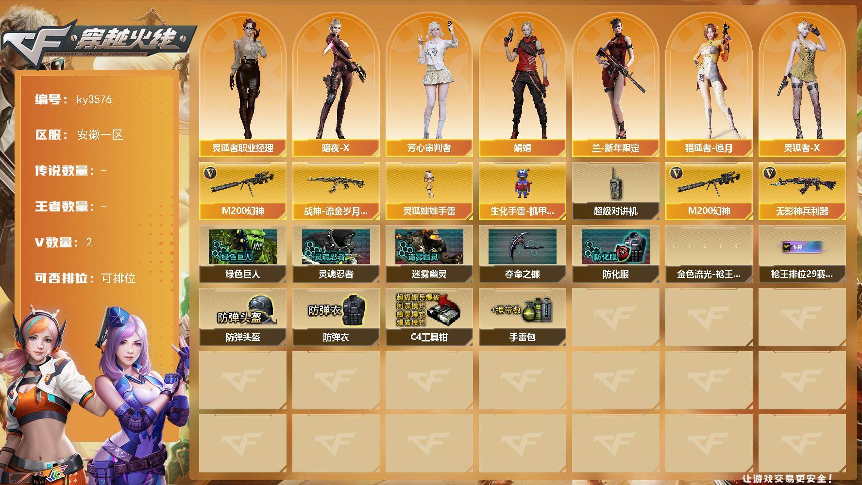 [15460211]安徽一区-2V-0王者-0炫金 【热门武器】:M200-幻神 【皮肤】:战神-流金岁月皮肤 【角色】:暗夜-X,芳心审判者,娟娟,兰-新年限定,猎狐者-追月,灵狐者-X,灵狐者-职业经理,潘多拉-X,蛇姬,维纳斯,夜玫瑰-宠粉 【人偶武器】:生化手雷-机甲核心*2,灵狐娃娃手雷 【暴走生化】:超级对讲机 【英雄级武器】:无影-神兵利器,M200-幻神 【道具】:绿色巨人,灵魂忍者,迷雾幽灵,夺命之镰,防化服*2,金色流光-枪王排位*2,星辰流光-枪王排位,枪王排位28赛季金色流光,枪王排位29赛季金色流光,防弹头盔*3,防弹衣*3,C4工具钳*2,手雷包*2 【特殊枪械】: