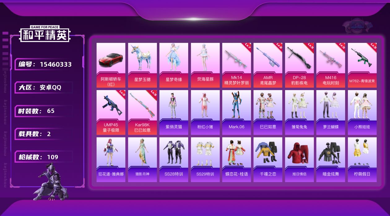 [15460333]地铁满天赋安卓 手Q-2粉装-7特效枪-2载具-5粉色飞行器-34086热力值-5王牌印记-65套装-109枪皮【热门品类】:套装-粉红小猪,角色-Mark.06【粉色套装】:角色-星梦奇缘,角色-荧海星豚【粉色枪皮等级】:M416-电玩时刻(五级),M762-青锋波束(五级),UMP45-量子极限(五级),Kar98K-巳巳如意(五级),Mk14-精灵梦叶罗丽(七级),AMR-鸢尾晶梦(六级),DP-28-豹影疾电(五级)【粉色载具】:阿斯顿马丁DBS(红),星梦玉骢【粉色枪皮】:M416-电玩时刻,M762-青锋波束,UMP45-量子极限,Kar98K-巳巳如意,Mk14-精灵梦叶罗丽,AMR-鸢尾晶梦,DP-28-豹影疾电【粉色飞行器】:星夜魔法师飞行翼,千面幻镜飞行器,霓虹漫游飞行器,电糖天使飞行器