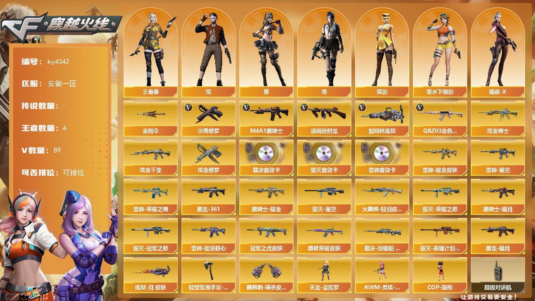 [15247528]安徽一区-89V-4王者-3炫金 【热门武器】:QBZ03-金色蔷薇,M4A1-黑骑士*2,汤姆逊-烈龙*5,加特林-炼狱,沙鹰-修罗*6,金刚伞 【王者炫金武器】:炫金骑士,炫金千变,炫金修罗 【音效卡】:M4A1-雷神音效卡,Barrett-毁灭音效卡,AWM-裁决音效卡 【皮肤】:ScarLight-白虎-冠军之虎皮肤*2,QBZ03-巅峰荣耀皮肤*2,裁决-运输船 皮肤,雷神-能量核心,雷神-荣耀之魄,雷神-星空,雷神-耀金皮肤,火麒麟-轻羽皮肤,毁灭-荣耀之怒,毁灭-星空,毁灭-冠军之怒,毁灭-英雄计划 皮肤,黑龙-暗月,M4A1-黑龙-361,黑骑士-暗月,黑骑士耀金皮肤,炼狱-月 皮肤,轻型军用手斧-再燃火线,麒麟刺-萌杀皮肤 【角色】:零,葵,炫,王者春,狐影,暗夜-X,嘉年华灵狐,兰-海滩派对,零-水下丽影,灵狐-花神,萌儿,潘多拉-X,潘多拉-甜心教官,斯沃特-X,新娜塔莎 【人偶武器】:天龙-曼陀罗,AWM-灵狐-15周年嘉年华,COP-旗袍 【暴走生化】:超级对讲机 【挑战大师】:神圣爆裂者-末日III 【英雄级武器】:AK47-火麒麟*3,M4A1-黑龙,M4A1-雷神*2,M4A1-黑骑士*2,AK47-无影*3,M4A1-死神,AK47-黑武士,AN94-超新星,M4A1-武圣*3,M4A1-雷霆,无影-神兵利器,QBZ03-金色蔷薇,M4A1-猎神*3,王者之翼-觉醒版,白虎之魄-觉醒版,AWM-天龙,Barrett-毁灭*3,Barrett-极光*2,AWM-裁决,Barrett-金色蔷薇,加特林-炼狱,汤姆逊-烈龙*5,沙鹰-修罗*6,沙鹰-天神,COP-雷霆,Glock18-武圣,屠龙*3,龙啸,擎天*2,麒麟刺*3,麒麟刺-百战金芒,高爆手雷-雷霆*8,闪光弹-雷霆*8,烟雾弹-雷霆*8,烟雾弹-神工天巧 【道具】:神秘礼盒背包,CFS限定背包,炫彩背包,百战金芒炫彩背包,哔哩哔哩名片,女皇终结者-魔龙之吻,绿色巨人,灵魂忍者,迷雾幽灵,夺命之镰,防化服*2,金色流光-枪王排位*2,星辰流光-枪王排位,流光-鎏金之域,枪王排位28赛季金色流光,语音特效-盛典烟火,萌萌小葵表情,CFPL选手表情-第1套,防弹头盔*2,防弹衣*3,C4工具钳*3,手雷包*3 【特殊枪械】:2黑骑士,5烈龙,1炼狱