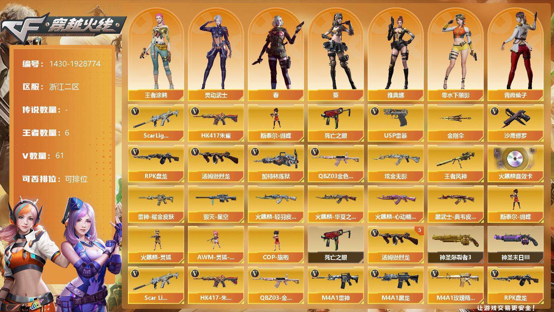 [15470461]浙江二区-61V-6王者-1炫金 【热门武器】:QBZ03-金色蔷薇,Scar Light-白虎,HK417-朱雀,死亡之眼,汤姆逊-烈龙*5,RPK-盘龙,加特林-炼狱,斯泰尔-蝴蝶,USP-雷暴,沙鹰-修罗,金刚伞 【王者炫金武器】:王者风神,炫金无影 【音效卡】:AK47-火麒麟音效卡 【皮肤】:雷神-耀金皮肤,火麒麟-华夏之心,火麒麟-轻羽皮肤,火麒麟-心动糖果,毁灭-星空,黑武士-典