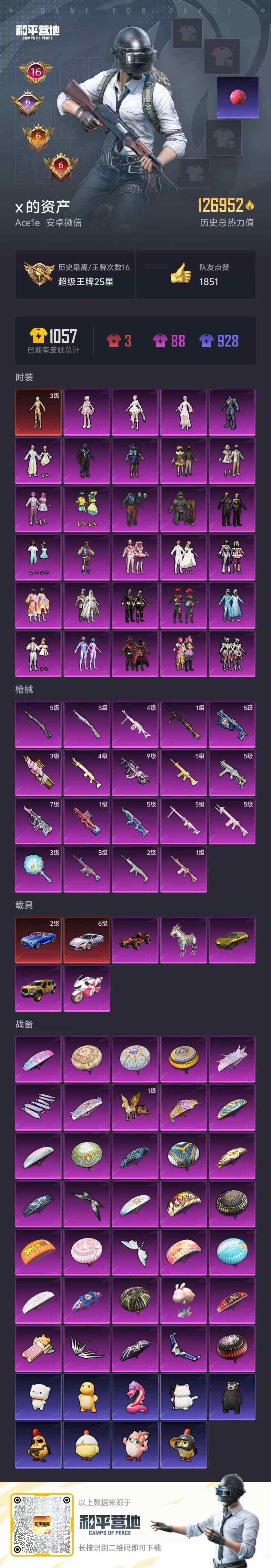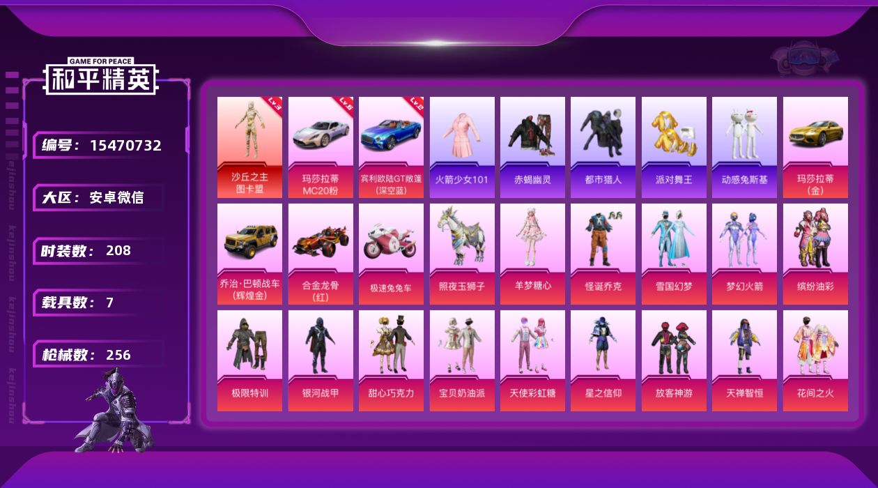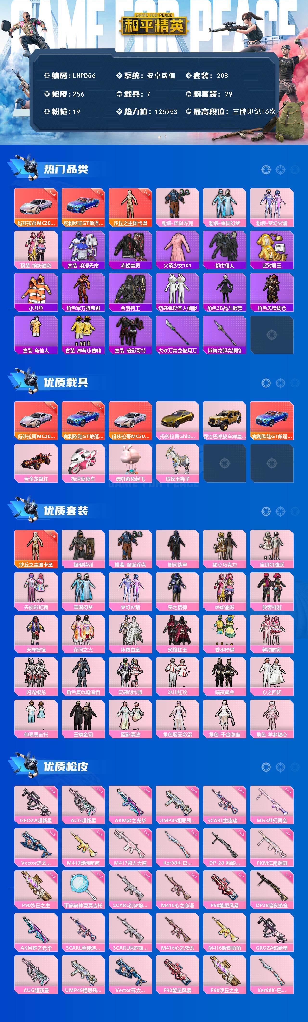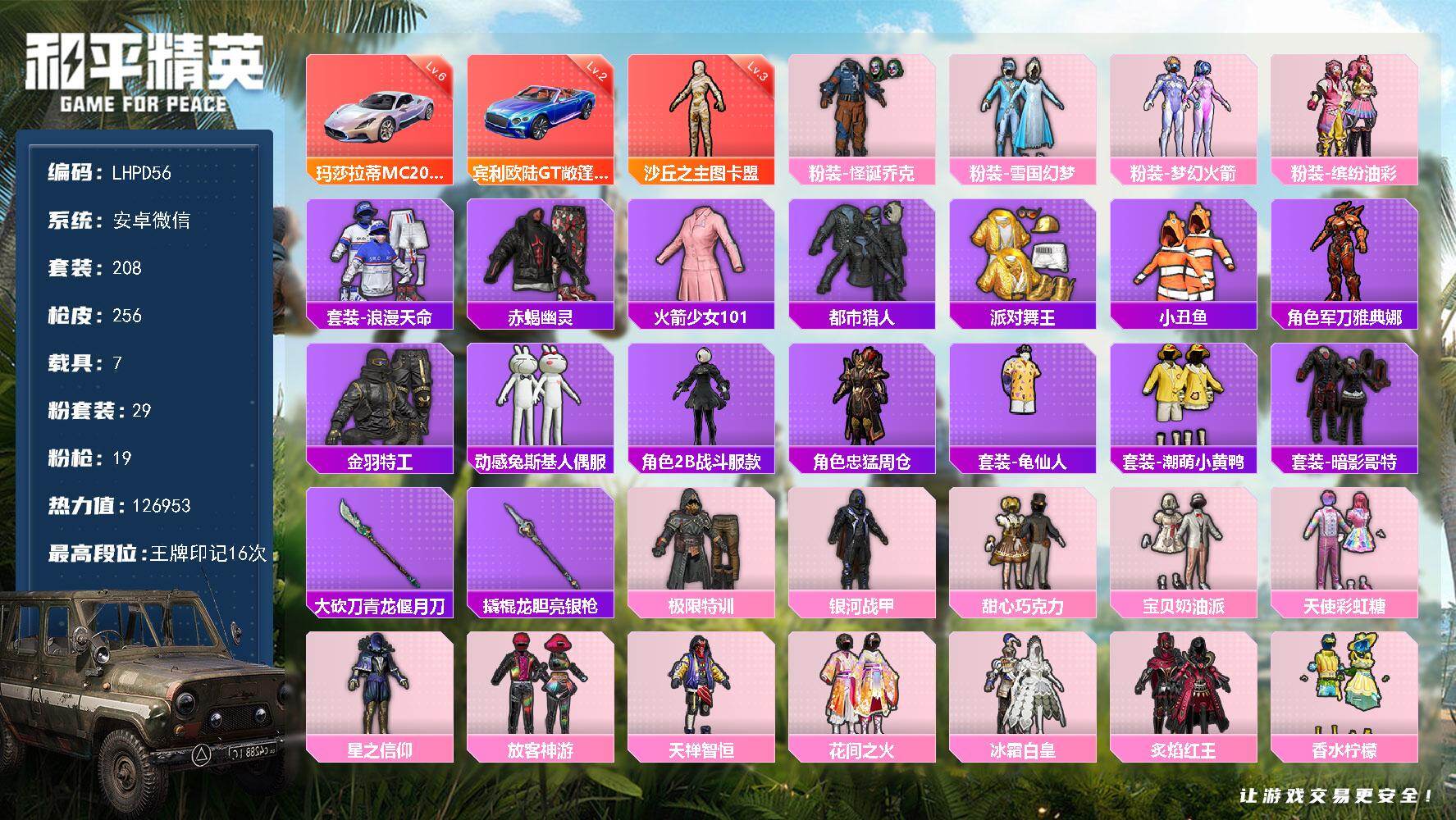 [15470732]安卓 微信-1神装-29粉装-19特效枪-7载具-7粉色飞行器-126953热力值-16王牌印记-208套装-256枪皮