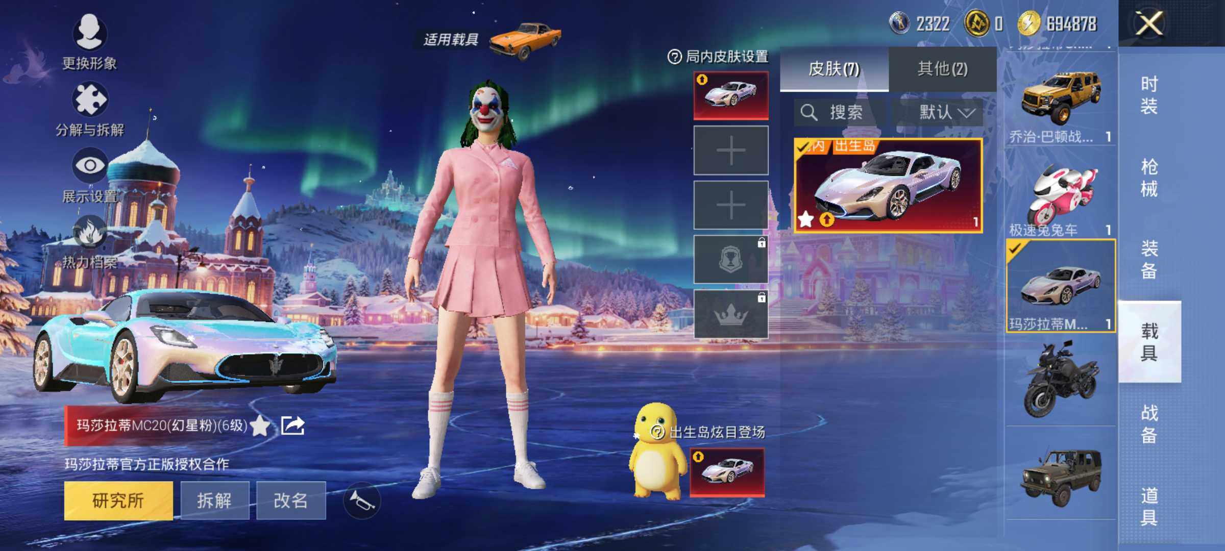 【粉色载具】:玛莎拉蒂MC20(幻星粉),玛莎拉蒂Ghibli(金),乔治巴顿战车(辉煌金),宾利欧陆GT敞篷(深空蓝),合金龙骨(红),极速兔兔车,僚机-萌兔起飞,照夜玉狮子