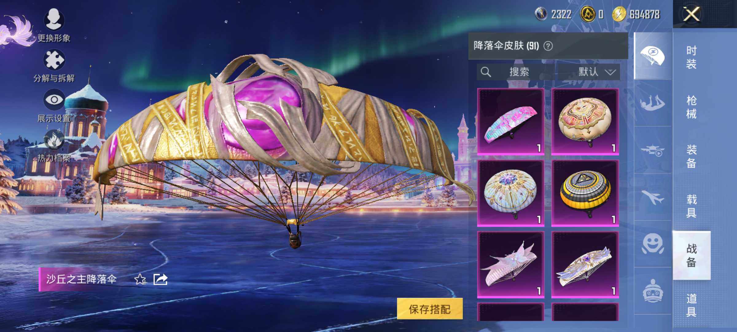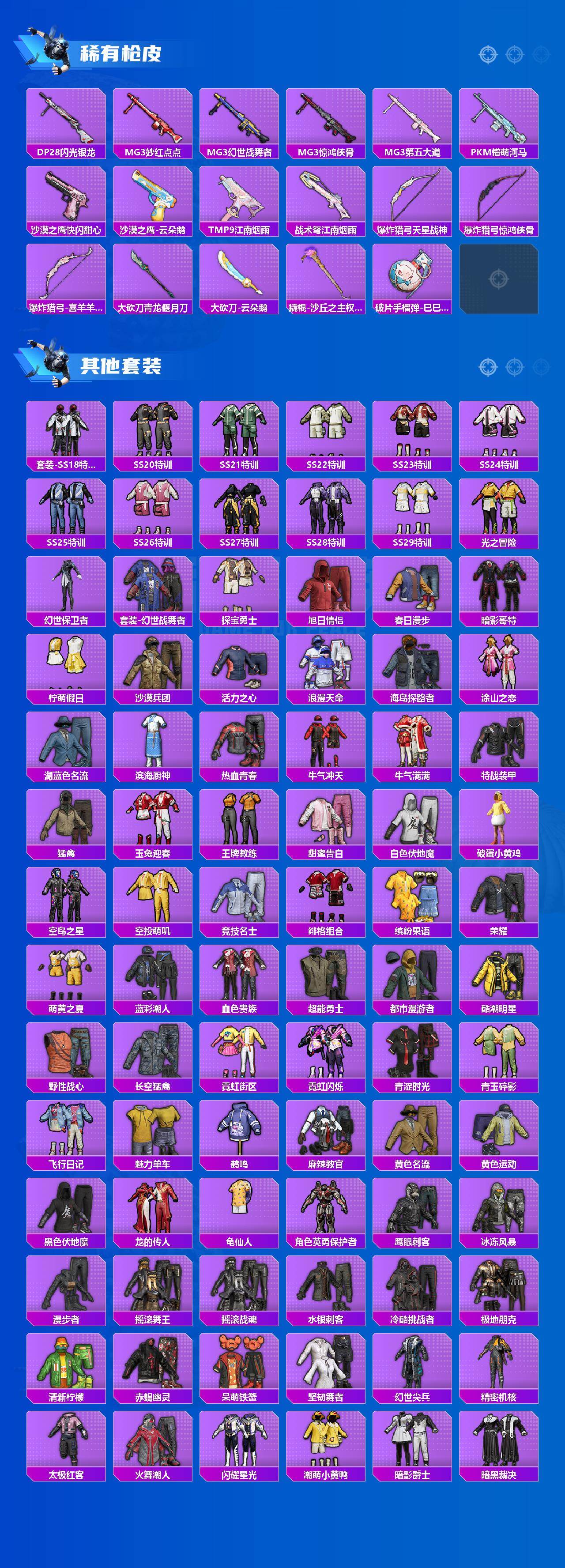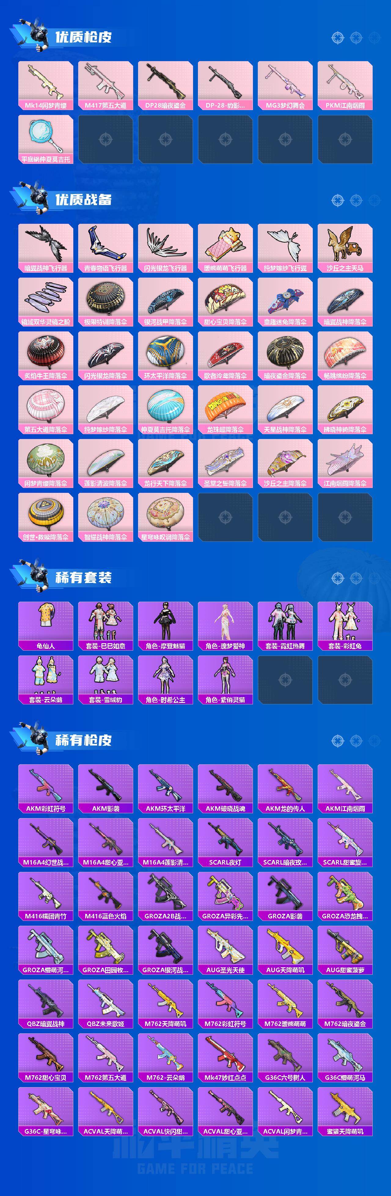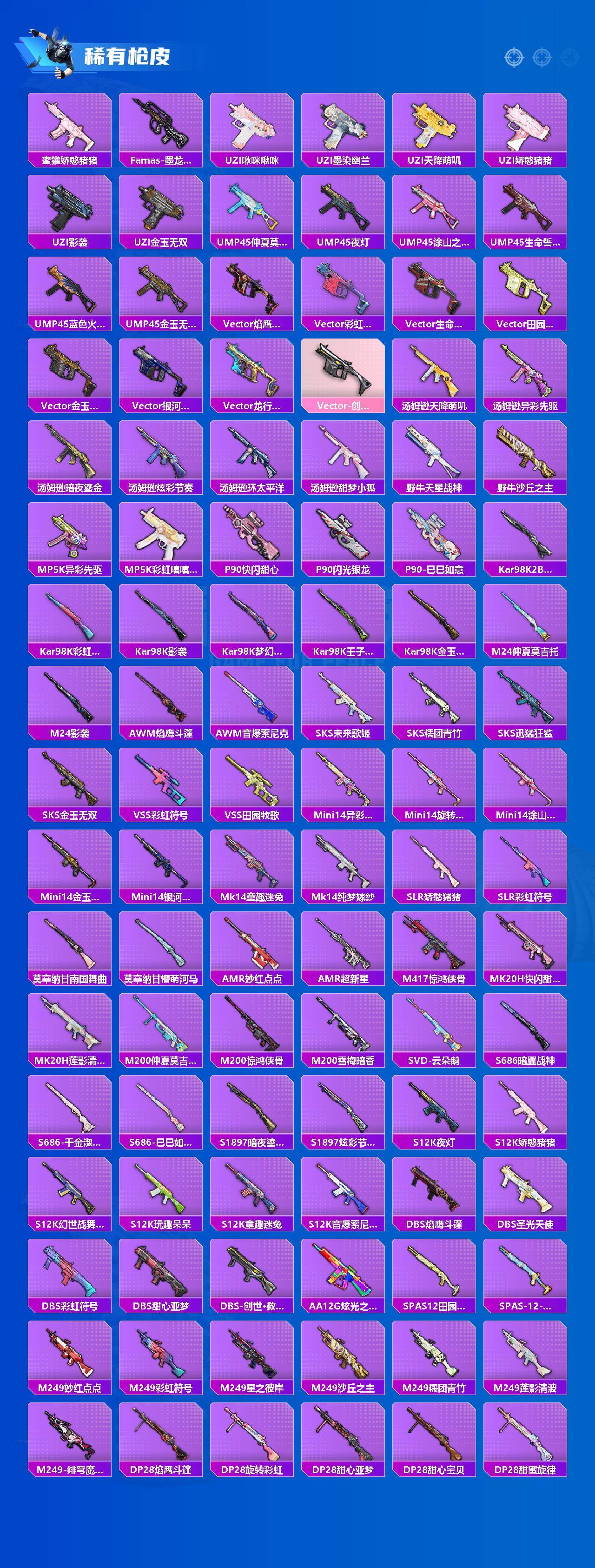 AKM-梦之光华,SCAR-L-童趣迷兔,SCAR-L-纯梦嫁纱,M416-心之恋语,M416-暖熊萌萌,GROZA-超新星,AUG-超新星,UMP45-相思残雪,Vector-环太平洋,P90-能量风暴,P90-沙丘之主,Kar98K-巳巳如意,Mk14-闲梦青缨,M417-第五大道,DP-28-暗夜鎏金,MG3-梦幻舞会,PKM-江南烟雨,平底锅-仲夏莫吉托