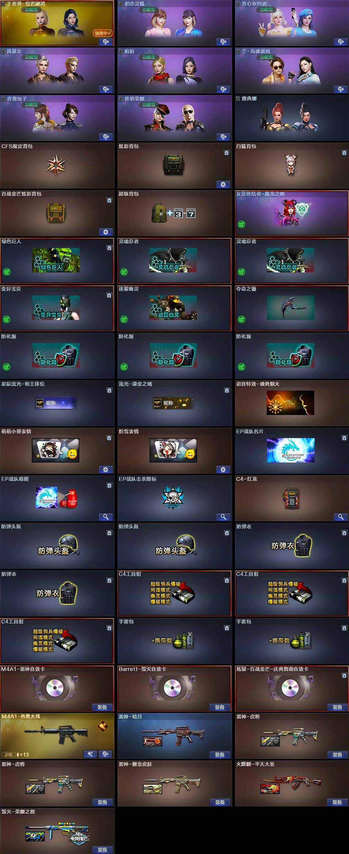 【道具】:CFS限定背包,炫彩背包,白狐背包,百战金芒炫彩背包,超级背包,女皇终结者-魔龙之吻,绿色巨人,灵魂忍者*2,变异宝贝,迷雾幽灵,夺命之镰,防化服*3,星辰流光-枪王排位,流光-鎏金之域,语音特效-盛典烟火,萌萌小葵表情,炽雪表情,EP战队名片,EP战队喷图,EP战队击杀图标,C4-红龙,防弹头盔*2,防弹衣*2,C4工具钳*3,手雷包*2