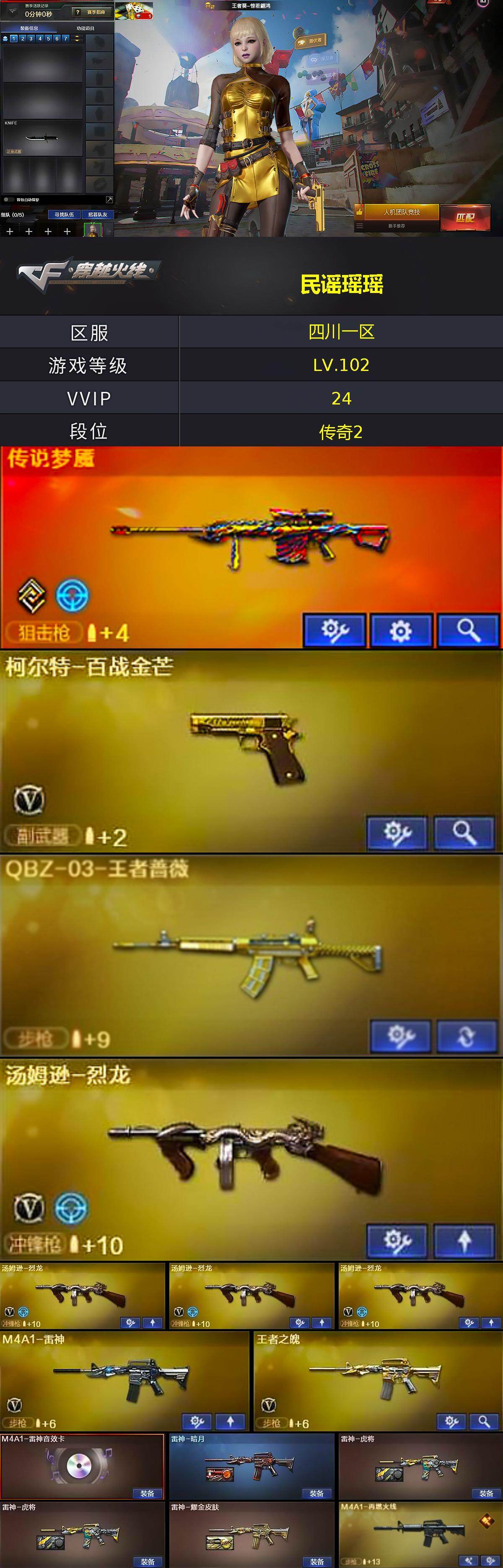 - [12216387]总资产:103.2M 1传说枪械 哈夫币:7.018K 可二次 可修改实名 烽火地带段位:青铜 全面战场段位:无段位 传说武器皮肤:CAR-15突击步枪-阿米娅 史诗武器皮肤:M250通用机枪-囚徒,SV-98狙击步枪-林中猎手,SV-98狙击步枪-囚徒