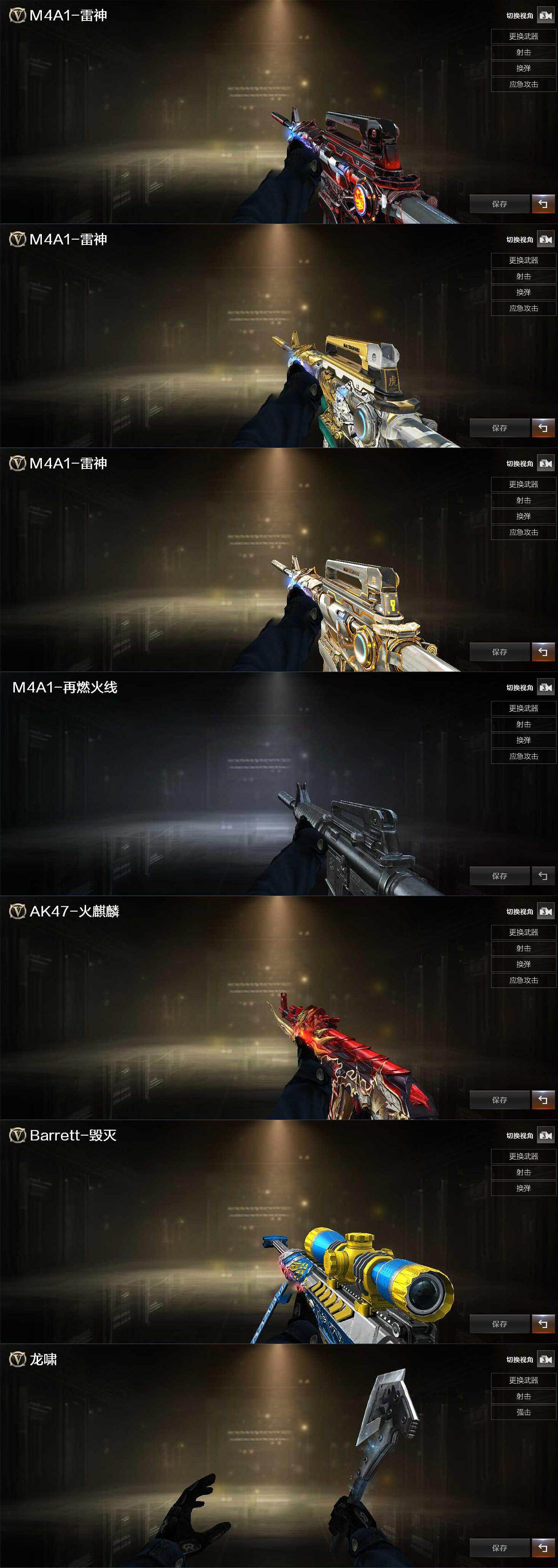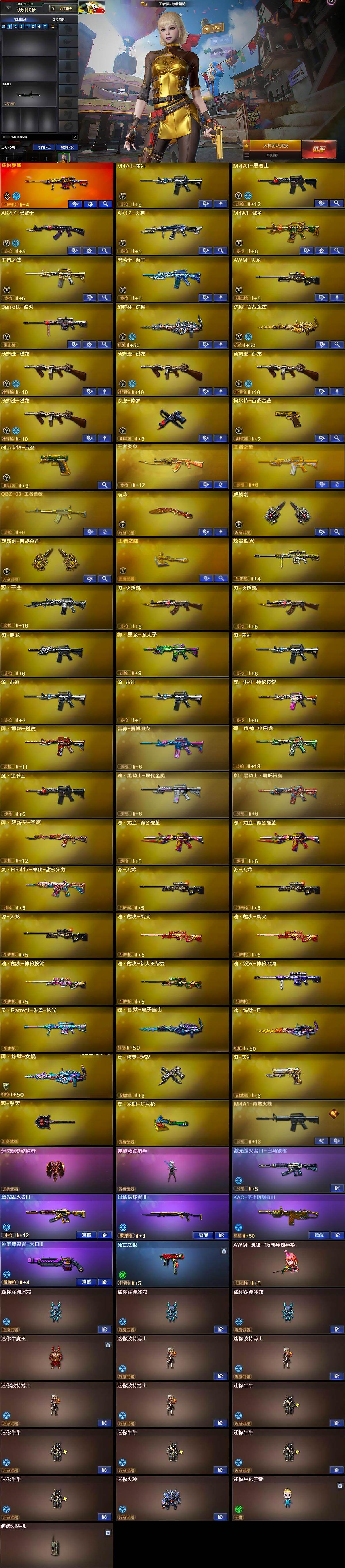 【英雄级武器】:M4A1-雷神,M4A1-黑骑士,AK47-黑武士,AK12-天启,M4A1-武圣,王者之魄-觉醒版,黑骑士-海王,AWM-天龙,Barrett-毁灭,加特林-炼狱,炼狱-百战金芒,汤姆逊-烈龙*4,沙鹰-修罗,柯尔特-百战金芒,Glock18-武圣,屠龙,麒麟刺,麒麟刺-百战金芒,王者之啸-觉醒版