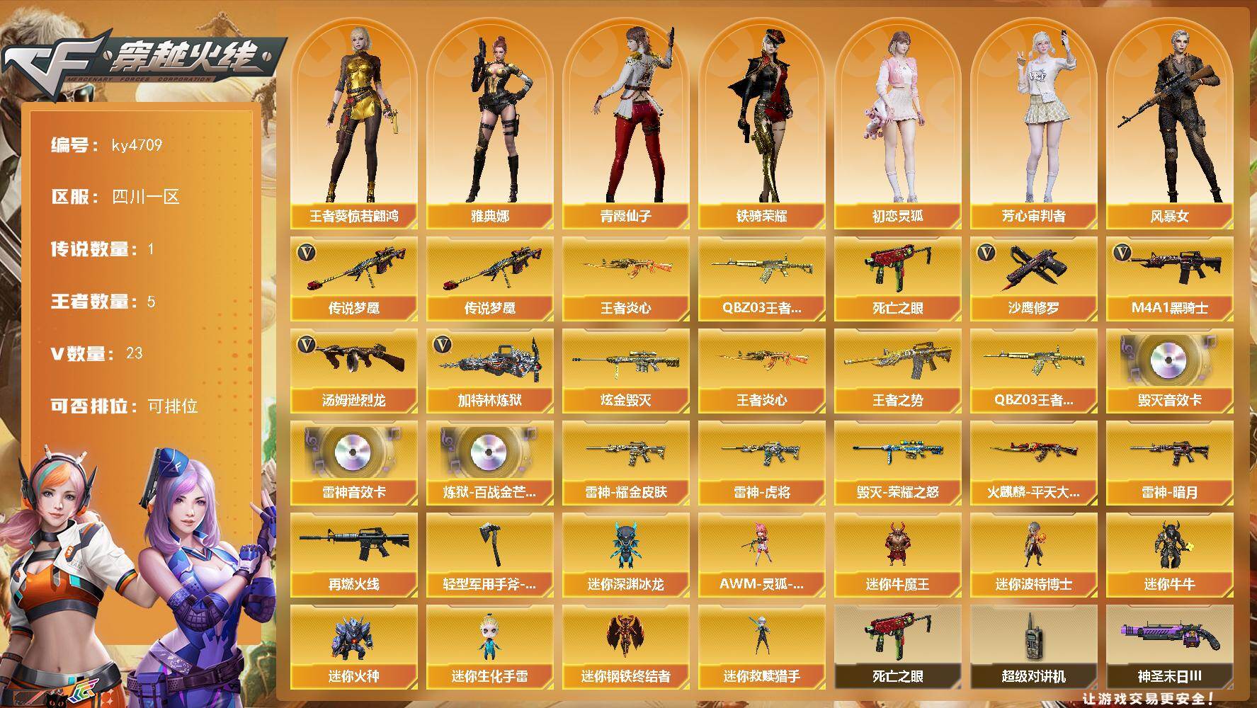 [15350071]四川一区-23V-5王者-1炫金 【传说武器】:传说梦魇 【热门武器】:传说梦魇,QBZ-03-王者蔷薇,死亡之眼,王者炎心,M4A1-黑骑士,汤姆逊-烈龙*4,加特林-炼狱,沙鹰-修罗 【王者炫金武器】:王者炎心,王者之势,QBZ-03-王者蔷薇,炫金毁灭 【音效卡】:M4A1-雷神音效卡,Barrett-毁灭音效卡,炼狱-百战金芒-庆典舞曲音效卡 【皮肤】:雷神-暗月,雷神-虎将*2,雷神-耀金皮肤,M4A1-再燃火线,火麒麟-平天大圣,毁灭-荣耀之怒,轻型军用手斧-再燃火线 【角色】:王者葵-惊若翩鸿,初恋灵狐,芳心审判者,风暴女,娟娟,兰-海滩派对,兰-新年限定,青霞仙子,铁骑荣耀,雅典娜 【人偶武器】:迷你钢铁终结者,迷你救赎猎手,AWM-灵狐-15周年嘉年华,迷你深渊冰龙*3,迷你牛魔王,迷你波特博士*4,迷你牛牛*5,迷你火种,迷你生化手雷 【暴走生化】:死亡之眼,超级对讲机 【挑战大师】:激光毁灭者III-白马银枪,激光毁灭者III,试炼破坏者III,KAC-圣炎切割者III,神圣爆裂者-末日III 【英雄级武器】:M4A1-雷神,M4A1-黑骑士,AK47-黑武士,AK12-天启,M4A1-武圣,王者之魄-觉醒版,黑骑士-海王,AWM-天龙,Barrett-毁灭,加特林-炼狱,炼狱-百战金芒,汤姆逊-烈龙*4,沙鹰-修罗,柯尔特-百战金芒,Glock18-武圣,屠龙,麒麟刺,麒麟刺-百战金芒,王者之啸-觉醒版 【道具】:CFS限定背包,炫彩背包,白狐背包,百战金芒炫彩背包,超级背包,女皇终结者-魔龙之吻,绿色巨人,灵魂忍者*2,变异宝贝,迷雾幽灵,夺命之镰,防化服*3,星辰流光-枪王排位,流光-鎏金之域,语音特效-盛典烟火,萌萌小葵表情,炽雪表情,EP战队名片,EP战队喷图,EP战队击杀图标,C4-红龙,防弹头盔*2,防弹衣*2,C4工具钳*3,手雷包*2 【特殊枪械】:1黑骑士,4烈龙,1炼狱