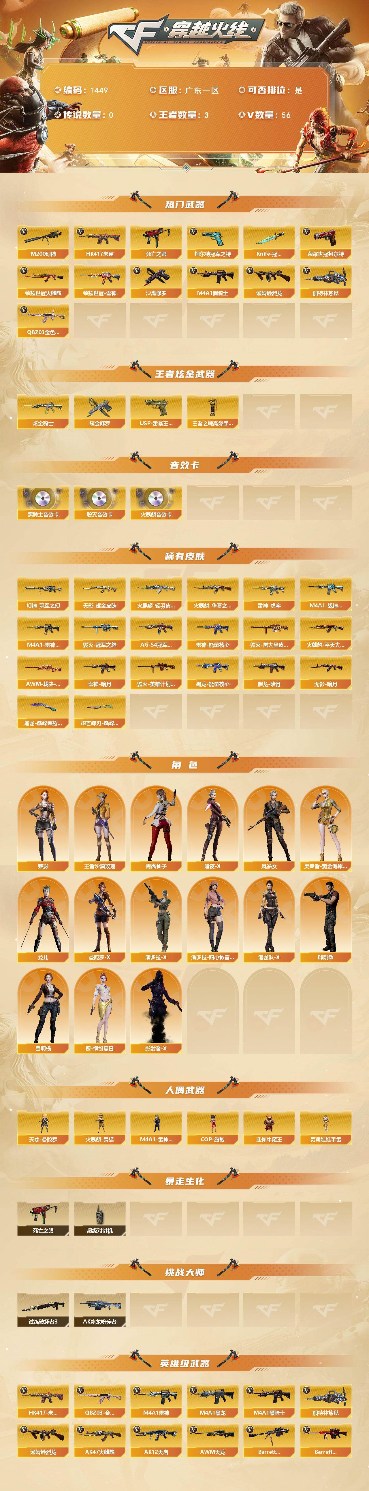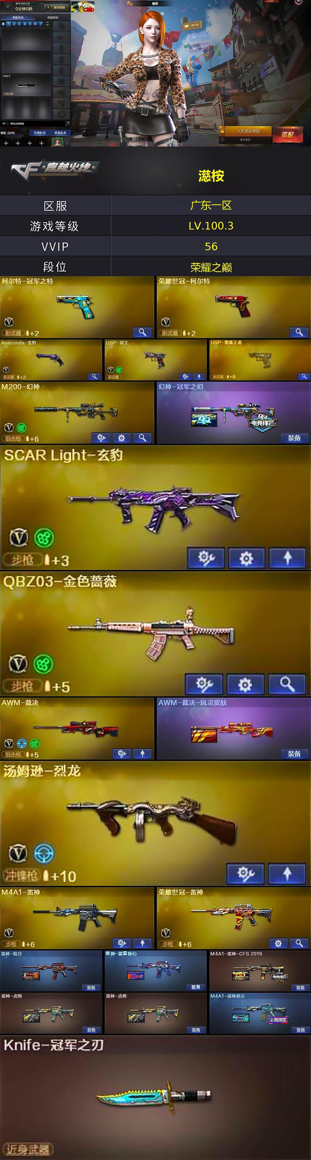 [15472047]广东一区-56V-3王者-2炫金 【热门武器】:QBZ03-金色蔷薇,HK417-朱雀,M200-幻神,死亡之眼,荣耀世冠-火麒麟,荣耀世冠-雷神,柯尔特-冠军之特,荣耀世冠-柯尔特,M4A1-黑骑士*3,汤姆逊-烈龙,加特林-炼狱,沙鹰-修罗,Knife-冠军之刃 【王者炫金武器】:USP-雷暴王者,炫金骑士,炫金修罗,王者之魄高爆手雷 【音效卡】:AK47-火麒麟音效卡,M4A1-黑骑士音