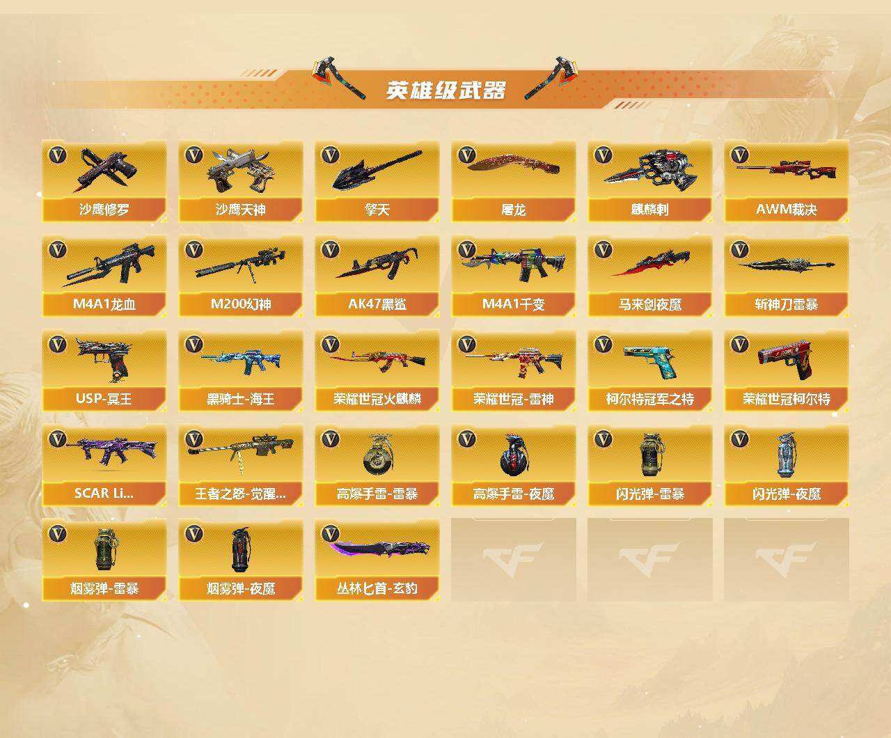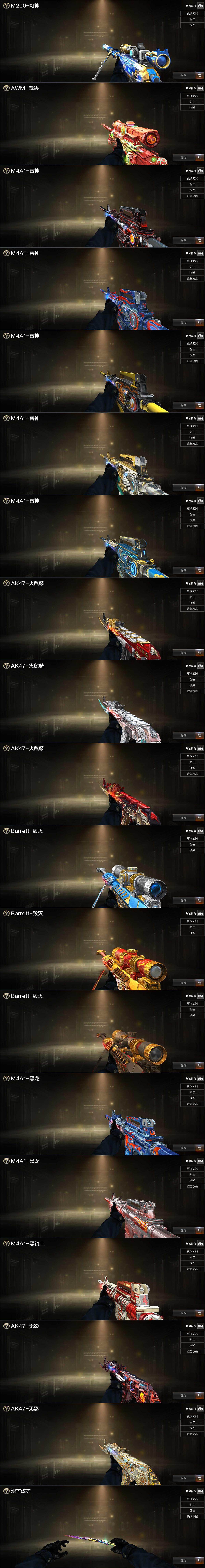 【热门武器】:QBZ03-金色蔷薇,HK417-朱雀,M200-幻神,死亡之眼,荣耀世冠-火麒麟,荣耀世冠-雷神,柯尔特-冠军之特,荣耀世冠-柯尔特,M4A1-黑骑士*3,汤姆逊-烈龙,加特林-炼狱,沙鹰-修罗,Knife-冠军之刃