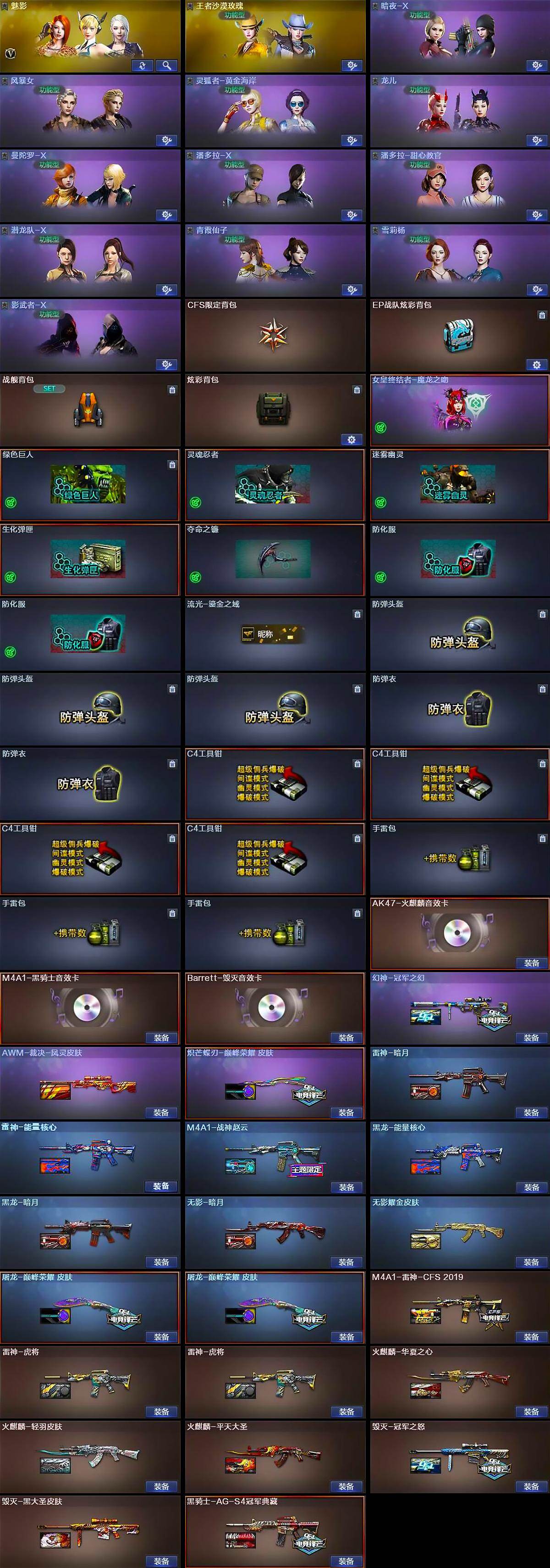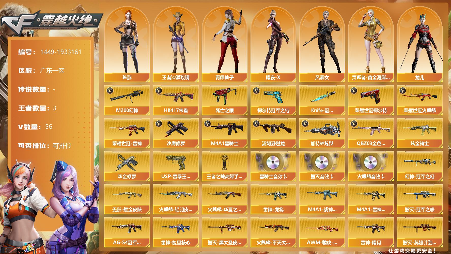 - [14417340]安徽一区-33V-8王者-0炫金 【传说武器】:传说破晓 【热门武器】:传说破晓,G36C-幻影,QBZ03-金色蔷薇,M200-幻神,MK5-炽火炎龙,沙鹰-修罗*2,炽芒蝶刃 【音效卡】:Barrett-毁灭音效卡,HK417-朱雀音效卡 【皮肤】:M200-幻神-黄忠皮肤,雷神-暗月,雷神-传奇N9,雷神-源计划2.0专属 皮肤,雷神-神秘按键 皮肤,毁灭-黑大圣皮肤,毁灭-百城浙江 皮肤,毁灭-秦师 皮肤,修罗耀金皮肤,修罗-星空,屠龙-春桃 皮肤 【角色】:妮妮,战地猎狐,王者影豹,奇洋探员,乔伊教练,修道士,云海玲珑,暗夜-X,初恋灵狐,芳心审判者,飞虎队-X,风暴女,虎妞,嘉年华灵狐,娟娟,兰-新年限定,猎狐者-追月,0号玩家,灵狐者-X,灵狐者-七夕宝贝,龙儿-小淘气,麻雀,曼陀罗-X,曼陀罗-礼服,潘多拉-X,潘多拉-甜心教官,潜龙队-X,青霞仙子,铁骑荣耀,维纳斯,雪莉杨,夜玫瑰-宠粉,樱-战斗天使,影武者-X,游珑儿 【人偶武器】:MK5-炽火炎龙,迷你牛牛,生化手雷-机甲核心 【挑战大师】:激光毁灭者III-白马银枪 【英雄级武器】:AK47-火麒麟,M4A1-雷神,无影-神兵利器,G36C-幻影,黑武士-锦绣游龙,超新星-热带奇洋,QBZ03-金色蔷薇,Barrett-毁灭,Barrett-极光,AWM-裁决,M200-幻神,王者之决-觉醒版,烈龙-云海游龙,沙鹰-修罗*2,柯尔特-无冕之王,屠龙,擎天,幻灵之锋,炽芒蝶刃,擎天-云海游龙,龙啸-热带奇洋,高爆手雷-雷霆,高爆手雷-幻灵,手雷-云海游龙,手雷-热带奇洋,闪光弹-雷霆,闪光弹-幻灵*3,闪光弹-雷霆王者-觉醒版*3,烟雾弹-雷霆,烟雾弹-幻灵,烟雾弹-雷霆王者-觉醒版,M4A1-赤狱骑士 【道具】:BS战队炫彩背包,CFS限定背包,云山科技背包,云海游龙炫彩背包,亚洲杯纪念炫彩背包,奇洋探员-海龟背包,热带奇洋炫彩背包,虎牙炫彩背包,超级背包,哔哩哔哩名片,女皇终结者-魔龙之吻,救世主-黑桃战神,绿色巨人,灵魂忍者*2,变异宝贝,迷雾幽灵*2,生化弹匣,夺命之镰,防化服*4,金色流光-枪王排位*2,星辰流光-枪王排位,流光-再燃火线,枪王排位28赛季金色流光,枪王排位29赛季金色流光,热带奇洋表情,云海游龙表情,EP战队名片,EP战队喷图,EP战队击杀图标,防弹头盔*5,防弹