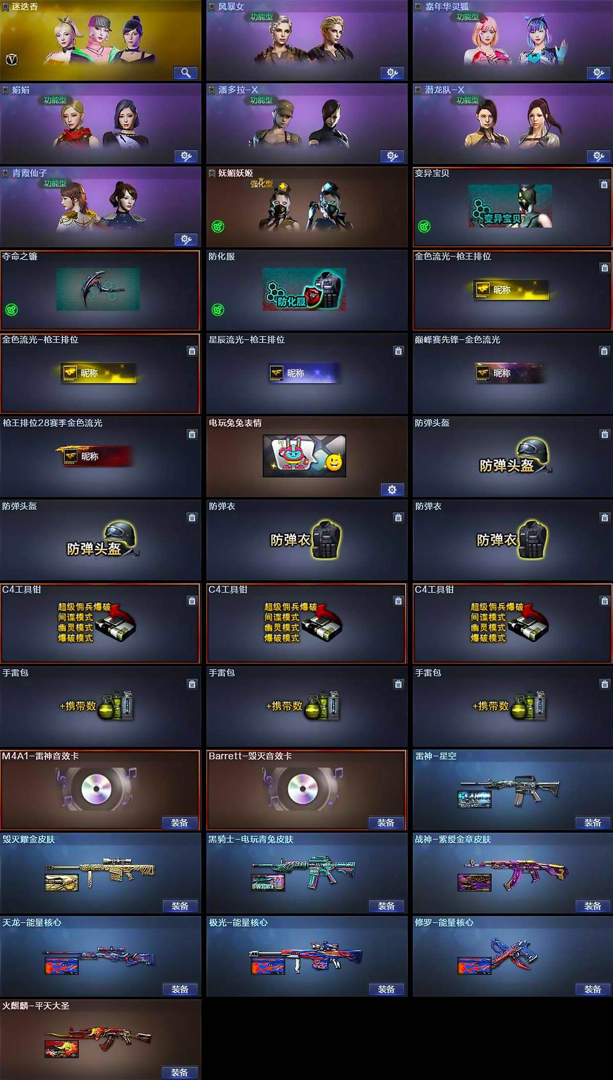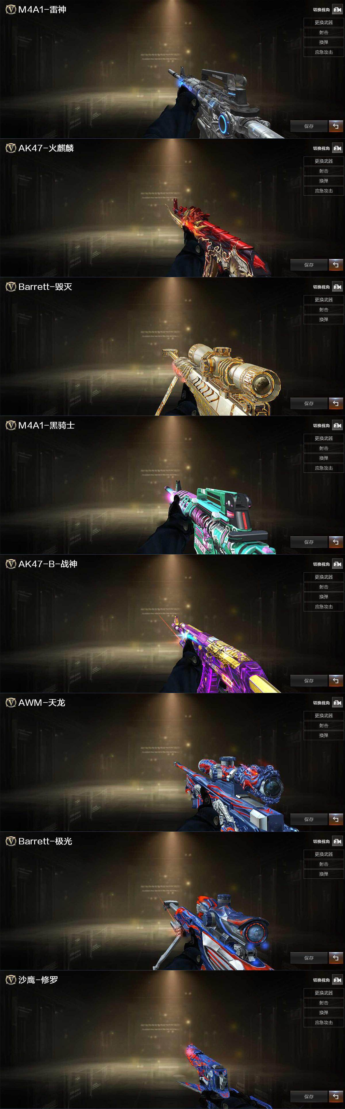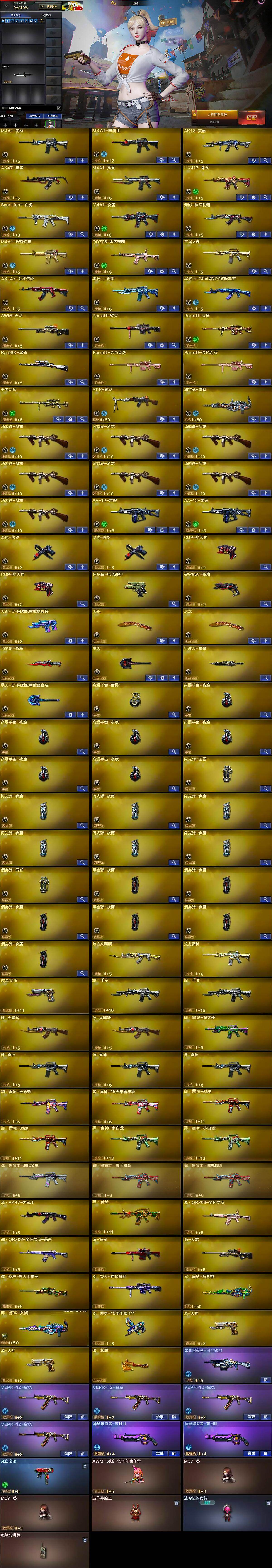 【热门武器】:QBZ03-金色蔷薇,Scar Light-白虎,HK417-朱雀,死亡之眼,QBZ03-街机,Kar98K-星神,M4A1-黑骑士,汤姆逊-烈龙*7,RPK-盘龙,加特林-炼狱,COP-堕天神*2,沙鹰-修罗*2