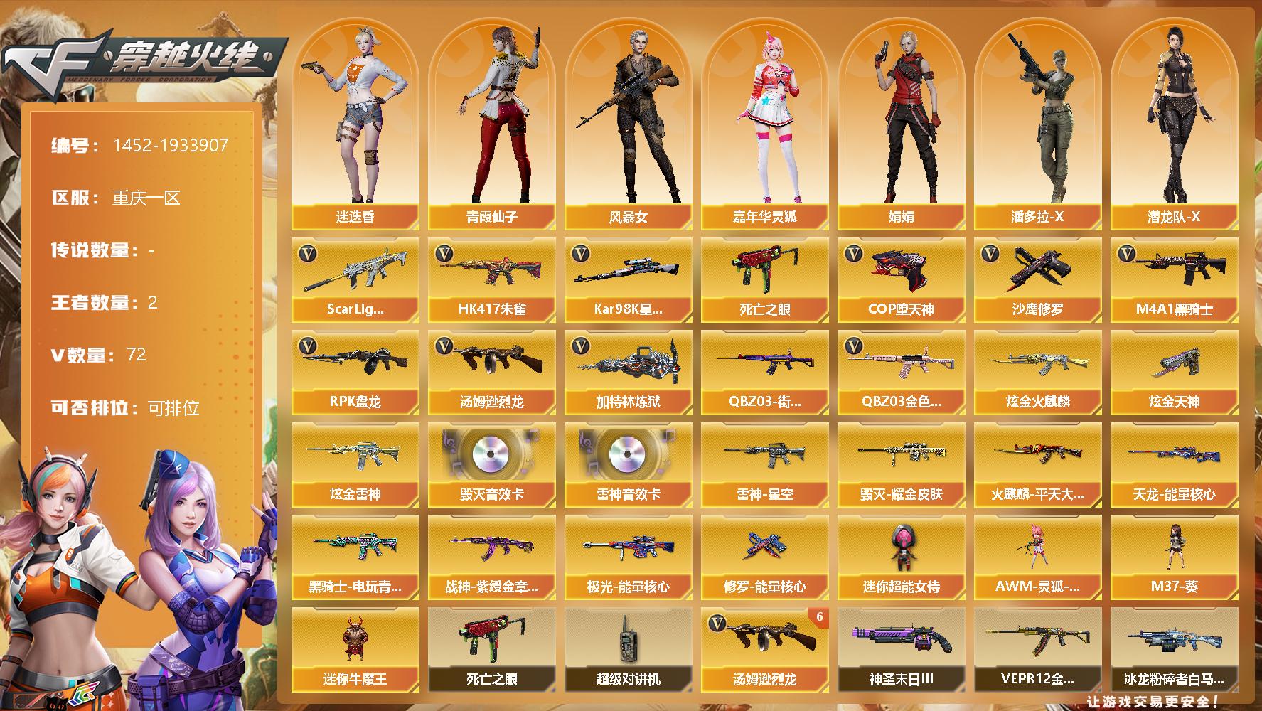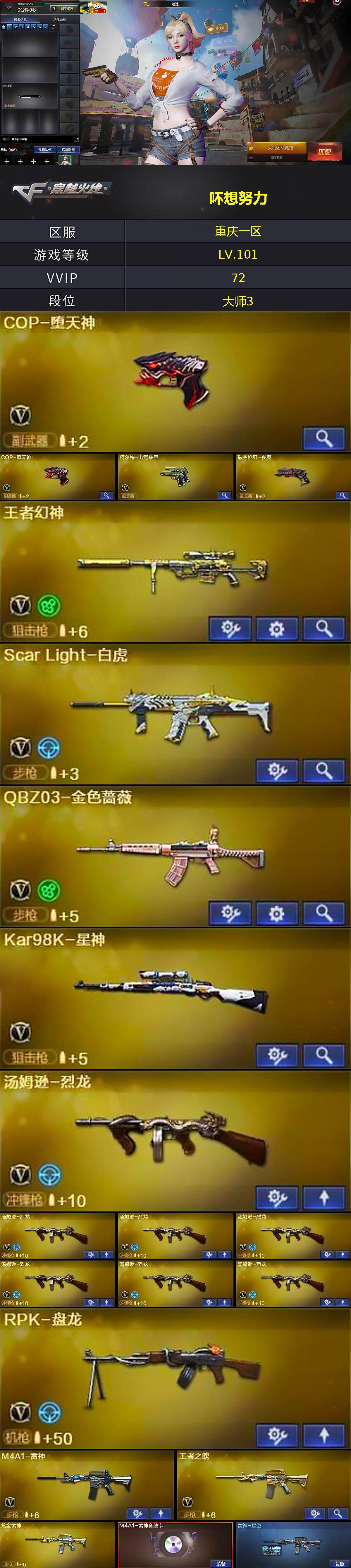 [15472305]重庆一区-72V-2王者-3炫金 【热门武器】:QBZ03-金色蔷薇,Scar Light-白虎,HK417-朱雀,死亡之眼,QBZ03-街机,Kar98K-星神,M4A1-黑骑士,汤姆逊-烈龙*7,RPK-盘龙,加特林-炼狱,COP-堕天神*2,沙鹰-修罗*2 【王者炫金武器】:炫金火麒麟,炫金雷神,炫金天神 【音效卡】:M4A1-雷神音效卡,Barrett-毁灭音效卡 【皮肤】:雷神-星空