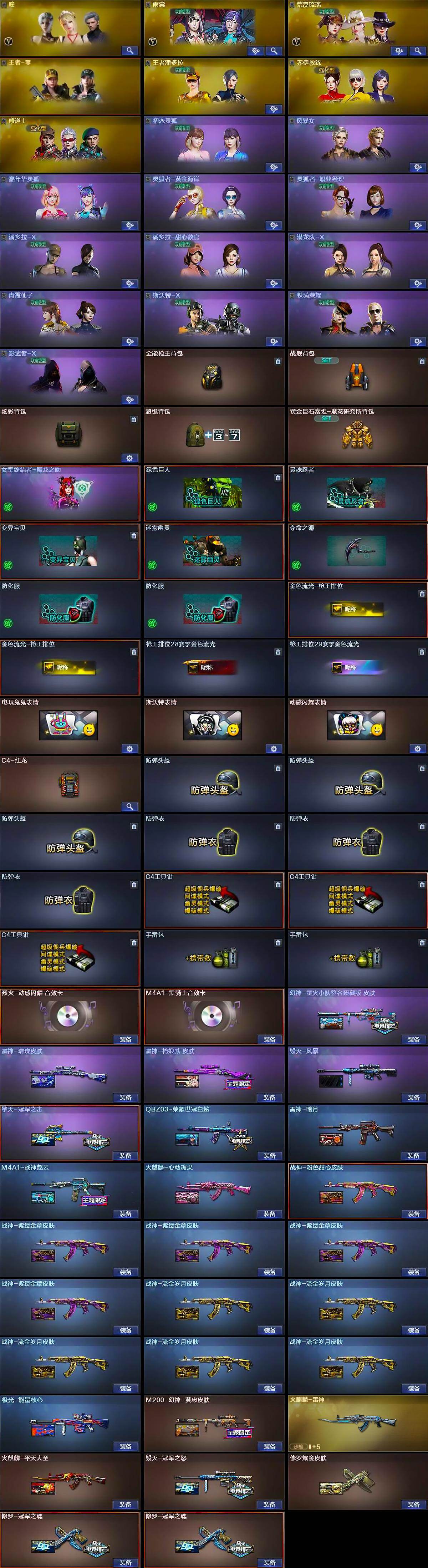 【皮肤】:M200-幻神-黄忠皮肤,幻神-星火小队签名臻藏版 皮肤,QBZ03-荣耀世冠白鲨,星神-璀璨皮肤,星神-枪娘默 皮肤,雷神-暗月,M4A1-战神赵云,火麒麟-雷神,火麒麟-平天大圣,火麒麟-心动糖果,毁灭-冠军之怒,毁灭-风暴,毁灭-英雄计划 皮肤,战神-粉色甜心皮肤,战神-紫绶金章皮肤*4,战神-流金岁月皮肤*5,极光-能量核心,修罗耀金皮肤,修罗-冠军之魂*2,擎天-冠军之击