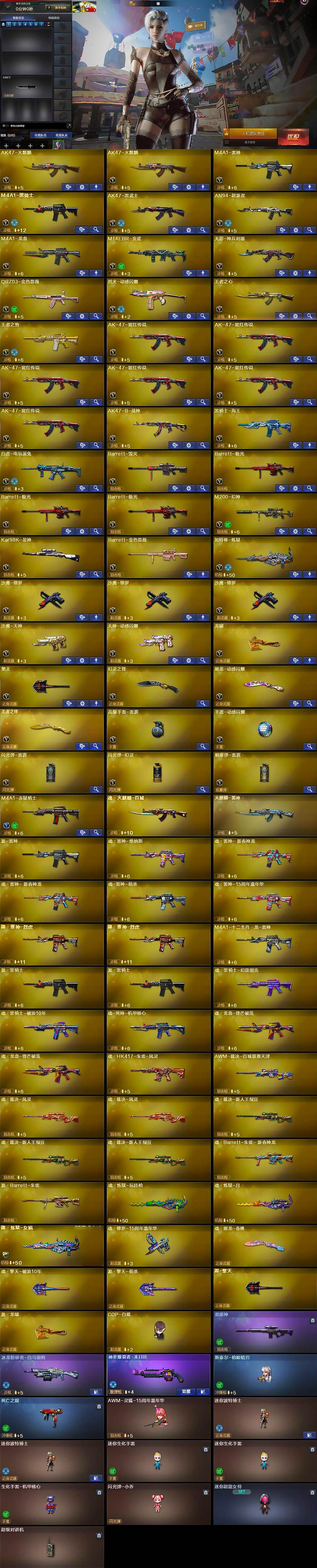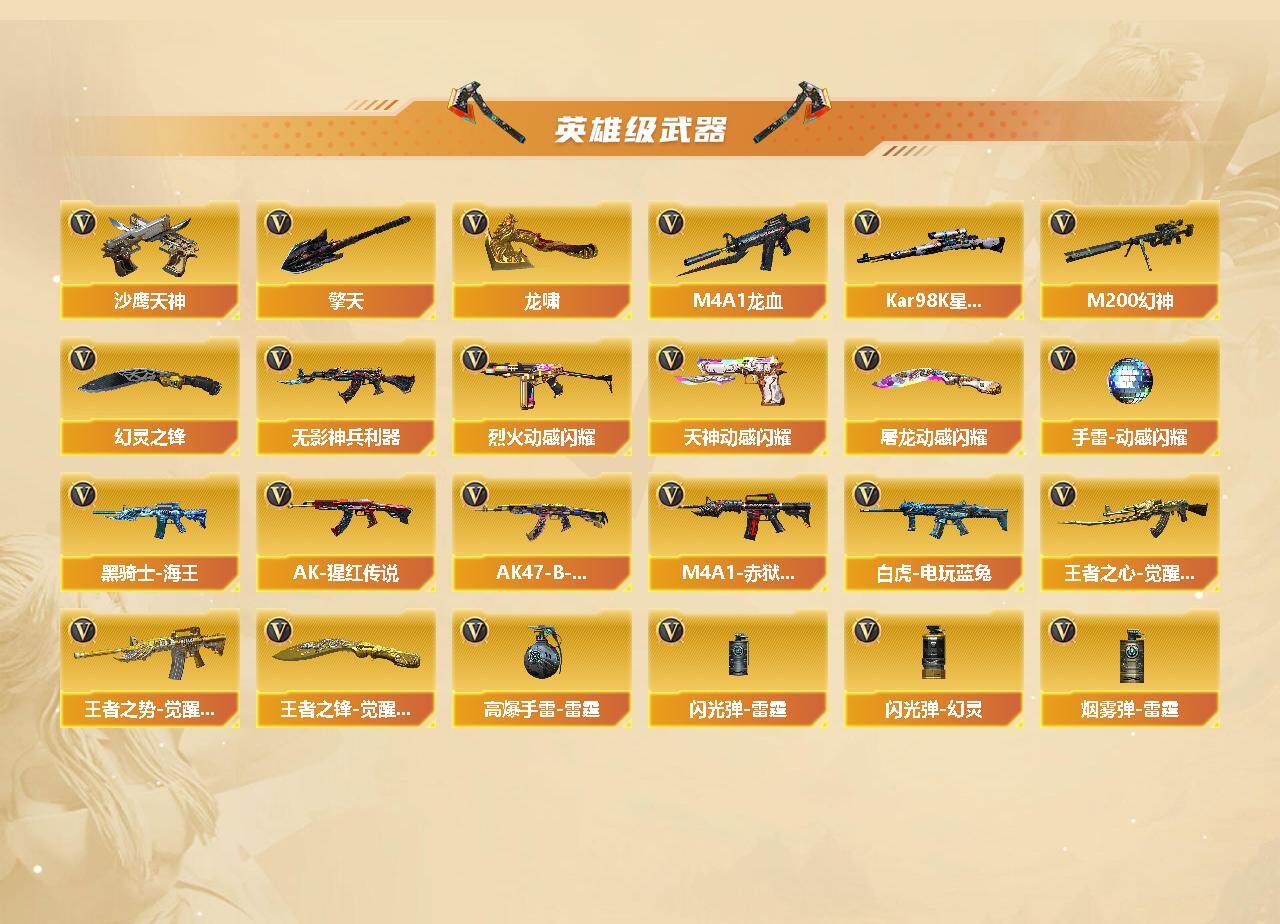 【英雄级武器】:AK47-火麒麟*2,M4A1-雷神,M4A1-黑骑士,AK47-黑武士,AN94-超新星,M4A1-龙血,M14EBR-玄武,无影-神兵利器,QBZ03-金色蔷薇,烈火-动感闪耀,王者之心-觉醒版,王者之势-觉醒版,AK-47-猩红传说*6,AK47-B-战神,黑骑士-海王,白虎-电玩蓝兔,Barrett-毁灭,Barrett-极光*3,M200-幻神,Kar98K-星神,Barrett-金色蔷薇,加特林-炼狱,沙鹰-修罗*3,沙鹰-天神,天神-动感闪耀,龙啸,擎天,幻灵之锋,屠龙-动感闪耀,王者之锋-觉醒版,高爆手雷-雷霆,手雷-动感闪耀,闪光弹-雷霆,闪光弹-幻灵,烟雾弹-雷霆,M4A1-赤狱骑士