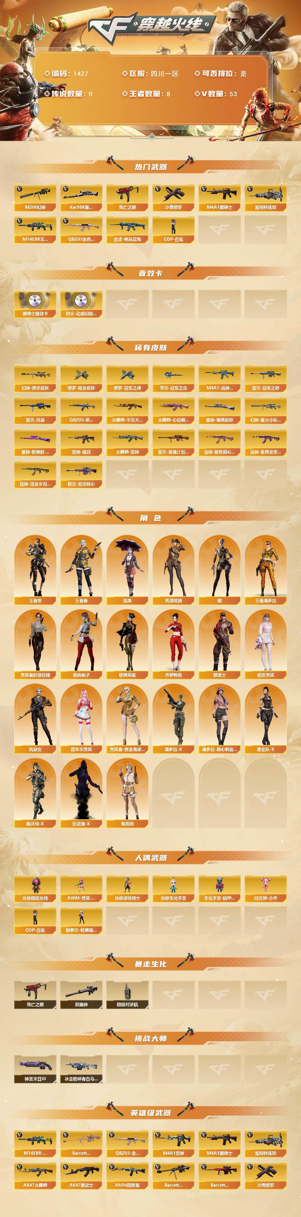 [15472347]四川一区-53V-8王者-0炫金 【热门武器】:QBZ03-金色蔷薇,M14EBR-玄武,M200-幻神,死亡之眼,白虎-电玩蓝兔,Kar98K-星神,M4A1-黑骑士,加特林-炼狱,COP-白鲨,沙鹰-修罗*3 【音效卡】:烈火-动感闪耀 音效卡,M4A1-黑骑士音效卡 【皮肤】:M200-幻神-黄忠皮肤,幻神-星火小队签名臻藏版 皮肤,QBZ03-荣耀世冠白鲨,星神-璀璨皮肤,星神-枪娘默 皮肤,雷神-暗月,M4A1-战神赵云,火麒麟-雷神,火麒麟-平天大圣,火麒麟-心动糖果,毁灭-冠军之怒,毁灭-风暴,毁灭-英雄计划 皮肤,战神-粉色甜心皮肤,战神-紫绶金章皮肤*4,战神-流金岁月皮肤*5,极光-能量核心,修罗耀金皮肤,修罗-冠军之魂*2,擎天-冠军之击 【角色】:瞳,雨棠,荒漠琉璃,王者-零,王者春,王者潘多拉,乔伊教练,修道士,初恋灵狐,风暴女,嘉年华灵狐,灵狐者-黄金海岸,灵狐者-职业经理,潘多拉-X,潘多拉-甜心教官,潜龙队-X,青霞仙子,斯沃特-X,铁骑荣耀,兔囡囡,影武者-X 【人偶武器】:COP-白鲨,斯泰尔-枪娘暗刃,AWM-灵狐-15周年嘉年华,迷你波特博士*2,迷你生化手雷*2,生化手雷-机甲核心,闪光弹-小乔,迷你超能女侍 【暴走生化】:双面神,死亡之眼,超级对讲机 【挑战大师】:冰龙粉碎者-白马银枪,神圣爆裂者-末日III 【英雄级武器】:AK47-火麒麟*2,M4A1-雷神,M4A1-黑骑士,AK47-黑武士,AN94-超新星,M4A1-龙血,M14EBR-玄武,无影-神兵利器,QBZ03-金色蔷薇,烈火-动感闪耀,王者之心-觉醒版,王者之势-觉醒版,AK-47-猩红传说*6,AK47-B-战神,黑骑士-海王,白虎-电玩蓝兔,Barrett-毁灭,Barrett-极光*3,M200-幻神,Kar98K-星神,Barrett-金色蔷薇,加特林-炼狱,沙鹰-修罗*3,沙鹰-天神,天神-动感闪耀,龙啸,擎天,幻灵之锋,屠龙-动感闪耀,王者之锋-觉醒版,高爆手雷-雷霆,手雷-动感闪耀,闪光弹-雷霆,闪光弹-幻灵,烟雾弹-雷霆,M4A1-赤狱骑士 【道具】:全能枪王背包,战舰背包,炫彩背包,超级背包,黄金巨石泰坦-魔花研究所背包,女皇终结者-魔龙之吻,绿色巨人,灵魂忍者,变异宝贝,迷雾幽灵,夺命之镰,防化服*2,金色流光-枪王排位*2,枪王排