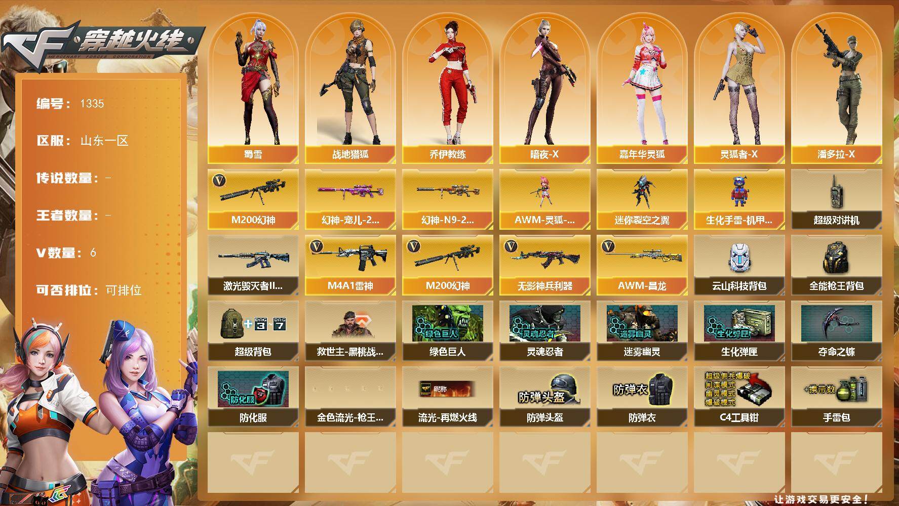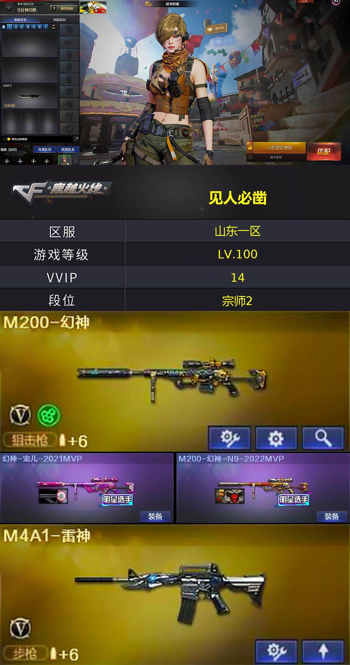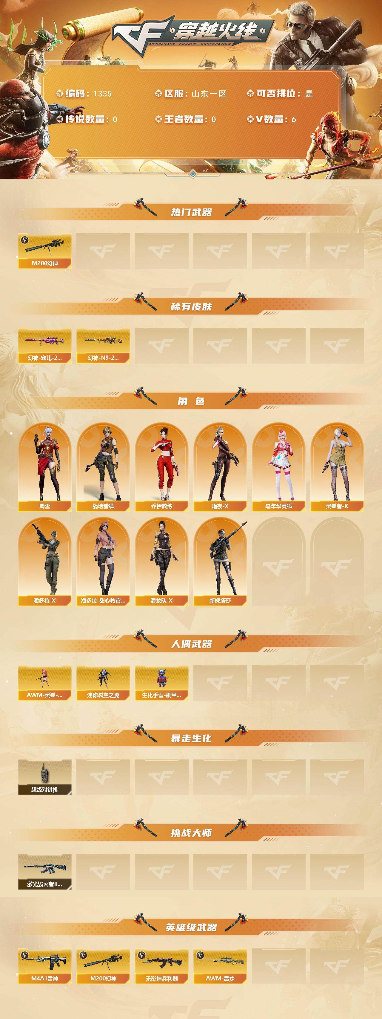 [15472406]山东一区-6V-0王者-0炫金 【热门武器】:M200-幻神 【皮肤】:幻神-宠儿-2021MVP,M200-幻神-N9-2022MVP 【角色】:战地猎狐,乔伊教练,暗夜-X,嘉年华灵狐,灵狐者-X,潘多拉-X,潘多拉-甜心教官,潜龙队-X,蜀雪,新娜塔莎 【人偶武器】:AWM-灵狐-15周年嘉年华*2,迷你裂空之翼,生化手雷-机甲核心*2 【暴走生化】:超级对讲机 【挑战大师】:激光毁灭者III-白马银枪 【英雄级武器】:M4A1-雷神,无影-神兵利器,M200-幻神,AWM-昌龙 【道具】:云山科技背包,全能枪王背包,超级背包,救世主-黑桃战神,绿色巨人,灵魂忍者,迷雾幽灵,生化弹匣,夺命之镰,防化服*3,金色流光-枪王排位*2,星辰流光-枪王排位,流光-再燃火线,防弹头盔*5,防弹衣*5,C4工具钳*5,手雷包*5 【特殊枪械】: