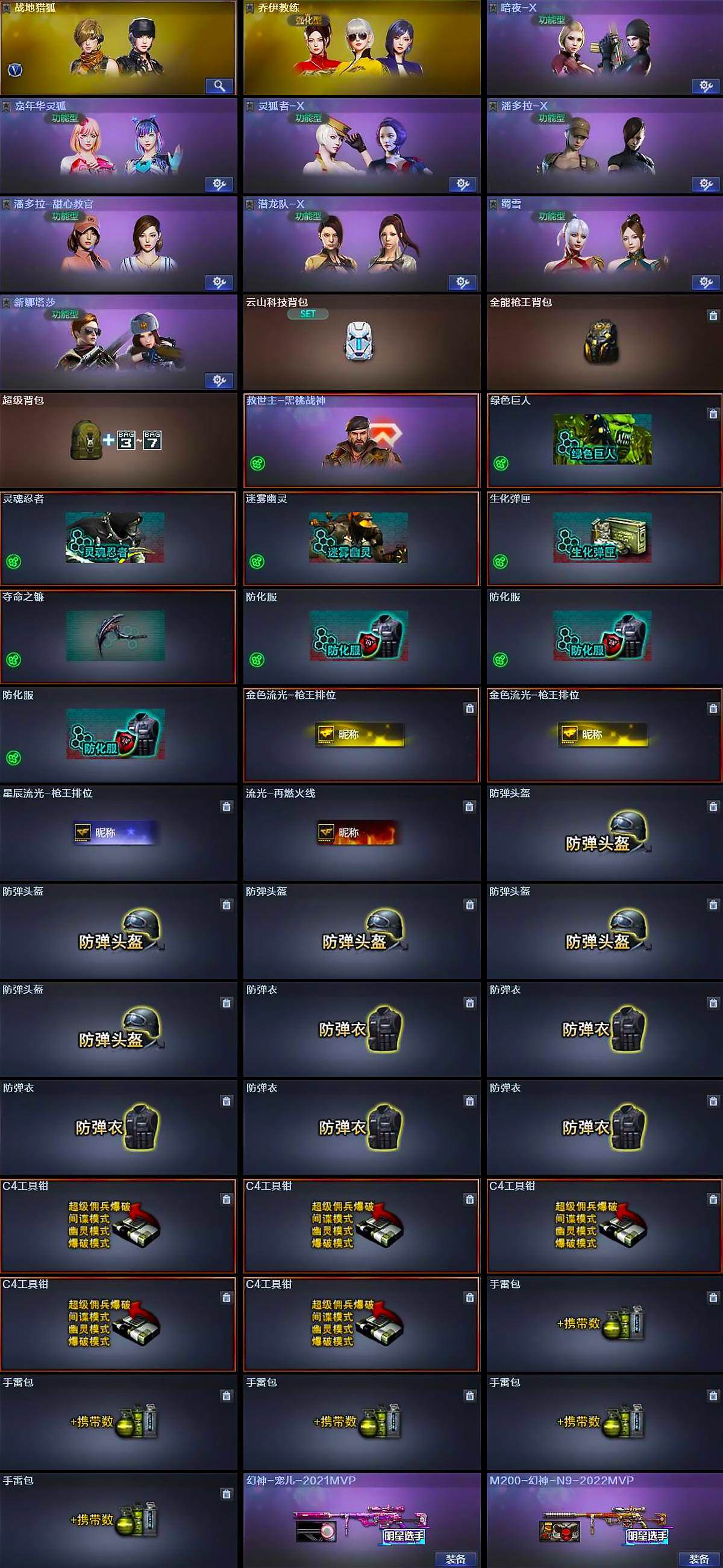 【道具】:云山科技背包,全能枪王背包,超级背包,救世主-黑桃战神,绿色巨人,灵魂忍者,迷雾幽灵,生化弹匣,夺命之镰,防化服*3,金色流光-枪王排位*2,星辰流光-枪王排位,流光-再燃火线,防弹头盔*5,防弹衣*5,C4工具钳*5,手雷包*5