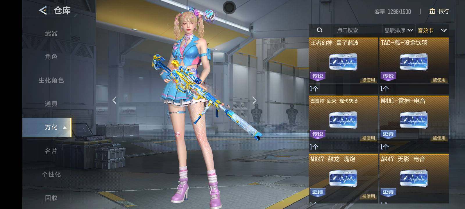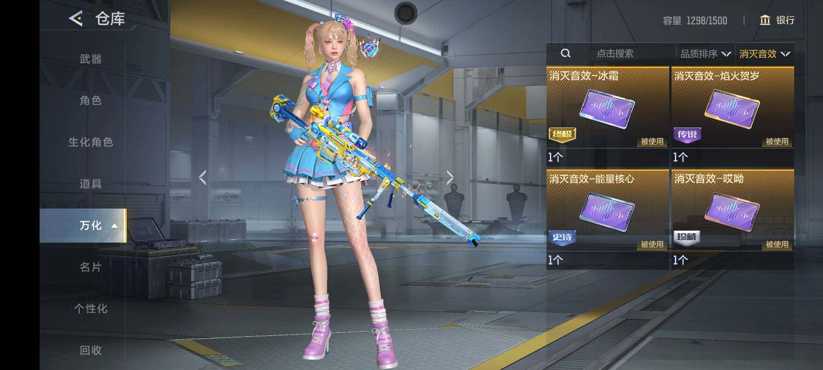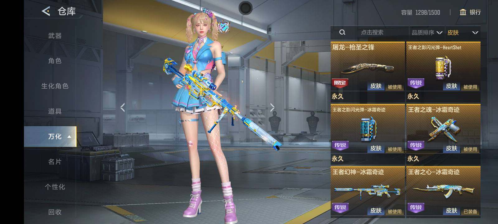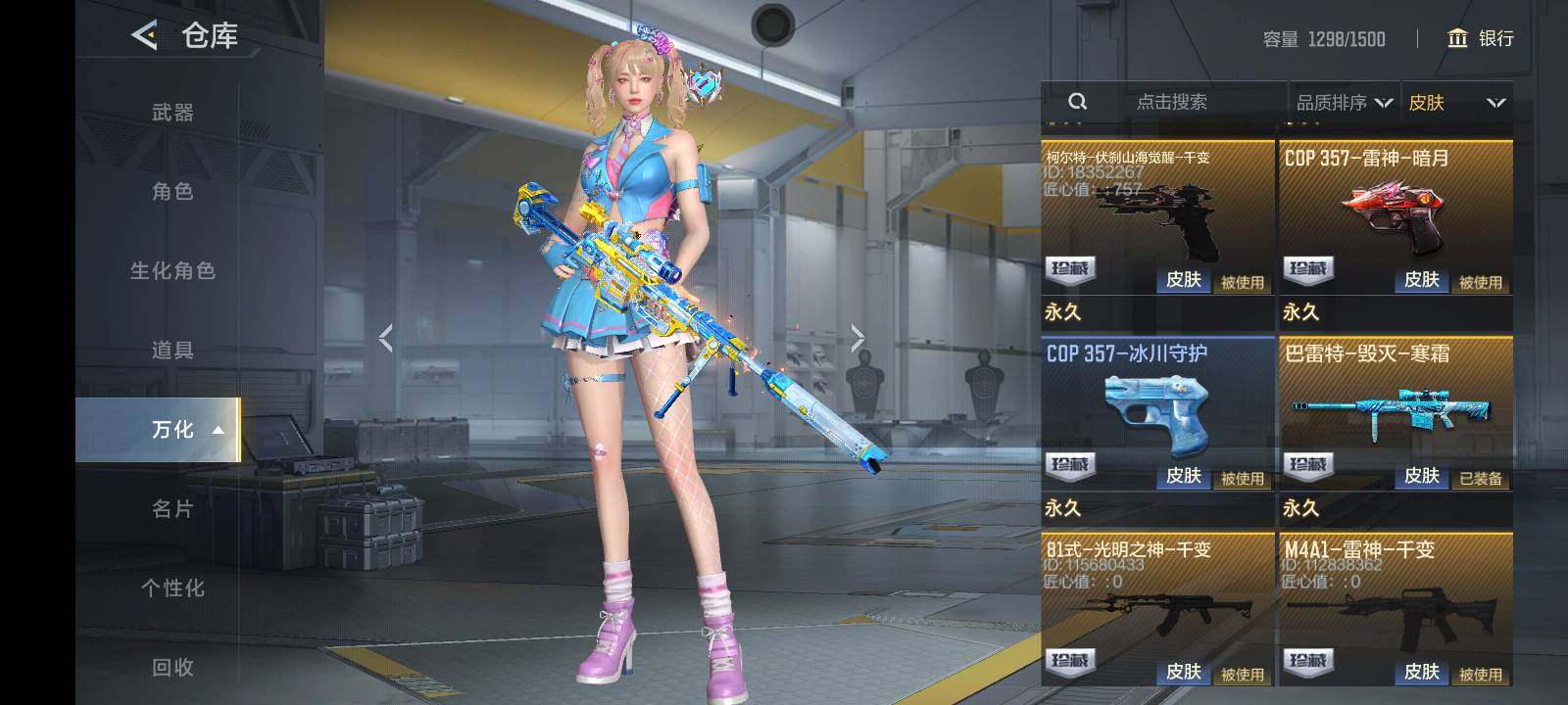 【英雄武器】:AK47-火麒麟,AK47-猩红传说,AK47-雷麒麟,AK47-血武士,AK47-黑鲨*2,AK47-木兰,AK47-塔罗牌觉醒,AK47-谜城烟火*2,M4A1-雷神*2,M4A1-玫瑰精灵*2,M4A1-龙血,M4A1-运输船*2,M4A1-猎神,M4A1-夏清,M4A1-千变,M4A1-太白诗仙,M4A1-铁胆虎魄,SCAR Light-白虎,SCAR-探星者,SCAR-心动PICK,AN94-四凶觉醒*2,AN94-赳赳秦师,9A91-游骑兵,9A91-魔蜥觉醒,M14EBR-天神,M14EBR-葫芦山庄*2,M16-恶魔,QBZ03-金色蔷薇*2,QBZ03-死神*2,HK416-极光,HK417-炎龙铠甲,81式-光明之神,G3A3-衍神兵,QBZ97-浩瀚征途,QBZ191-封神榜,AWM-天龙,AWM-裁决,AWM-指南针,巴雷特-毁灭*5,巴雷特-极光*5,巴雷特-冬灭觉醒,09式狙-天神,98K-星神,TAC-慈,TAC-晴舞,加特林-堡垒*3,加特林-堡垒觉醒,刘易斯-天使,QBB95-极光,双持斯泰尔-天使*4,斯泰尔-蝴蝶,QCW05-变形金刚·大黄蜂,CZS2-血月,CZS2-仲康,M12S-天公,PP19野牛-造纸术,DDM4-PDW-星际宇航觉醒,地狱火,地狱烈炎,AA12-火药,KSG-孟获,KSG-钟馗觉醒,USP-神罚*3,USP-机械迷城*2,USP-太白诗仙,沙鹰-修罗*4,沙鹰-神兵修罗*2,蚩尤战弓觉醒,蟒蛇-火力竞放觉醒,蟒蛇-鼓龙,左轮-卧龙觉醒,双持GLOCK18-本初,COP 357-雷神,QSZ92-华夏传说*2,柯尔特-仲达,柯尔特-伏刹山海觉醒,CZ75-穷奇,MK23-幻神,掠夺者P365-虹舞,蝴蝶刀-天神,女皇利刃-铁胆虎魄*2,炽芒蝶刃*2,清刚-觉醒,匕首-浩瀚征途,龙啸,神罚战斧*2,手斧-机械迷城*3,秋逸觉醒*2,气勇胆烈戟,屠龙*7,尼泊尔-铜头铁臂,龙鳞-觉醒,星芒,马来剑-毁灭*4,唐刀-华夏传说,唐刀-大唐荣耀,末日裁决觉醒*3,破邪蛇
