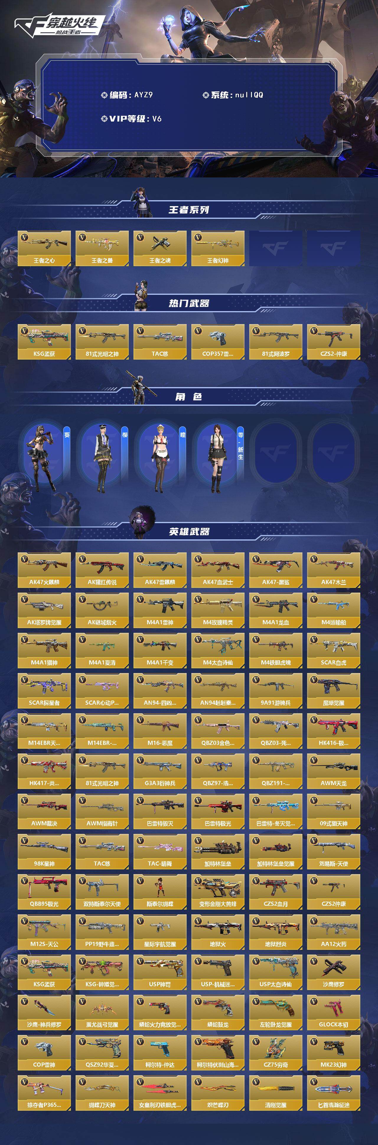 [15472490]5英雄角色数-227英雄武器数 【王者系列】:王者之心,王者之兽,王者之魂,王者幻神 【热门武器】:KSG-孟获,81式-光明之神,TAC-慈,COP 357-雷神,81式-阿波罗,CZS2-仲康 【角色】:葵,樱*2,瞳,零-新生 【英雄武器】:AK47-火麒麟,AK47-猩红传说,AK47-雷麒麟,AK47-血武士,AK47-黑鲨*2,AK47-木兰,AK47-塔罗牌觉醒,AK47-谜城烟火*2,M4A1-雷神*2,M4A1-玫瑰精灵*2,M4A1-龙血,M4A1-运输船*2,M4A1-猎神,M4A1-夏清,M4A1-千变,M4A1-太白诗仙,M4A1-铁胆虎魄,SCAR Light-白虎,SCAR-探星者,SCAR-心动PICK,AN94-四凶觉醒*2,AN94-赳赳秦师,9A91-游骑兵,9A91-魔蜥觉醒,M14EBR-天神,M14EBR-葫芦山庄*2,M16-恶魔,QBZ03-金色蔷薇*2,QBZ03-死神*2,HK416-极光,HK417-炎龙铠甲,81式-光明之神,G3A3-衍神兵,QBZ97-浩瀚征途,QBZ191-封神榜,AWM-天龙,AWM-裁决,AWM-指南针,巴雷特-毁灭*5,巴雷特-极光*5,巴雷特-冬灭觉醒,09式狙-天神,98K-星神,TAC-慈,TAC-晴舞,加特林-堡垒*3,加特林-堡垒觉醒,刘易斯-天使,QBB95-极光,双持斯泰尔-天使*4,斯泰尔-蝴蝶,QCW05-变形金刚·大黄蜂,CZS2-血月,CZS2-仲康,M12S-天公,PP19野牛-造纸术,DDM4-PDW-星际宇航觉醒,地狱火,地狱烈炎,AA12-火药,KSG-孟获,KSG-钟馗觉醒,USP-神罚*3,USP-机械迷城*2,USP-太白诗仙,沙鹰-修罗*4,沙鹰-神兵修罗*2,蚩尤战弓觉醒,蟒蛇-火力竞放觉醒,蟒蛇-鼓龙,左轮-卧龙觉醒,双持GLOCK18-本初,COP 357-雷神,QSZ92-华夏传说*2,柯尔特-仲达,柯尔特-伏刹山海觉醒,CZ75-穷奇,MK23-幻神,掠夺者P365-虹舞,蝴蝶刀-天神,女皇利刃-铁胆虎魄*2,炽芒蝶刃*2,清刚-觉醒,匕首-浩瀚征途,龙啸,神罚战斧*2,手斧-机械迷城*3,秋逸觉醒*2,气勇胆烈戟,屠龙*7,尼泊尔-铜头铁臂,龙鳞-觉醒,星芒,马来剑-毁灭*4,唐刀-华夏传说,唐刀-大唐荣耀,末日裁决觉醒*3,破邪蛇