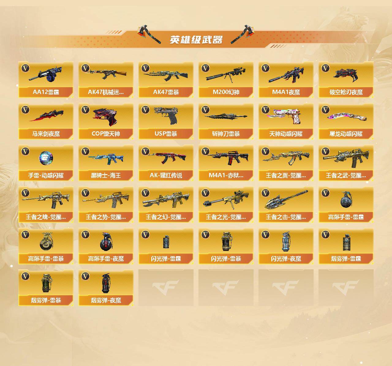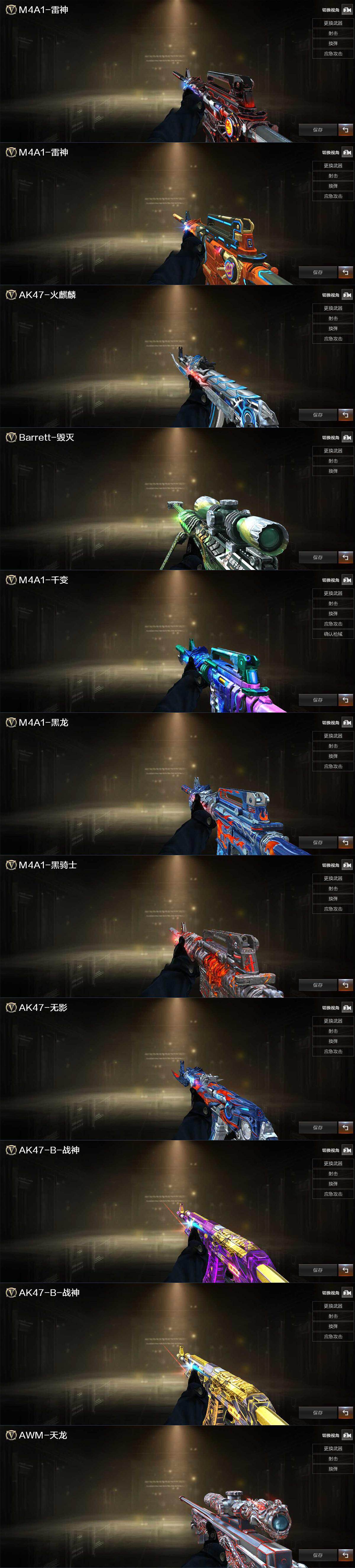 【热门武器】:QBZ03-金色蔷薇,HK417-朱雀,M200-幻神,M4A1-黑骑士,汤姆逊-烈龙*5,RPK-盘龙*2,加特林-炼狱*2,斯泰尔-蝴蝶,USP-雷暴,COP-堕天神*2,沙鹰-修罗*2