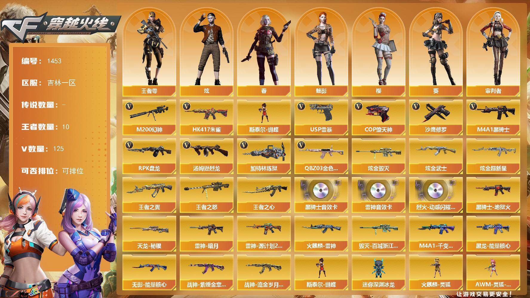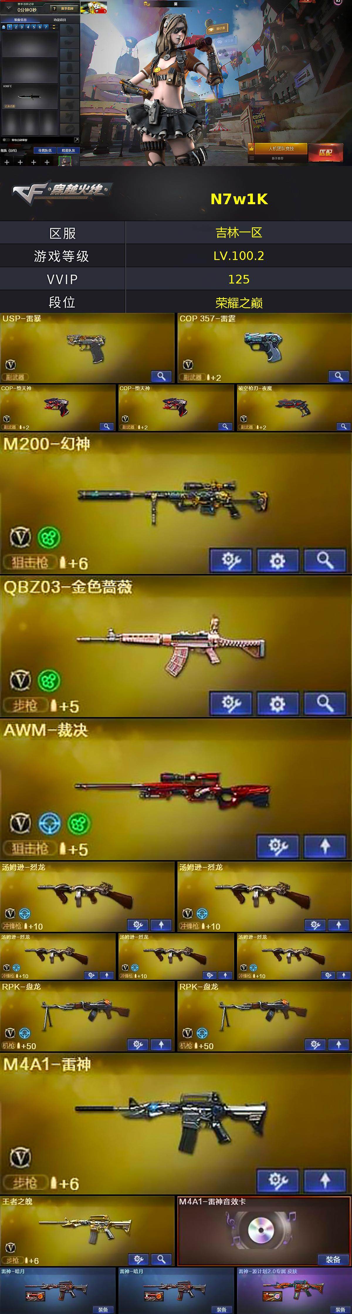 [15472703]吉林一区-125V-10王者-3炫金 【热门武器】:QBZ03-金色蔷薇,HK417-朱雀,M200-幻神,M4A1-黑骑士,汤姆逊-烈龙*5,RPK-盘龙*2,加特林-炼狱*2,斯泰尔-蝴蝶,USP-雷暴,COP-堕天神*2,沙鹰-修罗*2 【王者炫金武器】:王者之翼,王者之心,王者之怒,炫金武士,炫金超新星,炫金毁灭 【音效卡】:烈火-动感闪耀 音效卡,M4A1-雷神音效卡,M4A1-黑骑