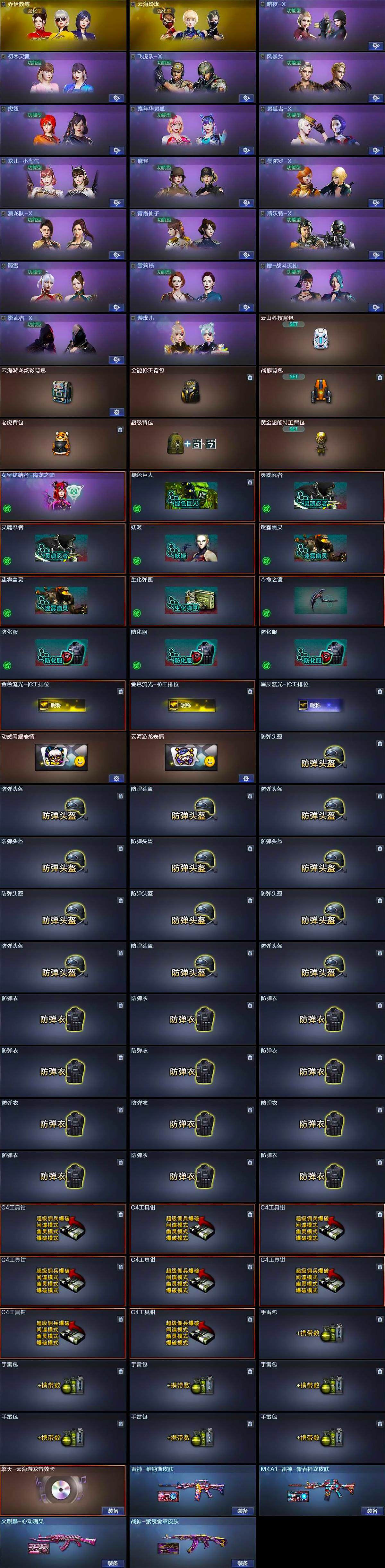 【道具】:云山科技背包,云海游龙炫彩背包,全能枪王背包,战舰背包,老虎背包,超级背包,黄金超能特工背包,女皇终结者-魔龙之吻,绿色巨人,灵魂忍者*2,妖姬,迷雾幽灵*2,生化弹匣,夺命之镰,防化服*3,金色流光-枪王排位*2,星辰流光-枪王排位,动感闪耀表情,云海游龙表情,防弹头盔*13,防弹衣*12,C4工具钳*8,手雷包*7