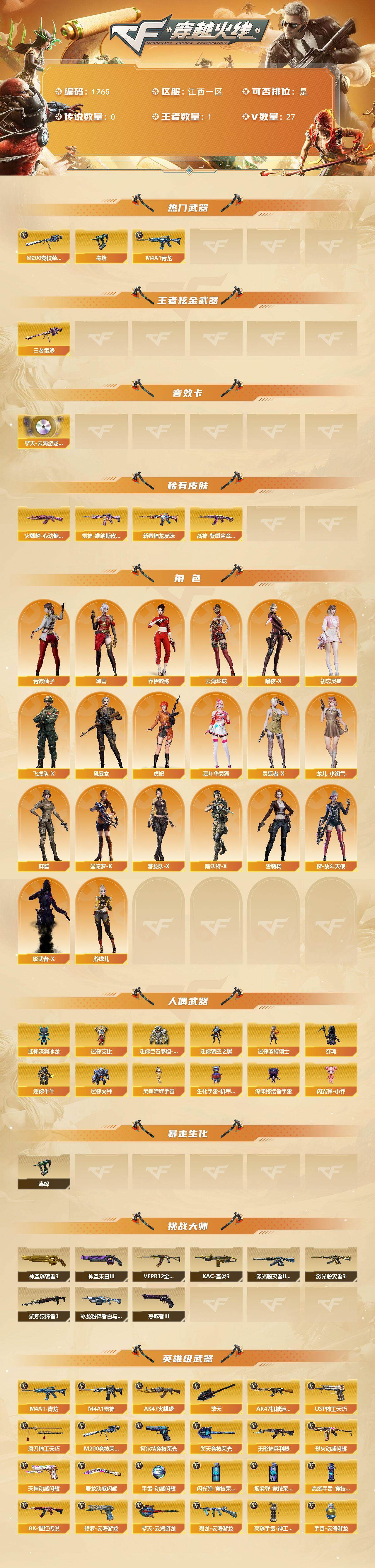 [15473342]江西一区-27V-1王者-0炫金 【热门武器】:M4A1-青龙,M200-竞技荣光,毒蜂 【王者炫金武器】:王者雷怒 【音效卡】:擎天-云海游龙音效卡 【皮肤】:雷神-维纳斯皮肤,M4A1-雷神-新春神龙皮肤,火麒麟-心动糖果,战神-紫绶金章皮肤 【角色】:乔伊教练,云海玲珑,暗夜-X,初恋灵狐,飞虎队-X,风暴女,虎妞,嘉年华灵狐,灵狐者-X,龙儿-小淘气,麻雀,曼陀罗-X,潜龙队-X,青霞仙子,斯沃特-X,蜀雪,雪莉杨,樱-战斗天使,影武者-X,游珑儿 【人偶武器】:迷你深渊冰龙*2,迷你裂空之翼*2,迷你波特博士*2,夺魂,迷你牛牛,迷你火种*2,生化手雷-机甲核心,深渊终结者手雷*2,闪光弹-小乔,迷你艾比,迷你巨石泰坦-魔花研究所,灵狐娃娃手雷 【暴走生化】:毒蜂 【挑战大师】:神圣爆裂者III,冰龙粉碎者-白马银枪,激光毁灭者III-白马银枪,VEPR-12-金魔,激光毁灭者III,试炼破坏者III,KAC-圣炎切割者III,神圣爆裂者-末日III,惩戒者III 【英雄级武器】:AK47-火麒麟,M4A1-雷神,AK47-机械迷城,M4A1-青龙,无影-神兵利器,烈火-动感闪耀,AK-47-猩红传说,M200-竞技荣光,烈龙-云海游龙,柯尔特-竞技荣光,USP-神工天巧,天神-动感闪耀,修罗-云海游龙,擎天,擎天-竞技荣光,唐刀-神工天巧,屠龙-动感闪耀,擎天-云海游龙,高爆手雷-竞技荣光,高爆手雷-神工天巧,手雷-动感闪耀,手雷-云海游龙,闪光弹-竞技荣光,闪光弹-神工天巧,烟雾弹-竞技荣光,烟雾弹-神工天巧 【道具】:云山科技背包,云海游龙炫彩背包,全能枪王背包,战舰背包,老虎背包,超级背包,黄金超能特工背包,女皇终结者-魔龙之吻,绿色巨人,灵魂忍者*2,妖姬,迷雾幽灵*2,生化弹匣,夺命之镰,防化服*3,金色流光-枪王排位*2,星辰流光-枪王排位,动感闪耀表情,云海游龙表情,防弹头盔*13,防弹衣*12,C4工具钳*8,手雷包*7 【特殊枪械】: