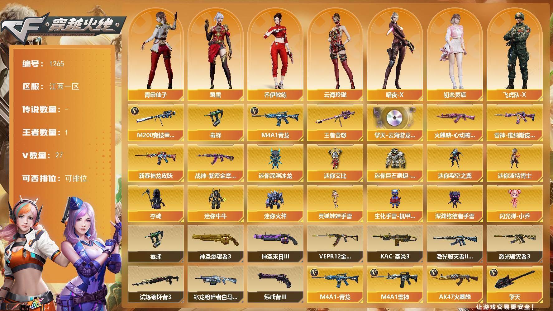 - [15234193]江西一区-48V-4王者-2炫金 【传说角色】:传说艾莉莎 【热门武器】:死亡之眼,柯尔特-冠军之特,汤姆逊-烈龙*3,沙鹰-修罗*6 【王者炫金武器】:炫金毁灭,炫金修罗 【音效卡】:屠龙-动感闪耀 音效卡,Barrett-毁灭音效卡,麒麟刺-百战金芒-盛典舞曲音效卡,炼狱-百战金芒-庆典舞曲音效卡 【皮肤】:雷神-暗月,雷神-能量核心,雷神-荣耀之魄,M4A1-雷神-CFS 2019,M4A1-再燃火线,火麒麟-雷神,火麒麟-百城,火麒麟-巅峰荣耀,毁灭-暗月*3,毁灭耀金皮肤,黑龙-暗月,死神-秘银*3,天启-暗月,天龙-秘银,天神-暗月*3,轻型军用手斧-再燃火线 【角色】:零,王者-瞳-闭月羞花,王者零-华冠丽服,王者炽天使,雪域霜狐,奇洋探员,乔伊教练,云海玲珑,暗夜-X,初恋灵狐,芳心审判者,嘉年华灵狐,灵狐者-七夕宝贝,麻雀,潘多拉-X,潘多拉-甜心教官,斯沃特-X,新娜塔莎,影武者-X 【人偶武器】:AWM-灵狐-15周年嘉年华*2,迷你牛魔王,迷你波特博士,夺魂*2,迷你牛牛,深渊终结者手雷,迷你巨石泰坦-魔花研究所,灵狐娃娃手雷 【暴走生化】:死亡之眼 【挑战大师】:冰龙粉碎者-白马银枪,激光毁灭者III-白马银枪,激光毁灭者III,神圣爆裂者-末日III 【英雄级武器】:AK47-火麒麟,M4A1-雷神,M4A1-死神*3,无影-神兵利器,烈火-动感闪耀,王者之势-觉醒版,QBZ-03-王者蔷薇-觉醒版,AWM-天龙,Barrett-毁灭*2,Barrett-极光,王者星神-觉醒版,王者风神-觉醒版,炼狱-百战金芒,汤姆逊-烈龙*3,沙鹰-修罗*6,柯尔特-冠军之特,柯尔特-竞技荣光,天神-动感闪耀,屠龙*3,龙啸,擎天,麒麟刺,擎天-竞技荣光,屠龙-动感闪耀*2,擎天-云海游龙,麒麟刺-百战金芒,高爆手雷-竞技荣光*2,手雷-动感闪耀,手雷-云海游龙,闪光弹-竞技荣光*2,烟雾弹-竞技荣光*2,M4A1-赤狱骑士 【道具】:BS战队炫彩背包,云山科技背包,全能枪王背包,战舰背包,炫彩背包,百战金芒炫彩背包,超级背包,雪域霜狐炫彩背包,女皇终结者-魔龙之吻,救世主-黑桃战神,黄金生化钩,绿色巨人,灵魂忍者,变异宝贝,妖姬,迷雾幽灵,夺命之镰,防化服*3,金色流光-枪王排位*2,流光-鎏金之域,流光-再燃火线,枪王排位29赛季金色流光,语音特