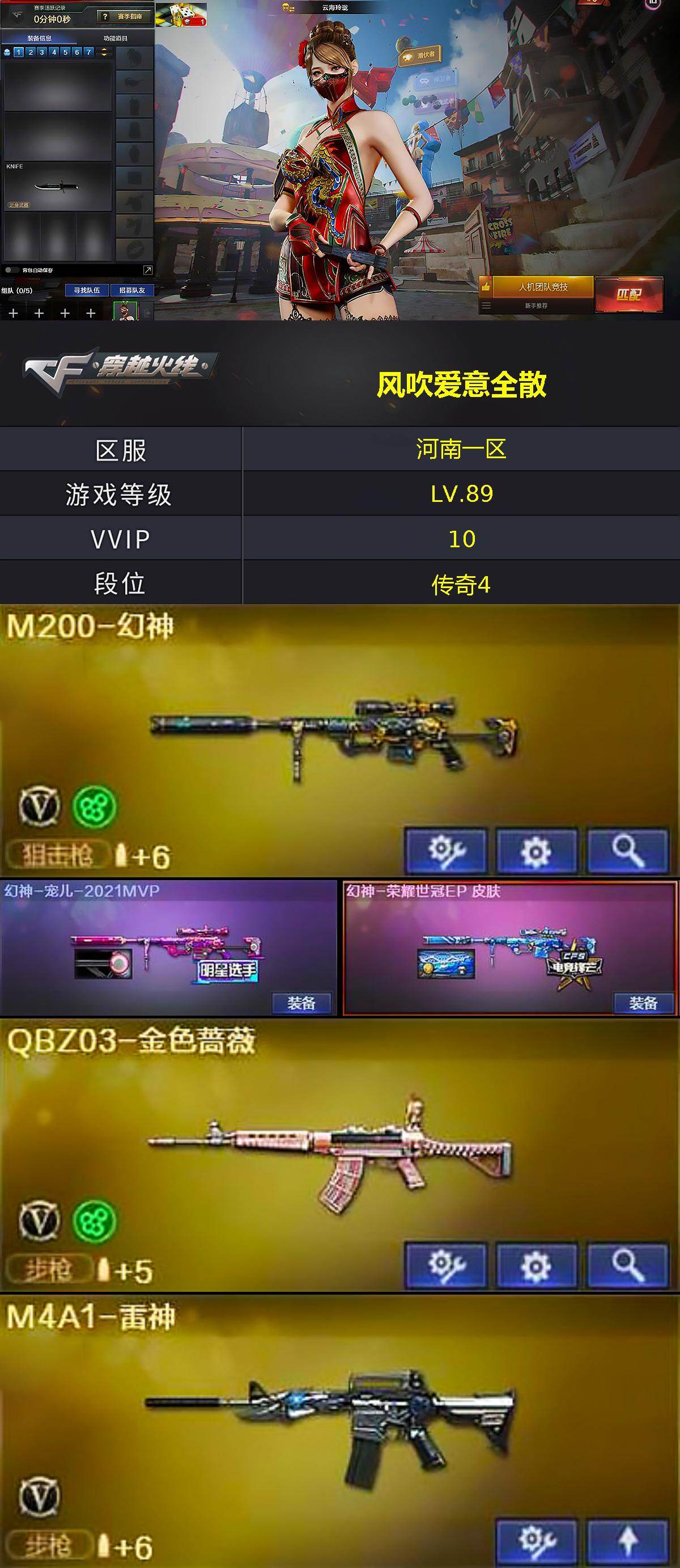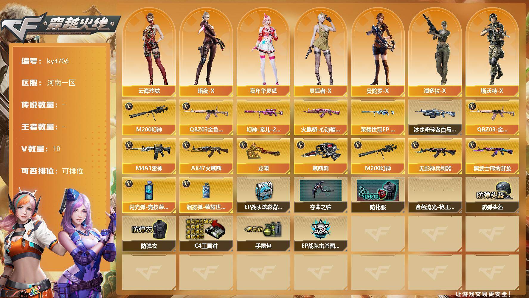 [15350452]河南一区-10V-0王者-0炫金 【热门武器】:QBZ03-金色蔷薇,M200-幻神 【皮肤】:幻神-宠儿-2021MVP,幻神-荣耀世冠EP 皮肤,火麒麟-心动糖果 【角色】:云海玲珑,暗夜-X,嘉年华灵狐,灵狐者-X,曼陀罗-X,潘多拉-X,斯沃特-X 【挑战大师】:冰龙粉碎者-白马银枪 【英雄级武器】:AK47-火麒麟,M4A1-雷神,无影-神兵利器,黑武士-锦绣游龙,QBZ03-金色蔷薇,M200-幻神,龙啸,麒麟刺,闪光弹-竞技荣光,烟雾弹-荣耀世冠EP 【道具】:EP战队炫彩背包,夺命之镰,防化服,金色流光-枪王排位*2,星辰流光-枪王排位,枪王排位28赛季金色流光,EP战队击杀图标,防弹头盔*3,防弹衣*3,C4工具钳*3,手雷包*3 【特殊枪械】: