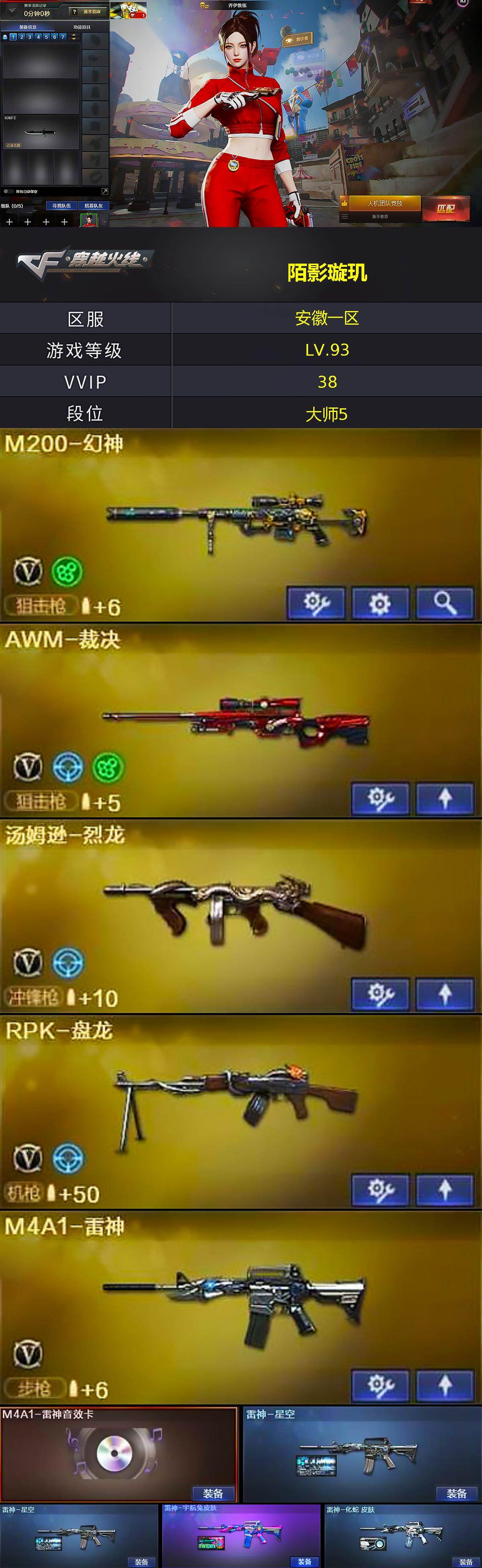 [15349775]安徽一区-38V-6王者-1炫金 【热门武器】:HK417-朱雀,M200-幻神,死亡之眼,M4A1-黑骑士,汤姆逊-烈龙,RPK-盘龙,加特林-炼狱*2,沙鹰-修罗,金刚伞 【王者炫金武器】:王者之戮,王者之翼,炫金骑士 【音效卡】:AK47-火麒麟音效卡,M4A1-雷神音效卡,M4A1-黑骑士音效卡,Barrett-毁灭音效卡 【皮肤】:裁决-胜者为王 皮肤,雷神-星空*2,雷神-宇航兔皮肤,雷神-化蛇 皮肤,火麒麟-雷神,火麒麟-轻羽皮肤,无影耀金皮肤,无影-神兵利器 皮肤,战神-粉色甜心皮肤,AK47-B-常胜将军-曹操*2,AK47-B-常胜将军-刘备,AK47-B-常胜将军-孙权*3,AWM-天龙-传奇70KG,修罗-冠军之魂,屠龙-惊鸿 皮肤 【角色】:乔伊教练,修道士,电竞少女,风暴女,嘉年华灵狐,兰妹妹,0号玩家,零-水下丽影,灵狐者-X,龙儿,潜龙队-X,斯沃特-X,兔囡囡,新娜塔莎,夜玫瑰-幻能朋克 【人偶武器】:火麒麟-灵狐,AWM-灵狐-15周年嘉年华,迷你波特博士,夺魂,迷你生化手雷,闪光弹-貂蝉,高爆手雷-大乔,迷你巨石泰坦-魔花研究所 【暴走生化】:死亡之眼,超级对讲机 【挑战大师】:激光毁灭者III,神圣爆裂者-末日III 【英雄级武器】:AK47-火麒麟,M4A1-黑龙,M4A1-雷神,M4A1-黑骑士,AK47-无影,AK47-黑鲨*2,M4A1-龙血,HK417-朱雀,无影-神兵利器,烈火-动感闪耀,AK47-B-战神,AK47-B-常胜将军,Barrett-毁灭,Barrett-极光,AWM-裁决,M200-幻神,RPK-盘龙,加特林-炼狱*2,汤姆逊-烈龙,沙鹰-修罗,沙鹰-天神,王者之魂-觉醒版,王者之灵-觉醒版,天神-动感闪耀,屠龙,龙啸*3,屠龙-动感闪耀,王者之啸-觉醒版,王者之击-觉醒版,手雷-动感闪耀 【道具】:BS战队炫彩背包,CFS限定背包,全能枪王背包,炫彩背包-诺拉,超级背包,女皇终结者-魔龙之吻,绿色巨人,灵魂忍者,变异宝贝,迷雾幽灵,生化弹匣,夺命之镰,防化服*2,金色流光-枪王排位*2,枪王排位28赛季金色流光,枪王排位29赛季金色流光,动感闪耀表情,云海游龙表情,EP战队名片,EP战队喷图,EP战队击杀图标,防弹头盔*7,防弹衣*7,C4工具钳*5,手雷包*7 【特殊枪械】:1黑骑士,1烈龙,