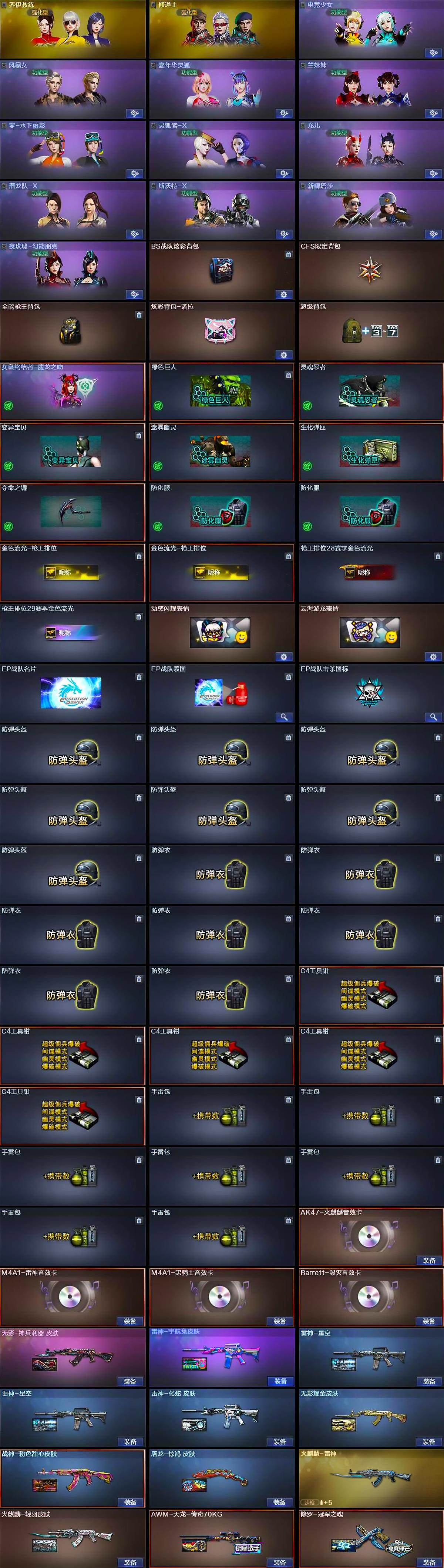 【道具】:BS战队炫彩背包,CFS限定背包,全能枪王背包,炫彩背包-诺拉,超级背包,女皇终结者-魔龙之吻,绿色巨人,灵魂忍者,变异宝贝,迷雾幽灵,生化弹匣,夺命之镰,防化服*2,金色流光-枪王排位*2,枪王排位28赛季金色流光,枪王排位29赛季金色流光,动感闪耀表情,云海游龙表情,EP战队名片,EP战队喷图,EP战队击杀图标,防弹头盔*7,防弹衣*7,C4工具钳*5,手雷包*7
