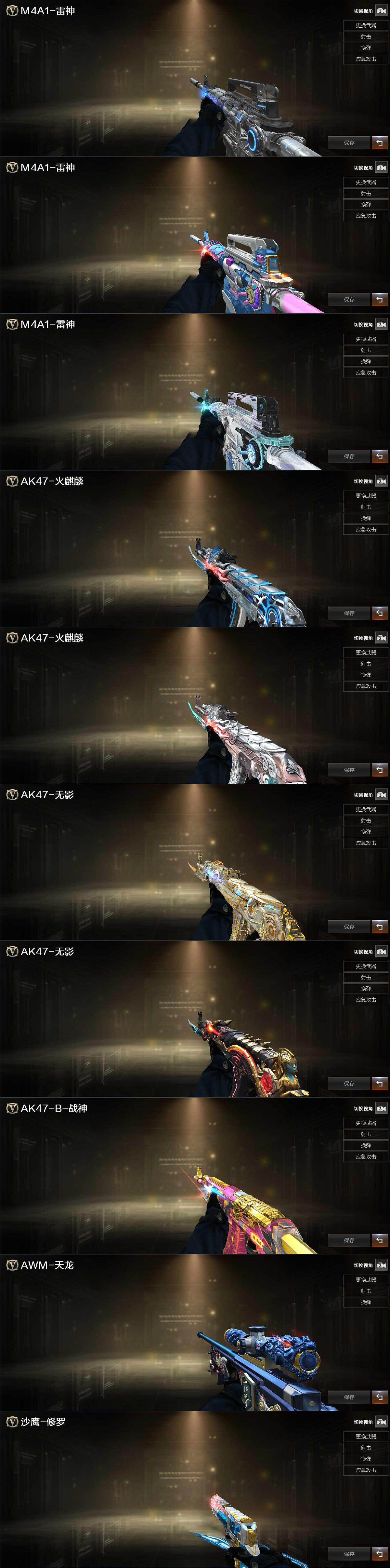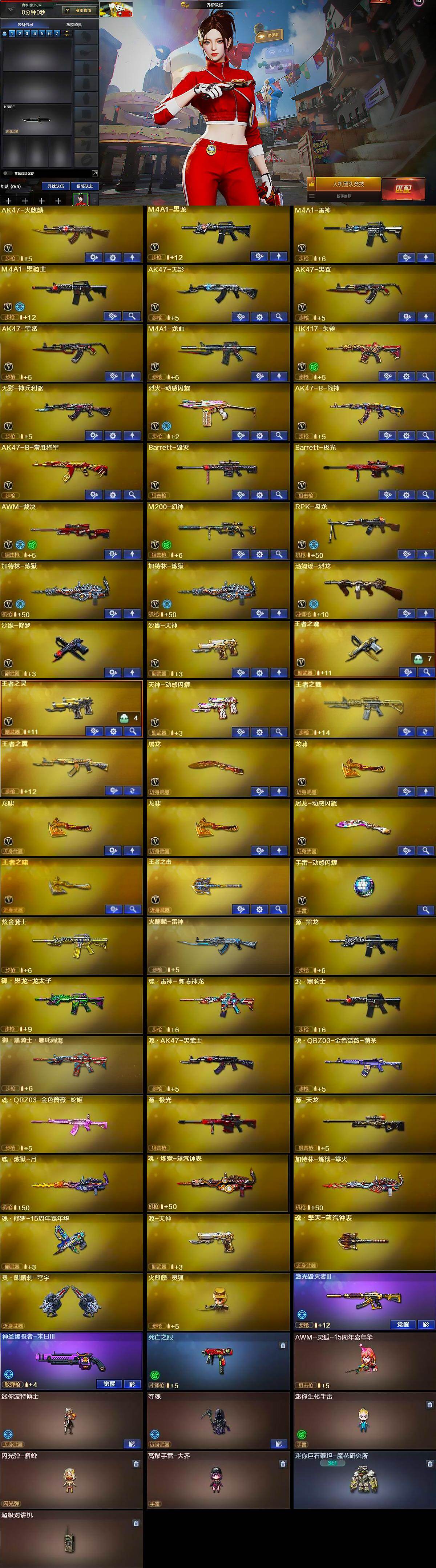 【英雄级武器】:AK47-火麒麟,M4A1-黑龙,M4A1-雷神,M4A1-黑骑士,AK47-无影,AK47-黑鲨*2,M4A1-龙血,HK417-朱雀,无影-神兵利器,烈火-动感闪耀,AK47-B-战神,AK47-B-常胜将军,Barrett-毁灭,Barrett-极光,AWM-裁决,M200-幻神,RPK-盘龙,加特林-炼狱*2,汤姆逊-烈龙,沙鹰-修罗,沙鹰-天神,王者之魂-觉醒版,王者之灵-觉醒版,天神-动感闪耀,屠龙,龙啸*3,屠龙-动感闪耀,王者之啸-觉醒版,王者之击-觉醒版,手雷-动感闪耀