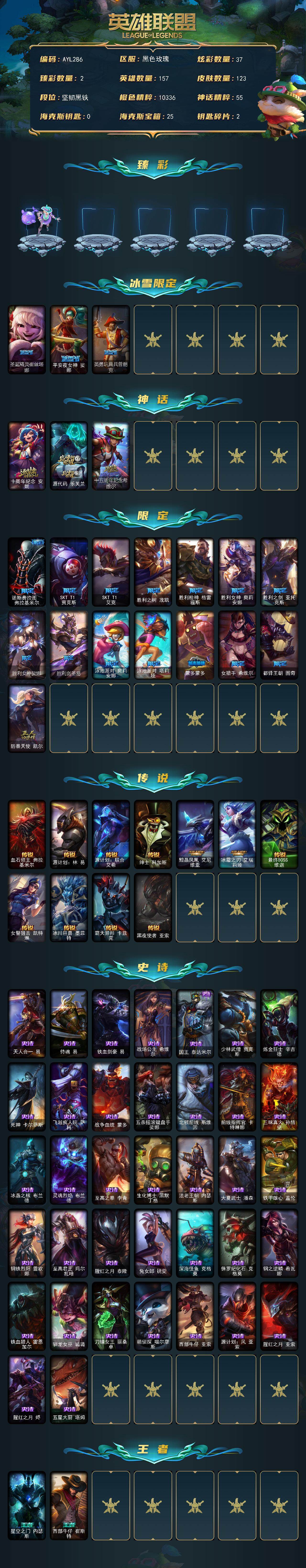 [15467280]【店主推荐捡漏号】未定级段位-157英雄-123皮肤-37炫彩-0终极-3神话-18限定-11传说-37史诗 【臻彩皮肤】:泳池派对奥莉安娜优雅珠光鲸,魔女阿卡丽虚荣 【冰雪限定】:圣诞精灵崔丝塔娜,平安夜女神娑娜,英勇玩具兵普朗克 【神话皮肤】:十周年纪念安妮,源代码乐芙兰,十五周年纪念希维尔 【限定皮肤】:诺斯费拉图弗拉基米尔,SKTT1贾克斯,SKTT1艾克,胜利之树茂凯,胜利枪神格雷福斯,胜利女神奥莉安娜,胜利之剑亚托克斯,胜利女神娑娜,胜利剑圣易,泳池派对奥莉安娜,泳池派对塔莉垭,蒙多蒙多,女猎手希维尔,都铎王朝图奇,防暴天使凯尔 【传说皮肤】:血石领主弗拉基米尔,源计划林易,源计划联合艾希,绅士科加斯,黯晶凤凰艾尼维亚,冰霜之刃艾瑞莉娅,最终BOSS维迦,女警狙击凯特琳,冰川巨兽墨菲特,霸天异形卡兹克,黑夜使者亚索 【史诗皮肤】:天人合一易,侍魂易,铁血剑豪易,战场公主希维尔,国王泰达米尔,少林武僧贾克斯,炼金狂士辛吉德,死神卡尔萨斯,飞越疯人院萨科,战争血统蒙多,五杀摇滚键盘手娑娜,北领前线斯维因,前线指挥官卡特琳娜,三昧真火孙悟空,冰晶之核布兰德,灵魂烈焰布兰德,至高之拳李青,生化博士黑默丁格,法老王朝内瑟斯,大夏武士潘森,铁甲雄心盖伦,钢铁烈阳蕾欧娜,至高君王玛尔扎哈,腥红之月泰隆,兔女郎锐雯,深海怪鱼克格莫,侏罗纪化石克格莫,钢之逆鳞希瓦娜,铁血猎人雷恩加尔,驯龙女巫璐璐,刀锋女王丽桑卓,萌侦探喵尔摩斯,西部牛仔亚索,源计划风亚索,腥红之月亚索,腥红之月烬,五星大厨塔姆 【王者皮肤】:星空之门内瑟斯,西部牛仔崔斯特 【勇士皮肤】:冰河时代奥拉夫,创意工坊黑默丁格 【典藏皮肤】:宗师级锻造训练师 【其他皮肤1】:潮流女王乐芙兰,荒野幽灵费德提克,暗影易,玉剑传说无极,部落精神瑞兹,游击队员崔丝塔娜,梦魇泰达米尔,腥红之月伊芙琳,横行霸道图奇,五杀摇滚主唱卡尔萨斯,尼斯巨兽科加斯,狂欢阿木木,沙之守护拉莫斯,翼龙艾尼维亚,健美教练蒙多,缪斯女神娑娜,老兵普朗克,大力水手普朗克,绿野仙踪维迦,铁锈斑斑布里茨,擂台皇帝布里茨,戴一个表布里茨,暮色枪骑布里茨,幻影梦魔魔腾,荒野之咬雷克顿,银河魔装机神伊莉丝,猎天使魔女薇恩,独眼海盗兰博,沙之守护斯卡纳,单身贵族内瑟斯,乡村农夫古拉加斯,狂热球迷古拉加斯,足球先生伊泽瑞尔,蜂刺阿卡丽,银色闪电凯南,空手道
