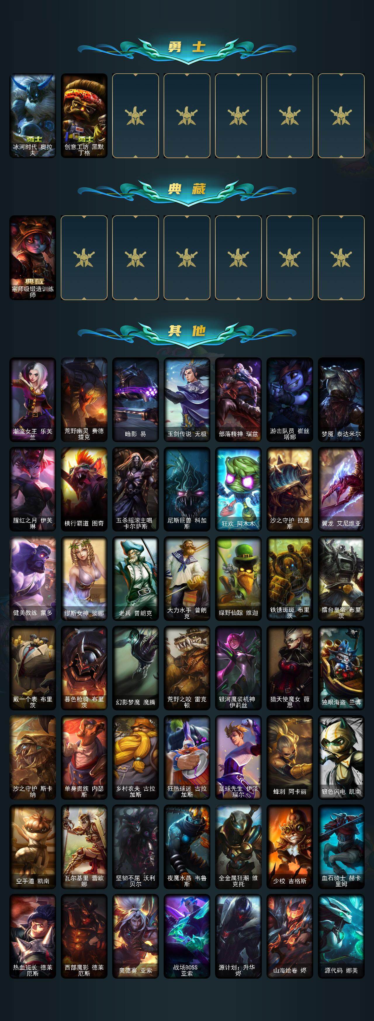 【其他皮肤1】:潮流女王乐芙兰,荒野幽灵费德提克,暗影易,玉剑传说无极,部落精神瑞兹,游击队员崔丝塔娜,梦魇泰达米尔,腥红之月伊芙琳,横行霸道图奇,五杀摇滚主唱卡尔萨斯,尼斯巨兽科加斯,狂欢阿木木,沙之守护拉莫斯,翼龙艾尼维亚,健美教练蒙多,缪斯女神娑娜,老兵普朗克,大力水手普朗克,绿野仙踪维迦,铁锈斑斑布里茨,擂台皇帝布里茨,戴一个表布里茨,暮色枪骑布里茨,幻影梦魔魔腾,荒野之咬雷克顿,银河魔装机神伊莉丝,猎天使魔女薇恩,独眼海盗兰博,沙之守护斯卡纳,单身贵族内瑟斯,乡村农夫古拉加斯,狂热球迷古拉加斯,足球先生伊泽瑞尔,蜂刺阿卡丽,银色闪电凯南,空手道