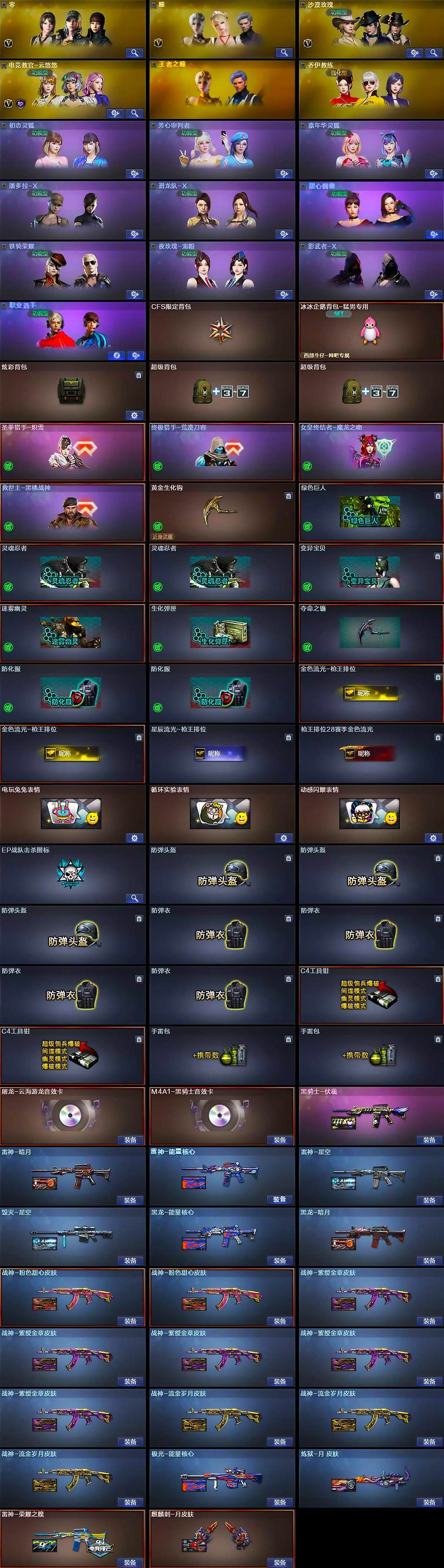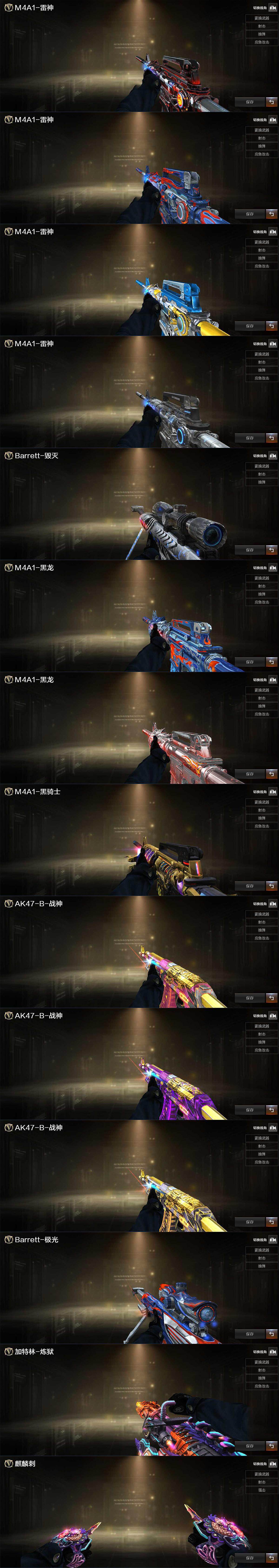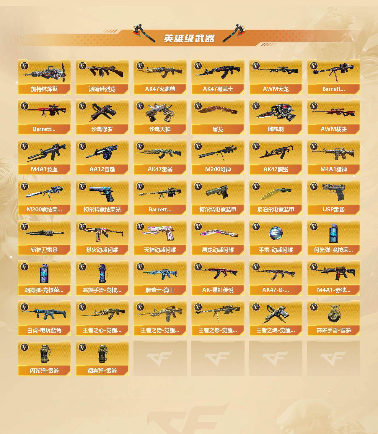 【英雄级武器】:AK47-火麒麟,M4A1-黑龙,M4A1-雷神*2,M4A1-黑骑士,M4A1-死神,AK47-黑武士,AK47-黑鲨,M4A1-龙血,AK47-雷暴,QBZ03-金色蔷薇,M4A1-猎神,烈火-动感闪耀,王者之心-觉醒版,王者之势-觉醒版,AK-47-猩红传说*9,AK47-B-战神,黑骑士-海王,白虎-电玩蓝兔,AWM-天龙,Barrett-毁灭,Barrett-极光,AWM-裁决,M200-幻神,Barrett-电竞装甲,M200-竞技荣光,Barrett-金色蔷薇,王者之怒-觉醒版,加特林-炼狱,汤姆逊-烈龙*6,AA-12-雷霆*3,沙鹰-修罗*2,沙鹰-天神*4,USP-雷暴,柯尔特-电竞装甲,柯尔特-竞技荣光*2,王者之魂-觉醒版,天神-动感闪耀,屠龙*6,麒麟刺,屠龙-动感闪耀,尼泊尔-电竞装甲,斩神刀-雷暴,高爆手雷-雷暴*5,高爆手雷-竞技荣光*3,手雷-动感闪耀,闪光弹-雷暴*5,闪光弹-竞技荣光*3,烟雾弹-雷暴*