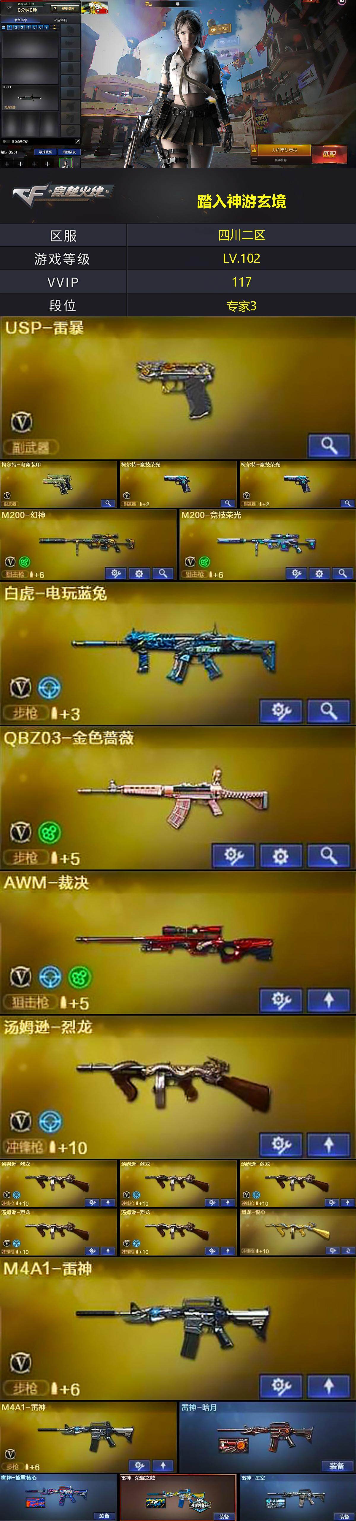 [15267734]四川二区-117V-5王者-3炫金 【热门武器】:QBZ03-金色蔷薇,M200-幻神,M200-竞技荣光,死亡之眼,白虎-电玩蓝兔,C.A.T,毒蜂,M4A1-黑骑士,汤姆逊-烈龙*6,加特林-炼狱,斯泰尔-蝴蝶,火麒麟-绝迹,USP-雷暴,沙鹰-修罗*2 【王者炫金武器】:烈龙-悦心,炫金黑龙,炫金武士,炫金修罗 【音效卡】:屠龙-云海游龙音效卡,M4A1-黑骑士音效卡 【皮肤】:雷神-暗月,雷神-能量核心,雷神-荣耀之魄,雷神-星空,毁灭-星空,黑龙-能量核心,黑龙-暗月,黑骑士-伏羲,战神-粉色甜心皮肤*2,战神-紫绶金章皮肤*5,战神-流金岁月皮肤*3,极光-能量核心,炼狱-月 皮肤,麒麟刺-月皮肤 【角色】:零,瞳,沙漠玫瑰,电竞教官-云悠悠,王者之瞳,乔伊教练,初恋灵狐,芳心审判者,嘉年华灵狐,潘多拉-X,潜龙队-X,甜心偶像,铁骑荣耀,兔囡囡,夜玫瑰-宠粉,影武者-X,职业选手 【人偶武器】:火麒麟-绝迹,火麒麟-灵狐,斯泰尔-蝴蝶,萌兔-斯泰尔,加特林-机械猎手,AWM-灵狐-15周年嘉年华,COP-旗袍,C.A.T,迷你深渊冰龙,迷你裂空之翼,迷你生化手雷*2,生化手雷-机甲核心,闪光弹-小乔,迷你超能女侍 【暴走生化】:毒蜂,双面神*2,死亡之眼,超级对讲机 【挑战大师】:机甲撕裂者III 【英雄级武器】:AK47-火麒麟,M4A1-黑龙,M4A1-雷神*2,M4A1-黑骑士,M4A1-死神,AK47-黑武士,AK47-黑鲨,M4A1-龙血,AK47-雷暴,QBZ03-金色蔷薇,M4A1-猎神,烈火-动感闪耀,王者之心-觉醒版,王者之势-觉醒版,AK-47-猩红传说*9,AK47-B-战神,黑骑士-海王,白虎-电玩蓝兔,AWM-天龙,Barrett-毁灭,Barrett-极光,AWM-裁决,M200-幻神,Barrett-电竞装甲,M200-竞技荣光,Barrett-金色蔷薇,王者之怒-觉醒版,加特林-炼狱,汤姆逊-烈龙*6,AA-12-雷霆*3,沙鹰-修罗*2,沙鹰-天神*4,USP-雷暴,柯尔特-电竞装甲,柯尔特-竞技荣光*2,王者之魂-觉醒版,天神-动感闪耀,屠龙*6,麒麟刺,屠龙-动感闪耀,尼泊尔-电竞装甲,斩神刀-雷暴,高爆手雷-雷暴*5,高爆手雷-竞技荣光*3,手雷-动感闪耀,闪光弹-雷暴*5,闪光弹-竞技荣光*3,烟雾弹-雷暴*