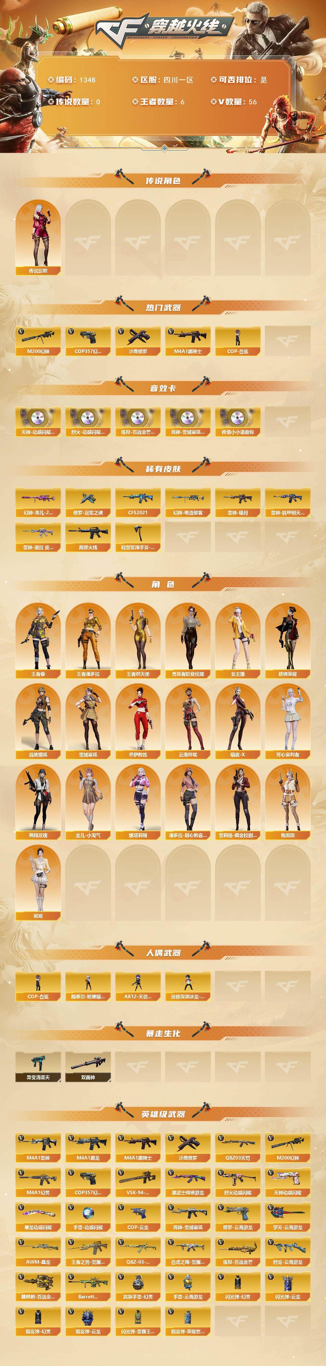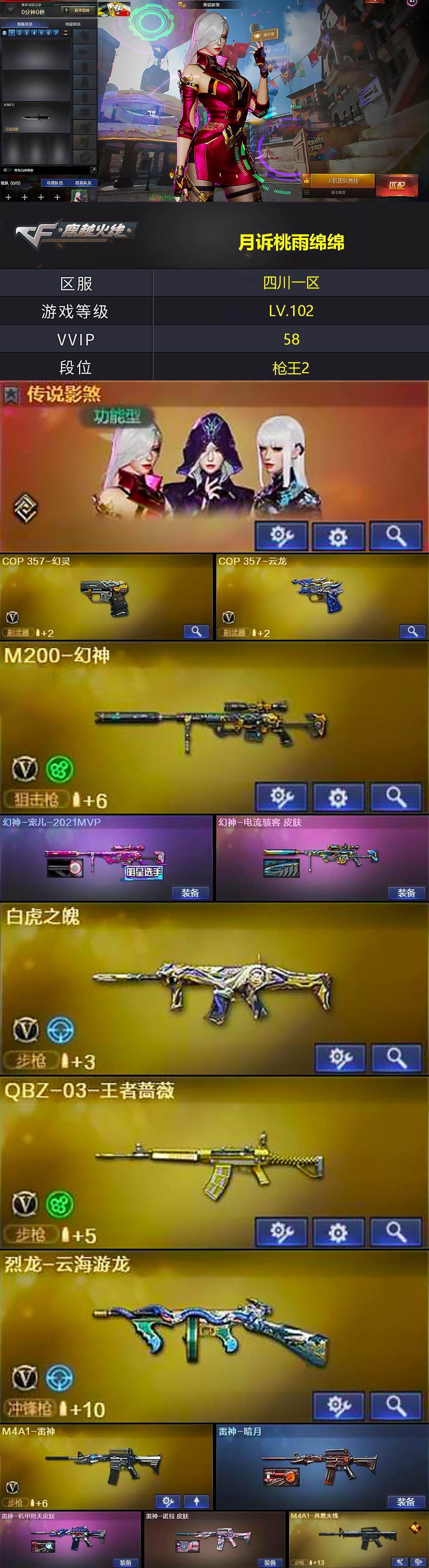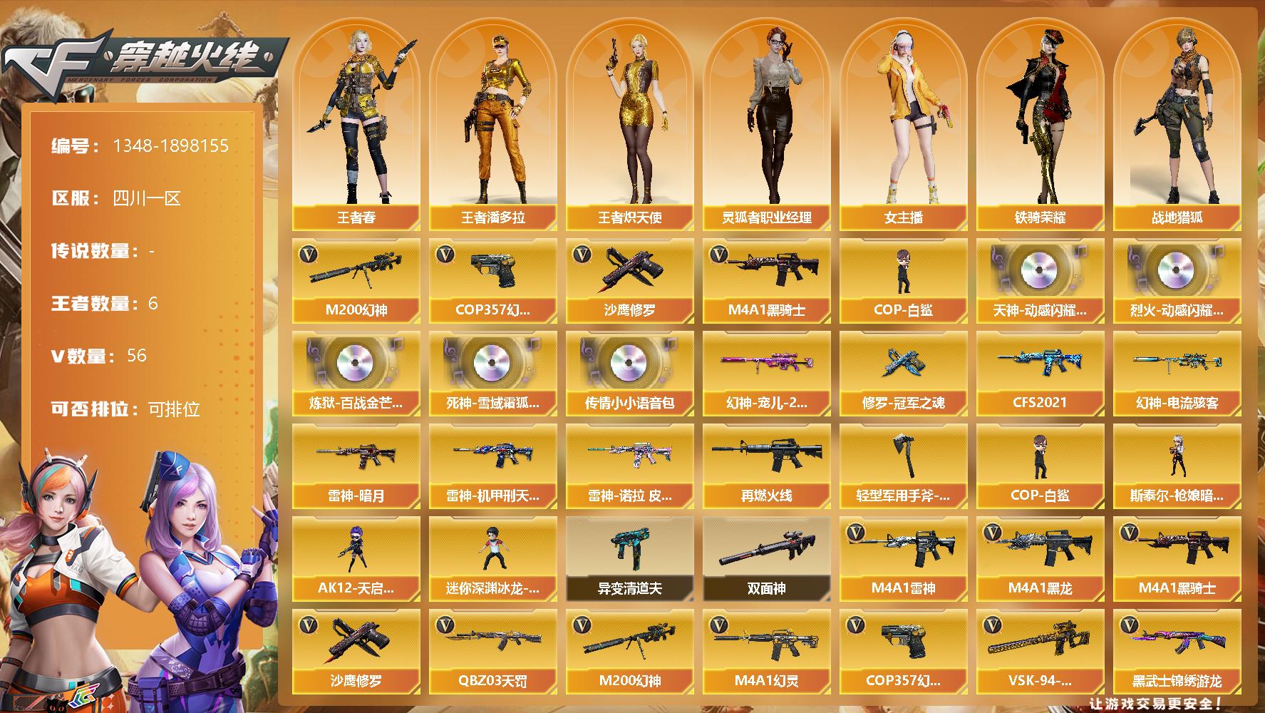 [15475877]四川一区-56V-6王者-0炫金 【传说角色】:传说影煞 【热门武器】:M200-幻神,M4A1-黑骑士,COP-白鲨,COP 357-幻灵,沙鹰-修罗*3 【音效卡】:天神-动感闪耀 音效卡,烈火-动感闪耀 音效卡,炼狱-百战金芒-庆典舞曲音效卡,死神-雪域霜狐-怀旧音效卡,传情小小语音包 【皮肤】:幻神-宠儿-2021MVP,幻神-电流骇客 皮肤,雷神-暗月,雷神-机甲刑天皮肤,雷神-诺拉