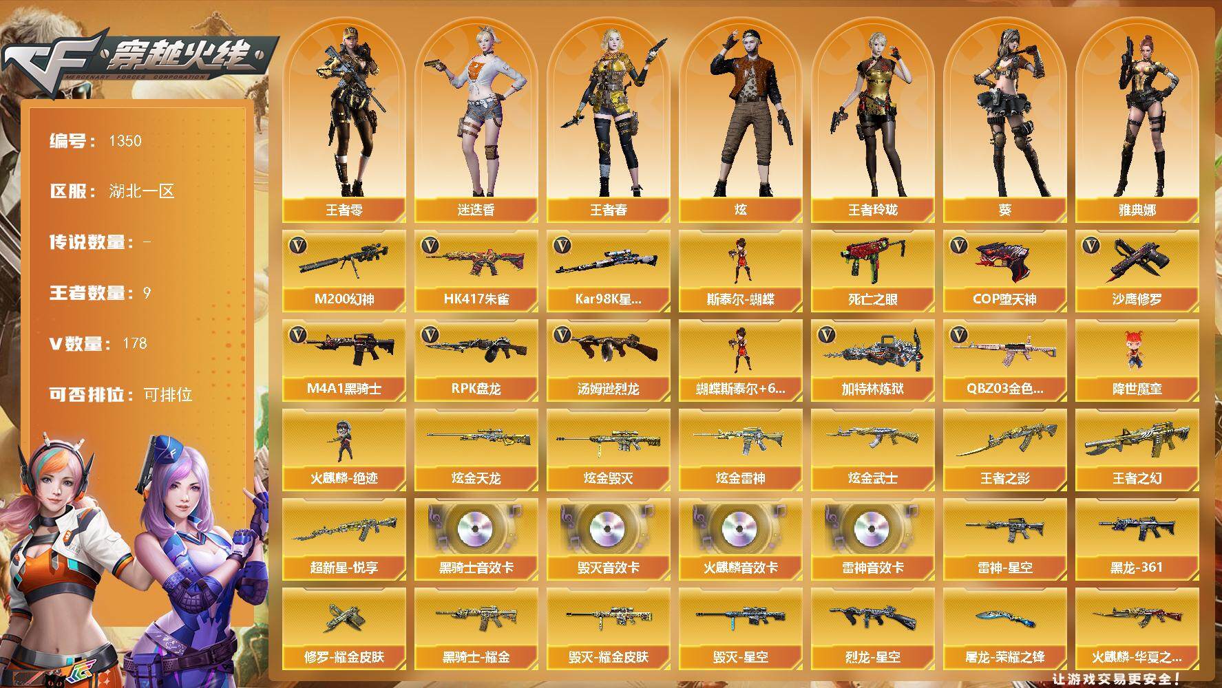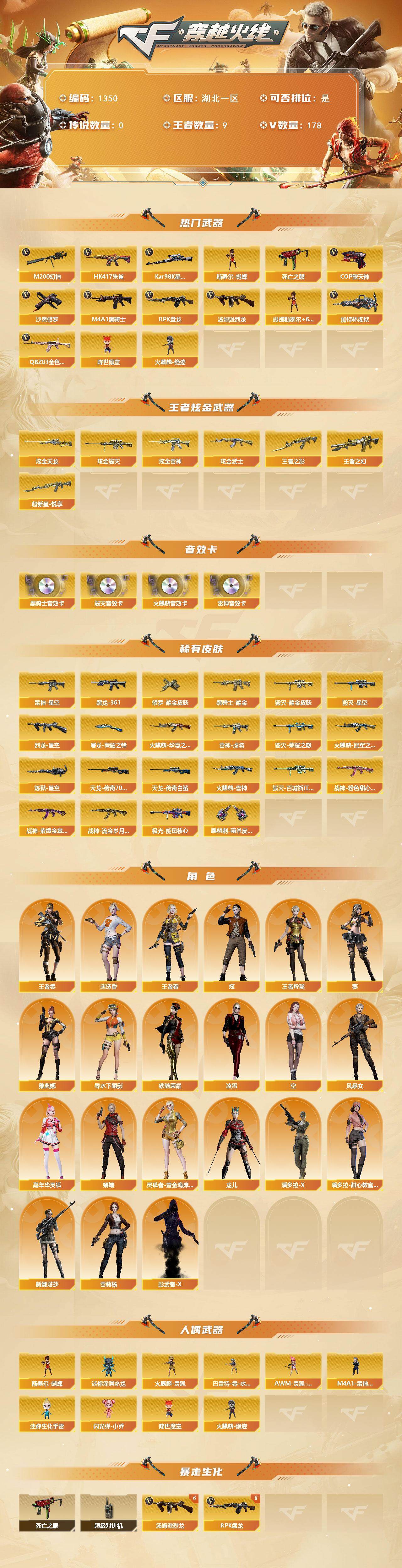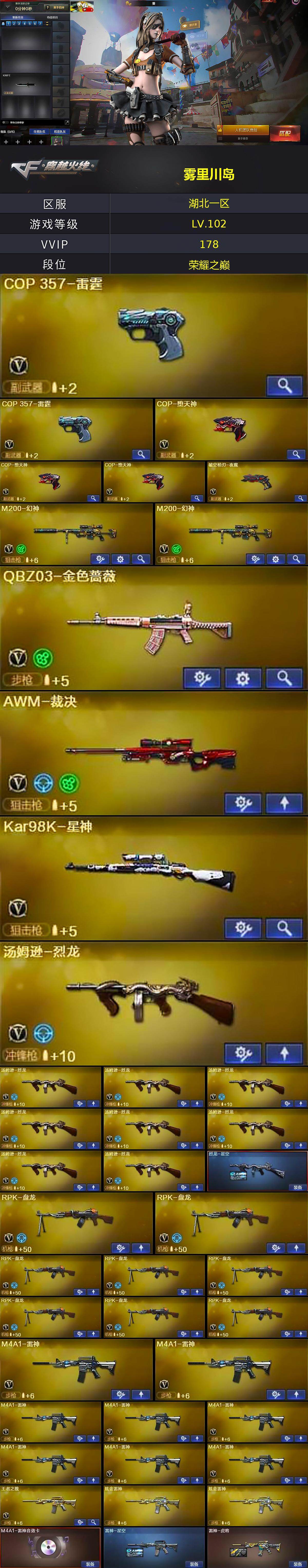 [15235256]湖北一区-178V-9王者-7炫金 【热门武器】:QBZ03-金色蔷薇,HK417-朱雀,M200-幻神*2,死亡之眼,Kar98K-星神,M4A1-黑骑士*3,汤姆逊-烈龙*9,RPK-盘龙*8,加特林-炼狱,斯泰尔-蝴蝶,降世魔童,火麒麟-绝迹,COP-堕天神*3,沙鹰-修罗*5 【王者炫金武器】:超新星-悦享,王者之幻,王者之影,炫金雷神*2,炫金武士,炫金毁灭*3,炫金天龙 【音效卡】:AK47-火麒麟音效卡,M4A1-雷神音效卡,M4A1-黑骑士音效卡,Barrett-毁灭音效卡 【皮肤】:烈龙-星空,雷神-星空,雷神-虎将,火麒麟-雷神*2,火麒麟-冠军之心,火麒麟-华夏之心,毁灭-荣耀之怒,毁灭耀金皮肤,毁灭-星空,毁灭-百城浙江 皮肤,M4A1-黑龙-361,黑骑士耀金皮肤,战神-粉色甜心皮肤*3,战神-紫绶金章皮肤*7,战神-流金岁月皮肤*6,AWM-天龙-传奇70KG,AWM-天龙-传奇白鲨,极光-能量核心,炼狱-星空,修罗耀金皮肤,屠龙-荣耀之锋,麒麟刺-萌杀皮肤 【角色】:葵,炫,迷迭香,凌霄,王者-零,王者春,王者玲珑,空,风暴女*2,嘉年华灵狐,娟娟,零-水下丽影,灵狐者-黄金海岸,龙儿,潘多拉-X,潘多拉-甜心教官,铁骑荣耀,新娜塔莎,雪莉杨,影武者-X,雅典娜 【人偶武器】:火麒麟-绝迹,火麒麟-灵狐,M4A1-雷神-精英刀锋,斯泰尔-蝴蝶,巴雷特-零-水下丽影*3,AWM-灵狐-15周年嘉年华,迷你深渊冰龙,迷你生化手雷*2,闪光弹-小乔,降世魔童 【暴走生化】:死亡之眼,超级对讲机 【挑战大师】:AK47-冰龙粉碎者,VEPR-12-金魔,激光毁灭者III,神圣爆裂者-末日III*2 【英雄级武器】:AK47-火麒麟*2,M4A1-黑龙,M4A1-雷神*8,M4A1-黑骑士*3,M4A1-死神*2,AK47-黑武士,AK12-天启*2,AN94-超新星,M4A1-武圣,AK47-机械迷城*2,AK47-黑鲨,M4A1-龙血*3,M4A1-雷霆,AK47-雷暴,M4A1-堕天神,HK417-朱雀,M4A1-夜魔*3,QBZ03-金色蔷薇,王者之心-觉醒版,王者之魄-觉醒版,王者之势-觉醒版,王者之幻-觉醒版,AK-47-猩红传说*10,AK47-B-战神,AWM-天龙,Barrett-毁灭*2,Barrett-极光,AWM-裁决,