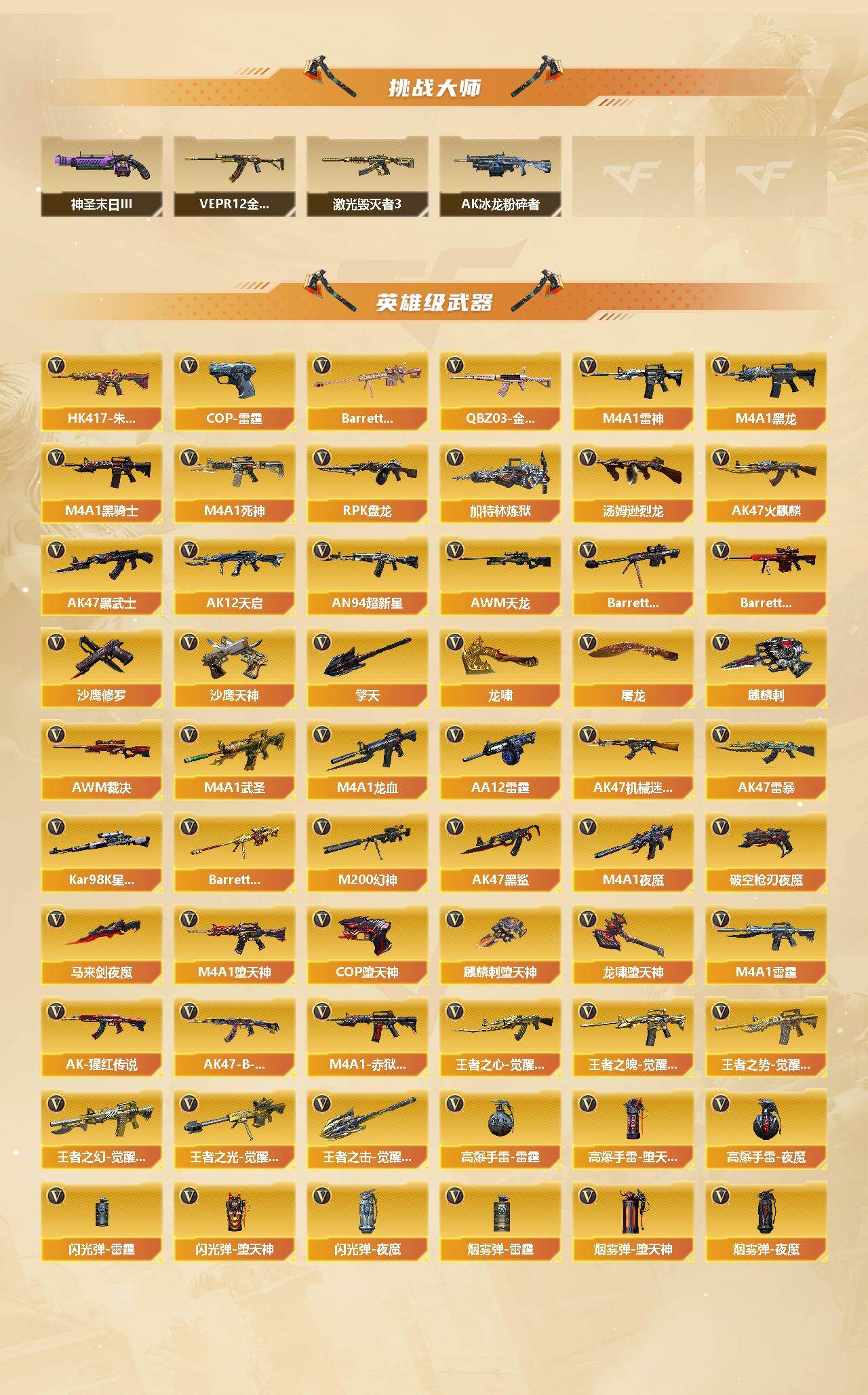 【英雄级武器】:AK47-火麒麟*2,M4A1-黑龙,M4A1-雷神*8,M4A1-黑骑士*3,M4A1-死神*2,AK47-黑武士,AK12-天启*2,AN94-超新星,M4A1-武圣,AK47-机械迷城*2,AK47-黑鲨,M4A1-龙血*3,M4A1-雷霆,AK47-雷暴,M4A1-堕天神,HK417-朱雀,M4A1-夜魔*3,QBZ03-金色蔷薇,王者之心-觉醒版,王者之魄-觉醒版,王者之势-觉醒版,王者之幻-觉醒版,AK-47-猩红传说*10,AK47-B-战神,AWM-天龙,Barrett-毁灭*2,Barrett-极光,AWM-裁决,