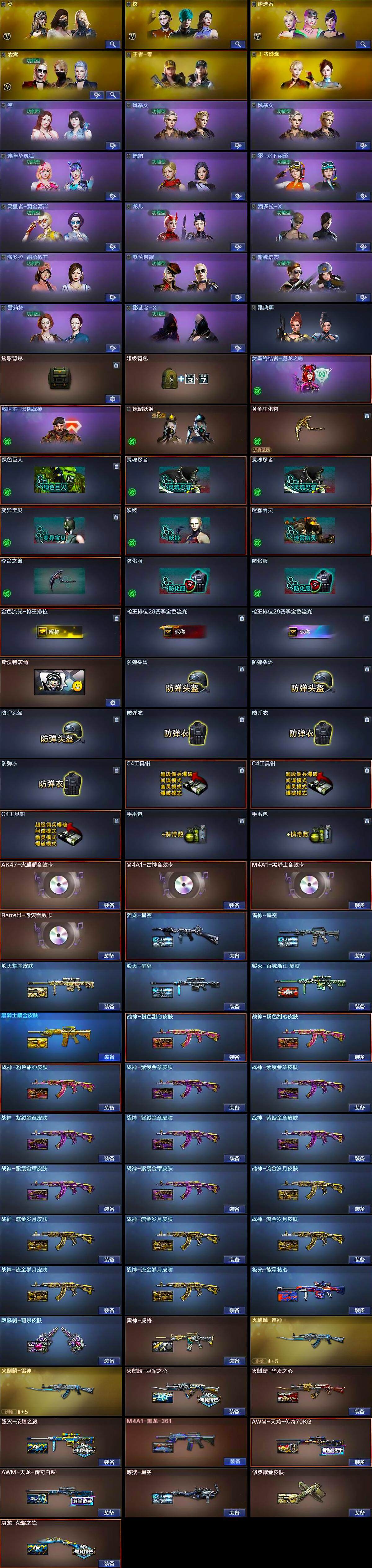 【皮肤】:烈龙-星空,雷神-星空,雷神-虎将,火麒麟-雷神*2,火麒麟-冠军之心,火麒麟-华夏之心,毁灭-荣耀之怒,毁灭耀金皮肤,毁灭-星空,毁灭-百城浙江 皮肤,M4A1-黑龙-361,黑骑士耀金皮肤,战神-粉色甜心皮肤*3,战神-紫绶金章皮肤*7,战神-流金岁月皮肤*6,AWM-天龙-传奇70KG,AWM-天龙-传奇白鲨,极光-能量核心,炼狱-星空,修罗耀金皮肤,屠龙-荣耀之锋,麒麟刺-萌杀皮肤