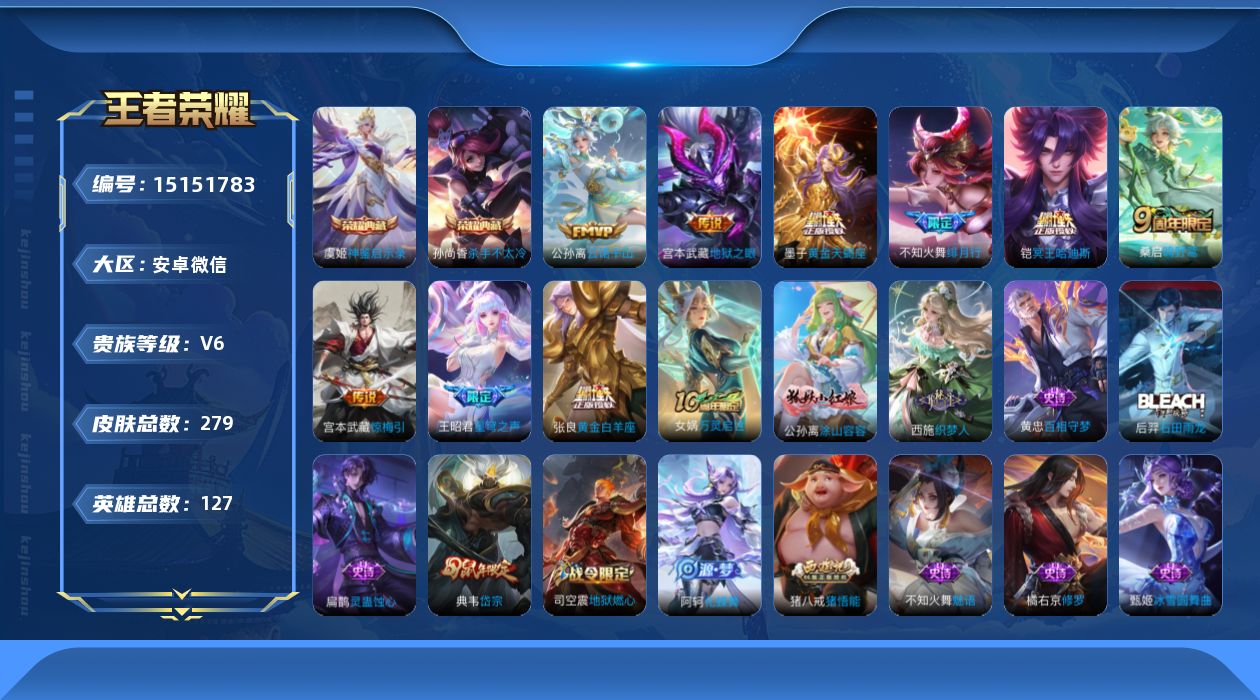 [15151783]安卓WX-V6-至尊星耀II段位-127英雄-279皮肤-2典藏皮肤-10传说-67史诗