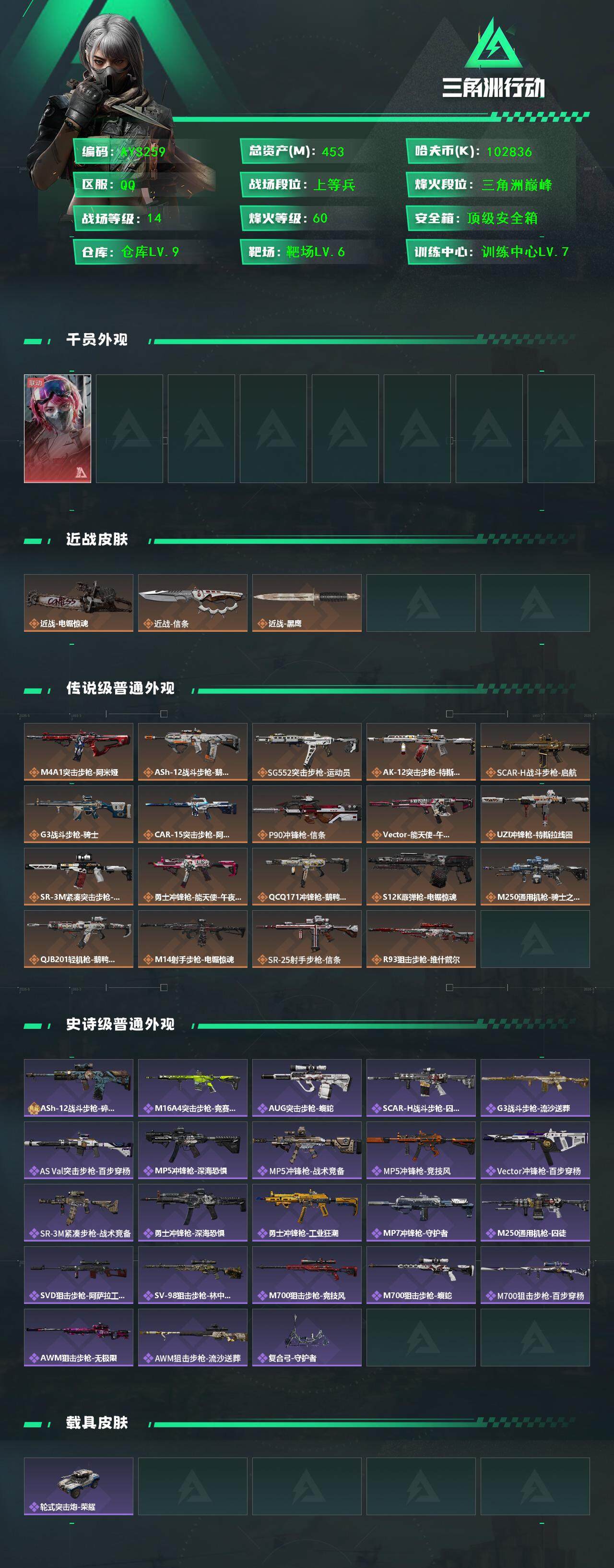 [15478753]453m总资产-102836k哈伏币-60烽火等级-三角洲巅峰-14战场等级-上等兵 【干员外观】:蛊-能天使午夜邮差 【近战皮肤】:近战-电锯惊魂,近战-信条,近战-黑鹰 【传说外观】:M4A1突击步枪-阿米娅,ASh-12战斗步枪-鹅鸭杀,SG552突击步枪-运动员,AK-12突击步枪-特斯拉线圈,SCAR-H战斗步枪-启航,G3战斗步枪-骑士,CAR-15突击步枪-阿米娅,P90冲锋枪-信条,Vector冲锋枪-能天使-午夜邮差,UZI冲锋枪-特斯拉线圈,SR-3M紧凑突击步枪-特斯拉线圈,勇士冲锋枪-能天使-午夜邮差,QCQ171冲锋枪-鹅鸭杀,S12K霰弹枪-电锯惊魂,M250通用机枪-骑士之心,QJB201轻机枪-鹅鸭杀,M14射手步枪-电锯惊魂,SR-25射手步枪-信条,R93狙击步枪-维什戴尔 【史诗外观】:ASh-12战斗步枪-碎冰行动,M16A4突击步枪-竞赛选手,AUG突击步枪-蝮蛇,SCAR-H战斗步枪-囚徒,G3战斗步枪-流沙送葬,AS Val突击步枪-百步穿杨,MP5冲锋枪-深海恐惧,MP5冲锋枪-战术竞备,MP5冲锋枪-竞技风,Vector冲锋枪-百步穿杨,SR-3M紧凑突击步枪-战术竞备,勇士冲锋枪-深海恐惧,勇士冲锋枪-工业狂潮,MP7冲锋枪-守护者,M250通用机枪-囚徒,SVD狙击步枪-阿萨拉工艺,SV-98狙击步枪-林中猎手,M700狙击步枪-竞技风,M700狙击步枪-蝮蛇,M700狙击步枪-百步穿杨,AWM狙击步枪-无极限,AWM狙击步枪-流沙送葬,复合弓-守护者 【稀有外观】:M249轻机枪-青纹,UZI冲锋枪-旧梦,K437突击步枪-巨兽*2,M4A1突击步枪-繁盛,AKM突击步枪-肃杀,QBZ95-1突击步枪-公平竞技,ASh-12战斗步枪-繁盛,SCAR-H战斗步枪-荣耀列队,SCAR-H战斗步枪-黄昏,G3战斗步枪-战术演练,G3战斗步枪-主宰,PTR-32突击步枪-天网,腾龙突击步枪-前沿科技,MP5冲锋枪-弄臣,MP5冲锋枪-虎啸,MP5冲锋枪-哈夫克卫队,Vector冲锋枪-先锋,UZI冲锋枪-亚特兰蒂斯,SMG-45冲锋枪-前沿科技,SMG-45-行动开启,SMG-45冲锋枪-幻影结构,勇士冲锋枪-主宰,勇士冲锋枪-冰天雪地,S12K霰弹枪-战术演练,M250通用机枪-天网,QJB201轻机枪-黄昏,QJ