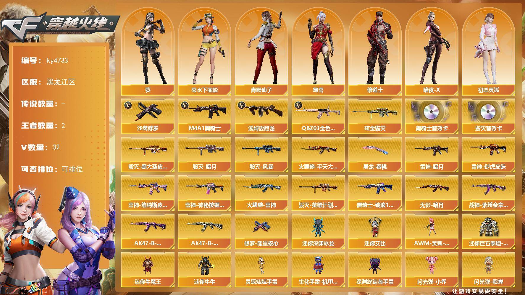 [15423208]黑龙江区-32V-2王者-1炫金 【热门武器】:QBZ03-金色蔷薇,M4A1-黑骑士,汤姆逊-烈龙,沙鹰-修罗 【王者炫金武器】:炫金毁灭 【音效卡】:M4A1-黑骑士音效卡,Barrett-毁灭音效卡 【皮肤】:雷神-暗月,雷神-烈虎皮肤,雷神-维纳斯皮肤,雷神-神秘按键 皮肤,火麒麟-雷神,火麒麟-平天大圣,毁灭-暗月,毁灭-黑大圣皮肤,毁灭-风暴,毁灭-英雄计划 皮肤,黑骑士-破浪10年皮肤,无影-暗月,战神-紫绶金章皮肤*2,AK47-B-常胜将军-曹操*2,AK47-B-常胜将军-刘备*2,修罗-能量核心,屠龙-春桃 皮肤 【角色】:葵,修道士,暗夜-X,初恋灵狐,电竞少女,风暴女*2,虎妞,嘉年华灵狐,娟娟,兰-新年限定,猎狐者-追月,零-水下丽影,灵狐-花神,灵狐者-X,龙儿,曼陀罗-礼服,潘多拉-甜心教官,潜龙队-X,邱刚敖,青霞仙子,蜀雪,铁骑-乘风破浪,维纳斯,雪莉杨,雪莉杨-摸金校尉,夜玫瑰-幻能朋克,影武者-X,智影 【人偶武器】:AWM-灵狐-15周年嘉年华*3,迷你深渊冰龙,迷你牛魔王,迷你牛牛*2,生化手雷-机甲核心,深渊终结者手雷,闪光弹-小乔,闪光弹-貂蝉,迷你艾比,迷你巨石泰坦-魔花研究所,灵狐娃娃手雷 【暴走生化】:超级对讲机 【挑战大师】:冰龙粉碎者-白马银枪*2,激光毁灭者III-白马银枪*2,神圣爆裂者-末日III 【英雄级武器】:AK47-火麒麟,M4A1-雷神,M4A1-黑骑士,AN94-超新星,无影-神兵利器,QBZ03-金色蔷薇,AK-47-猩红传说,AK47-B-战神,黑骑士-海王,AK47-B-常胜将军,AWM-天龙,Barrett-毁灭,王者之怒-觉醒版,王者之光-觉醒版,汤姆逊-烈龙,沙鹰-修罗,沙鹰-天神,破空枪刃-夜魔,屠龙*2,龙啸,马来剑-夜魔,擎天*2,麒麟刺,高爆手雷-夜魔,闪光弹-夜魔,烟雾弹-夜魔 【道具】:XROCK炫彩背包,云山科技背包,亚洲杯纪念炫彩背包,战舰背包,炫彩背包,超级背包,女皇终结者-魔龙之吻,绿色巨人,灵魂忍者,迷雾幽灵,夺命之镰,防化服*3,金色流光-枪王排位*2,星辰流光-枪王排位,枪王排位29赛季金色流光,防弹头盔*8,防弹衣*8,C4工具钳*8,手雷包*8 【特殊枪械】:1黑骑士,1烈龙