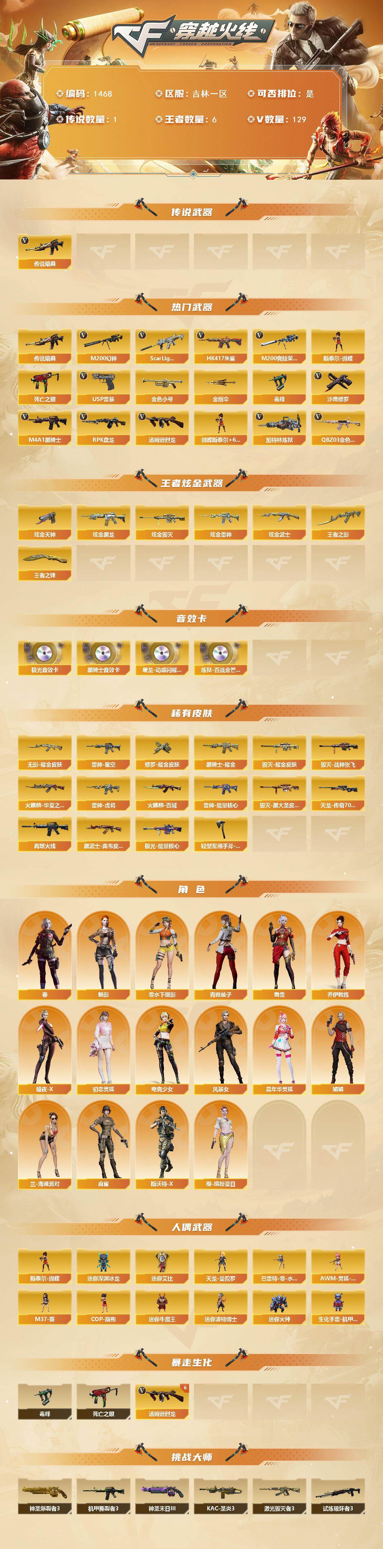 [15480342]吉林一区-129V-6王者-6炫金 【传说武器】:传说暗裔 【热门武器】:传说暗裔,QBZ03-金色蔷薇,Scar Light-白虎*2,HK417-朱雀,M200-幻神,M200-竞技荣光,死亡之眼,金色小号,毒蜂,M4A1-黑骑士*4,汤姆逊-烈龙*7,RPK-盘龙*4,加特林-炼狱*3,斯泰尔-蝴蝶,USP-雷暴,沙鹰-修罗*4,金刚伞 【王者炫金武器】:王者之影,王者之锋*2,炫金黑龙,炫金雷神,炫金武士,炫金毁灭*2,炫金天神 【音效卡】:屠龙-动感闪耀 音效卡,M4A1-黑骑士音效卡,Barrett-极光音效卡*2,炼狱-百战金芒-庆典舞曲音效卡 【皮肤】:雷神-能量核心*4,雷神-星空,雷神-虎将*2,M4A1-再燃火线,火麒麟-华夏之心,火麒麟-百城,毁灭耀金皮肤,毁灭-战神张飞,毁灭-黑大圣皮肤,黑骑士耀金皮肤*2,无影耀金皮肤*2,黑武士-典韦皮肤,AWM-天龙-传奇70KG,极光-能量核心,修罗耀金皮肤,轻型军用手斧-再燃火线 【角色】:魅影,春,乔伊教练,暗夜-X,初恋灵狐,电竞少女,风暴女,嘉年华灵狐,娟娟,兰-海滩派对,零-水下丽影,麻雀,青霞仙子,斯沃特-X,蜀雪,樱-缤纷夏日 【人偶武器】:天龙-曼陀罗,斯泰尔-蝴蝶,巴雷特-零-水下丽影,AWM-灵狐-15周年嘉年华,M37-葵,COP-旗袍,迷你深渊冰龙,迷你牛魔王,迷你波特博士*3,迷你火种*2,生化手雷-机甲核心*2,迷你艾比 【暴走生化】:毒蜂,死亡之眼 【挑战大师】:火狱乱世-超越Max,神圣爆裂者III,AK47-冰龙粉碎者,冰龙粉碎者-白马银枪*2,激光毁灭者III,机甲撕裂者III*2,试炼破坏者III,KAC-圣炎切割者III*2,神圣爆裂者-末日III,阐释者III*2 【英雄级武器】:AK47-火麒麟*6,M4A1-黑龙*2,M4A1-雷神*3,M4A1-黑骑士*4,AK47-黑武士*3,AK12-天启*2,AN94-超新星,M4A1-武圣*3,AK47-黑鲨*2,M4A1-龙血*4,AK47-雷暴,HK417-朱雀,Scar Light-白虎*2,无影-神兵利器,QBZ03-金色蔷薇,M4A1-猎神*2,烈火-动感闪耀,AWM-天龙,Barrett-毁灭,Barrett-极光,AWM-裁决,M200-幻神,M200-竞技荣光,Barrett-金色蔷薇*5,R