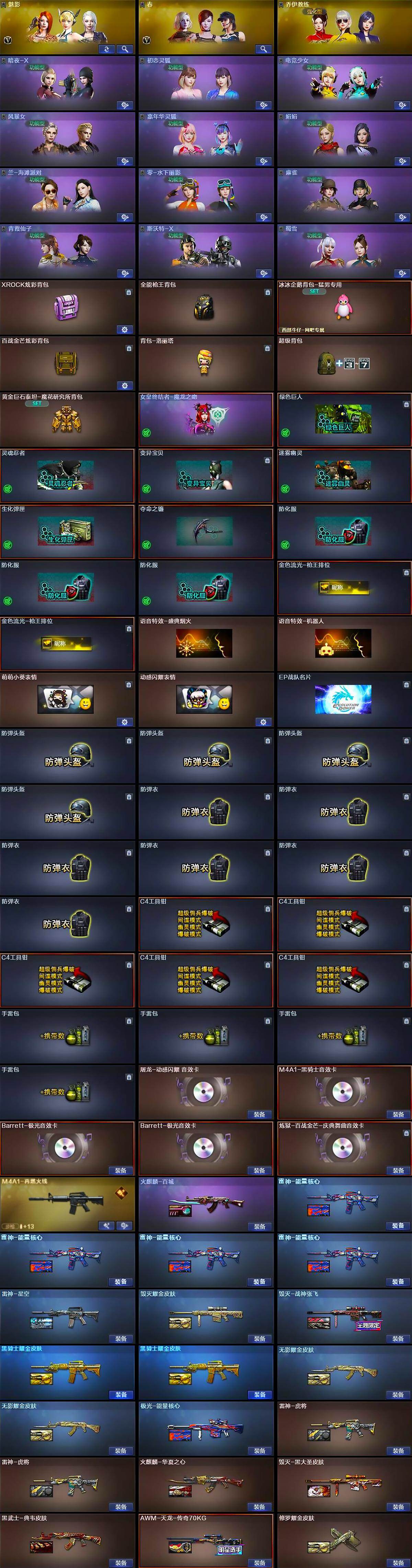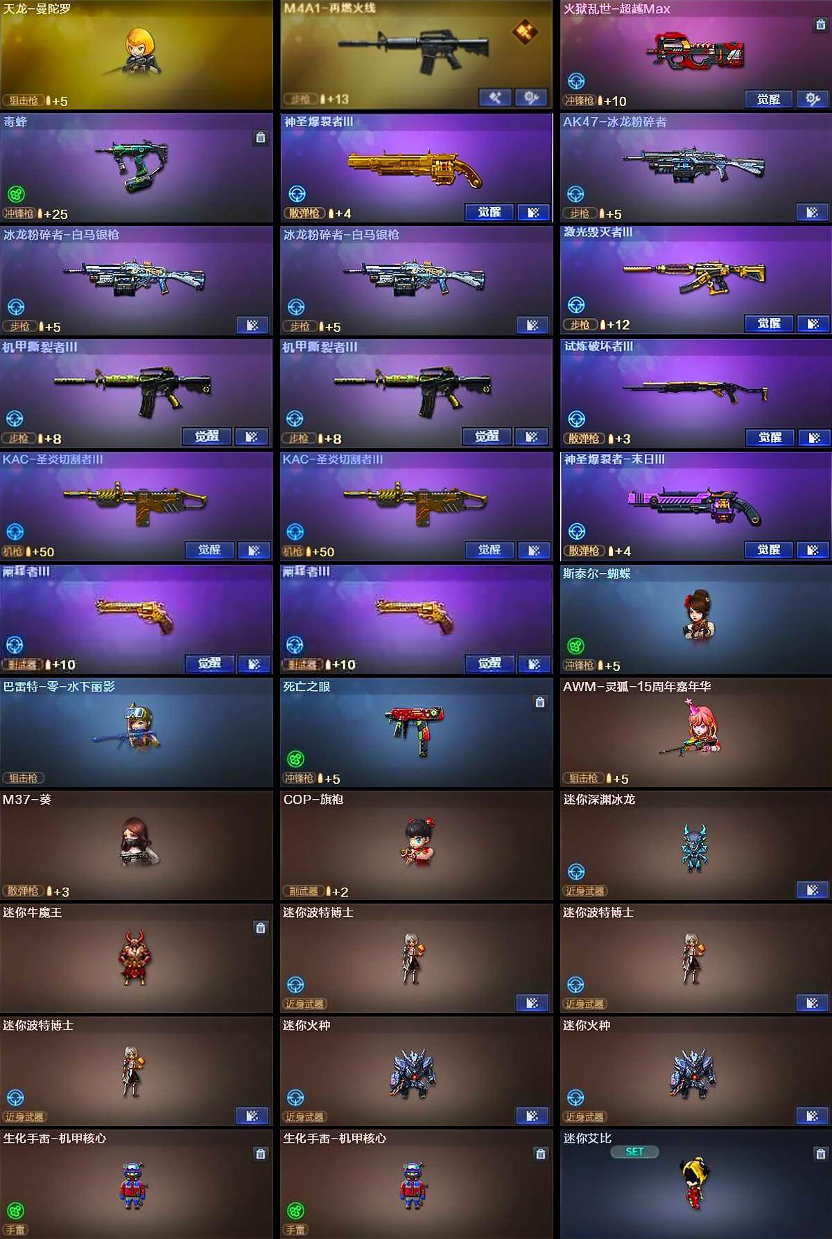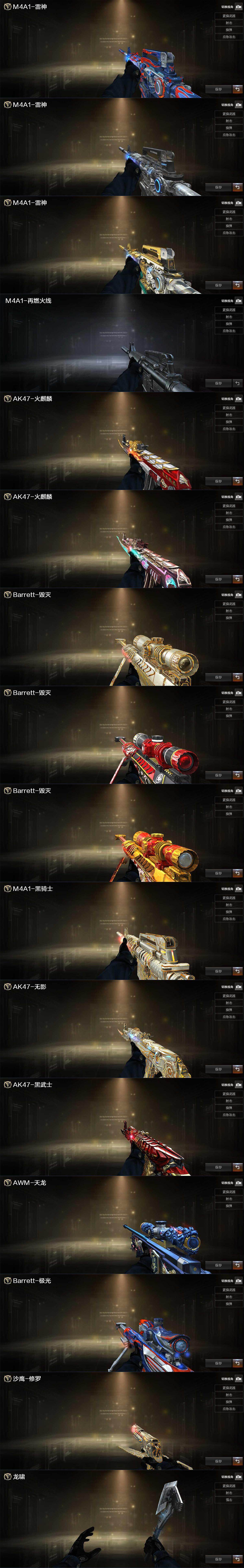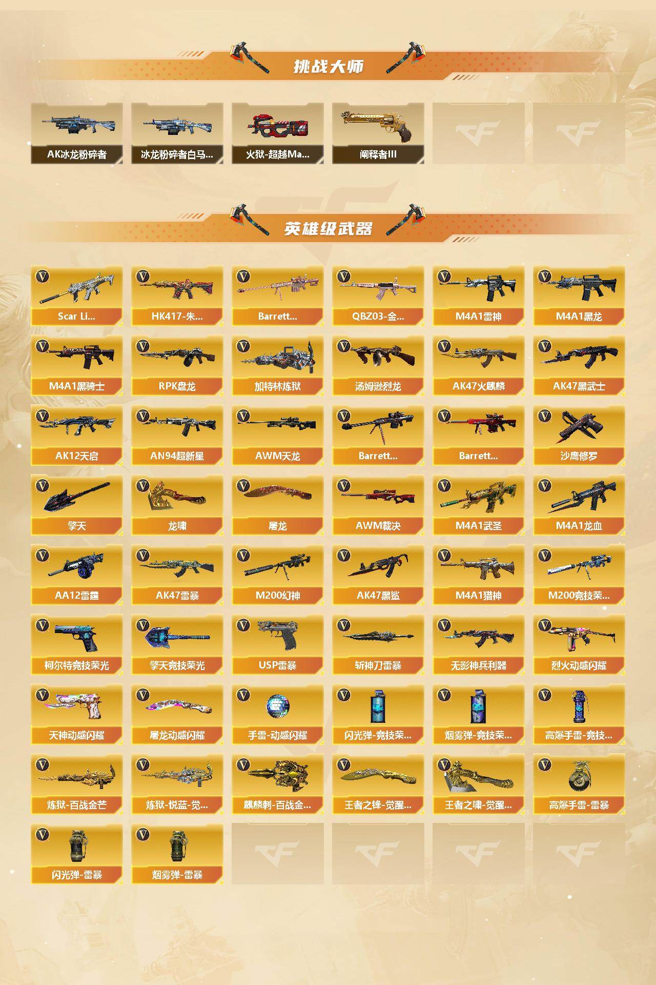 【英雄级武器】:AK47-火麒麟*6,M4A1-黑龙*2,M4A1-雷神*3,M4A1-黑骑士*4,AK47-黑武士*3,AK12-天启*2,AN94-超新星,M4A1-武圣*3,AK47-黑鲨*2,M4A1-龙血*4,AK47-雷暴,HK417-朱雀,Scar Light-白虎*2,无影-神兵利器,QBZ03-金色蔷薇,M4A1-猎神*2,烈火-动感闪耀,AWM-天龙,Barrett-毁灭,Barrett-极光,AWM-裁决,M200-幻神,M200-竞技荣光,Barrett-金色蔷薇*5,R
