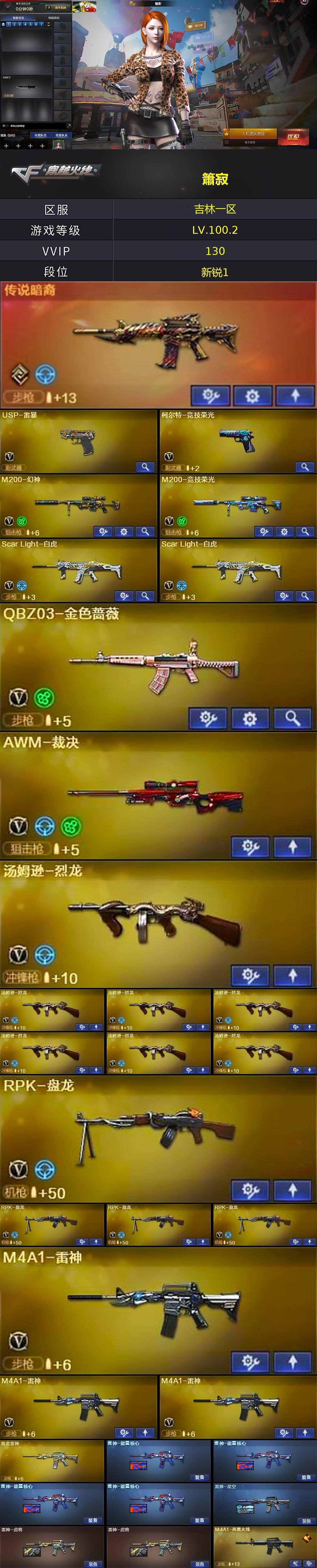 【热门武器】:传说暗裔,QBZ03-金色蔷薇,Scar Light-白虎*2,HK417-朱雀,M200-幻神,M200-竞技荣光,死亡之眼,金色小号,毒蜂,M4A1-黑骑士*4,汤姆逊-烈龙*7,RPK-盘龙*4,加特林-炼狱*3,斯泰尔-蝴蝶,USP-雷暴,沙鹰-修罗*4,金刚伞