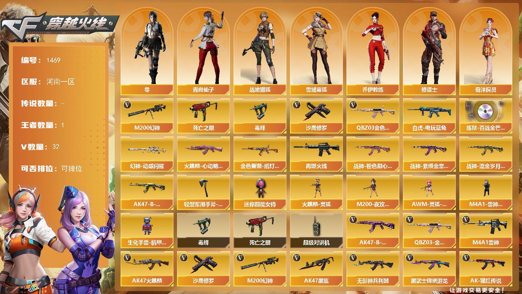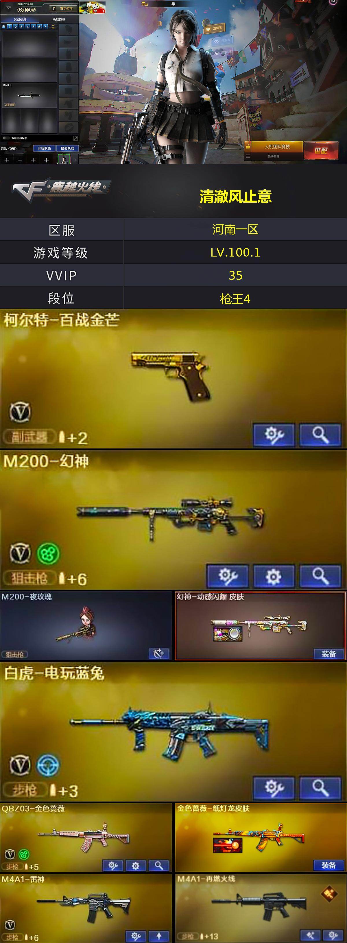 [15480500]河南一区-32V-1王者-0炫金 【热门武器】:QBZ03-金色蔷薇,M200-幻神,死亡之眼,白虎-电玩蓝兔,毒蜂,沙鹰-修罗 【音效卡】:炼狱-百战金芒-庆典舞曲音效卡 【皮肤】:幻神-动感闪耀 皮肤,金色蔷薇-纸灯龙皮肤,M4A1-再燃火线,火麒麟-心动糖果,战神-粉色甜心皮肤*2,战神-紫绶金章皮肤,战神-流金岁月皮肤*2,AK47-B-常胜将军-孙权,轻型军用手斧-再燃火线 【角色】