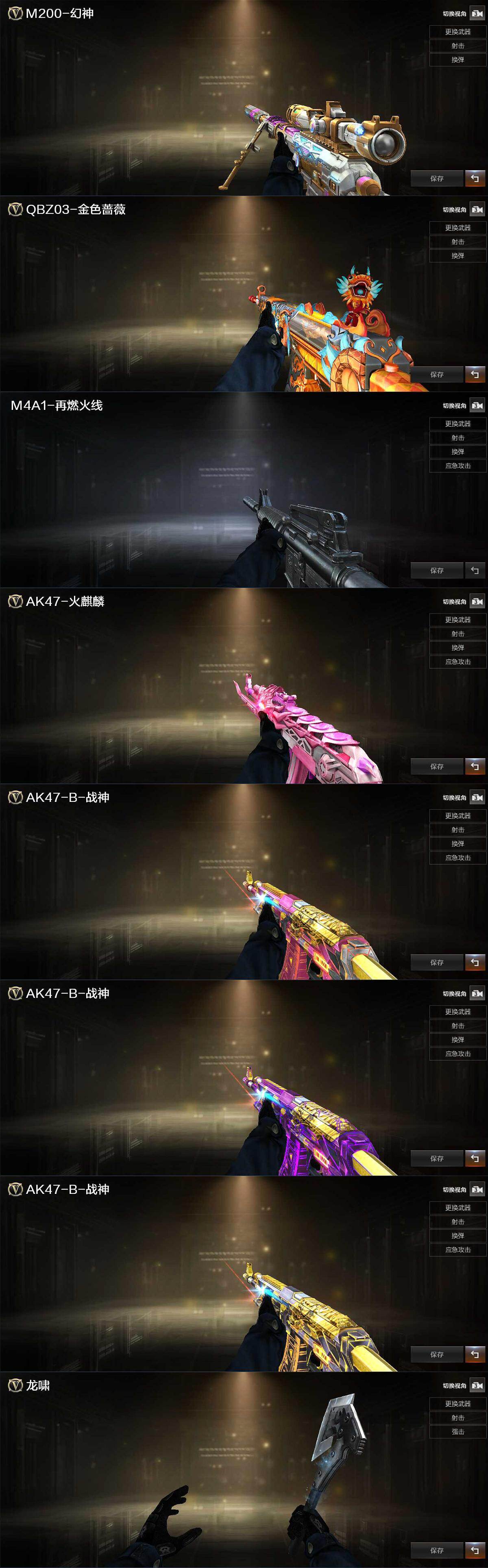 【皮肤】:幻神-动感闪耀 皮肤,金色蔷薇-纸灯龙皮肤,M4A1-再燃火线,火麒麟-心动糖果,战神-粉色甜心皮肤*2,战神-紫绶金章皮肤,战神-流金岁月皮肤*2,AK47-B-常胜将军-孙权,轻型军用手斧-再燃火线