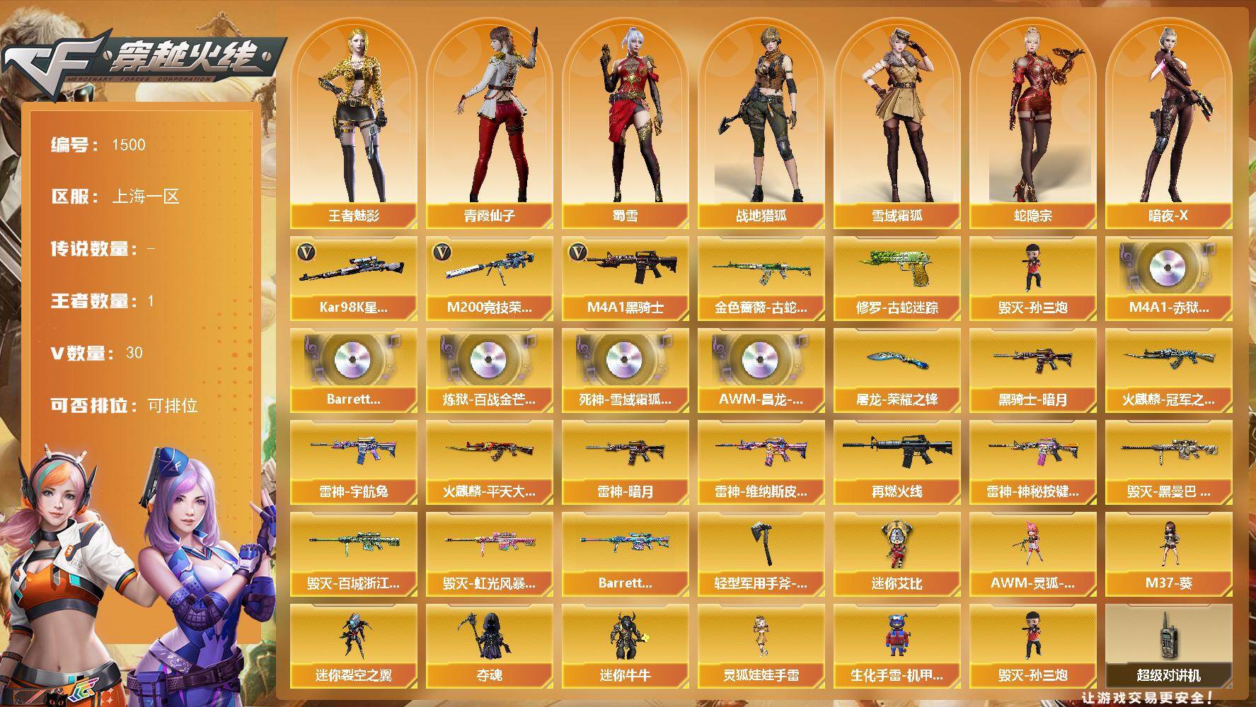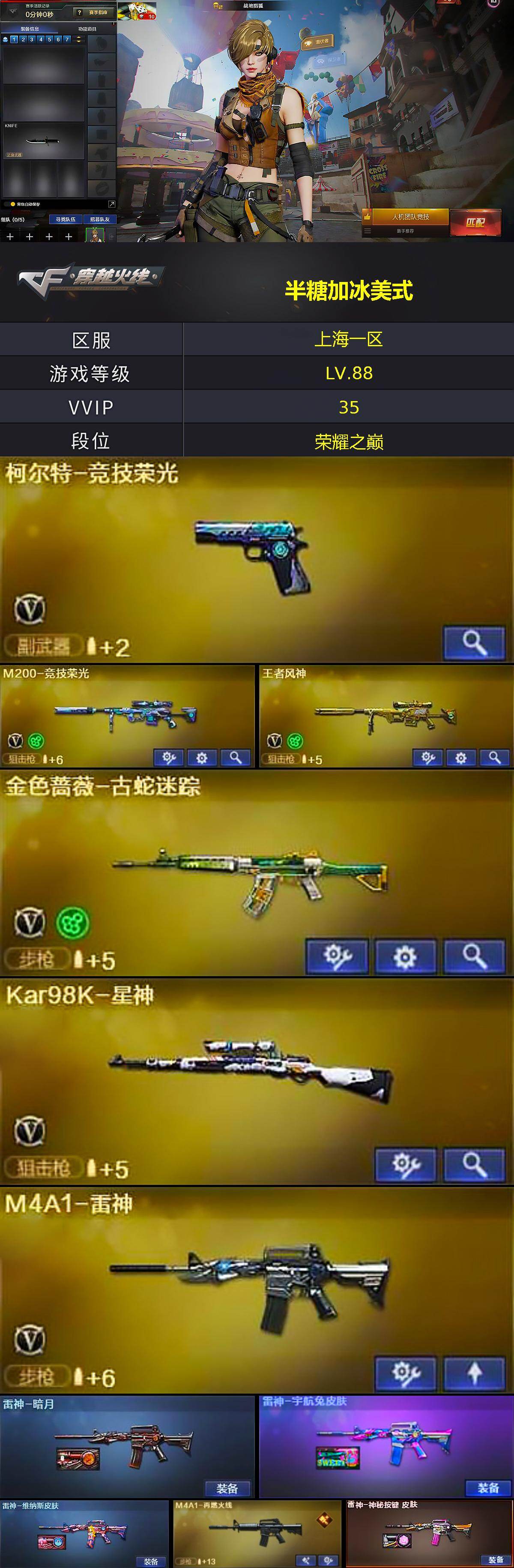 [15481453]上海一区-30V-1王者-0炫金 【热门武器】:金色蔷薇-古蛇迷踪,修罗-古蛇迷踪,M200-竞技荣光,Kar98K-星神,M4A1-黑骑士,毁灭-孙三炮 【音效卡】:M4A1-赤狱骑士-怀旧音效卡,Barrett-碧霄极光音效卡,炼狱-百战金芒-庆典舞曲音效卡,死神-雪域霜狐-怀旧音效卡,AWM-昌龙-怀旧音效卡 【皮肤】:雷神-暗月,雷神-宇航兔皮肤,雷神-维纳斯皮肤,M4A1-再燃火线,